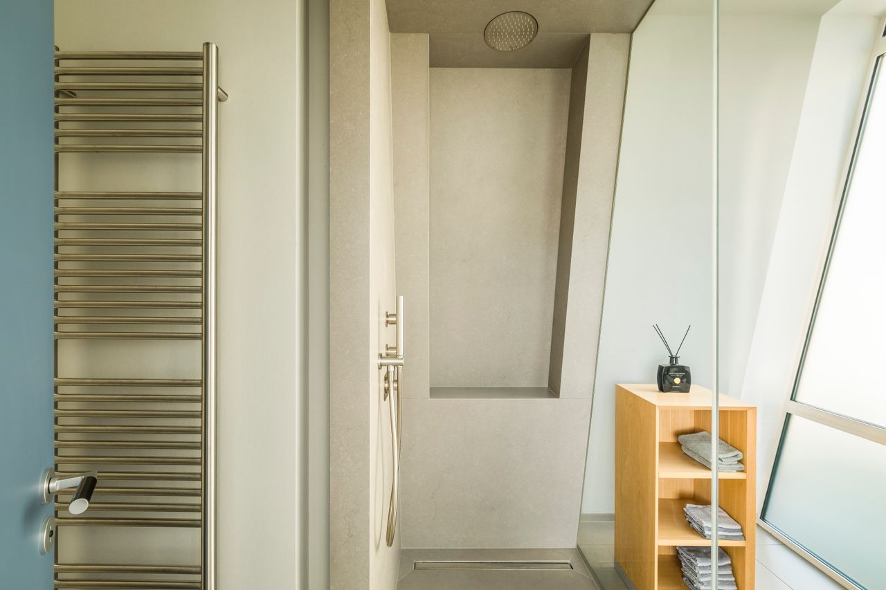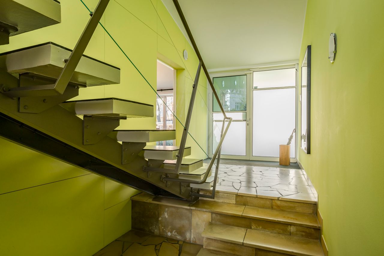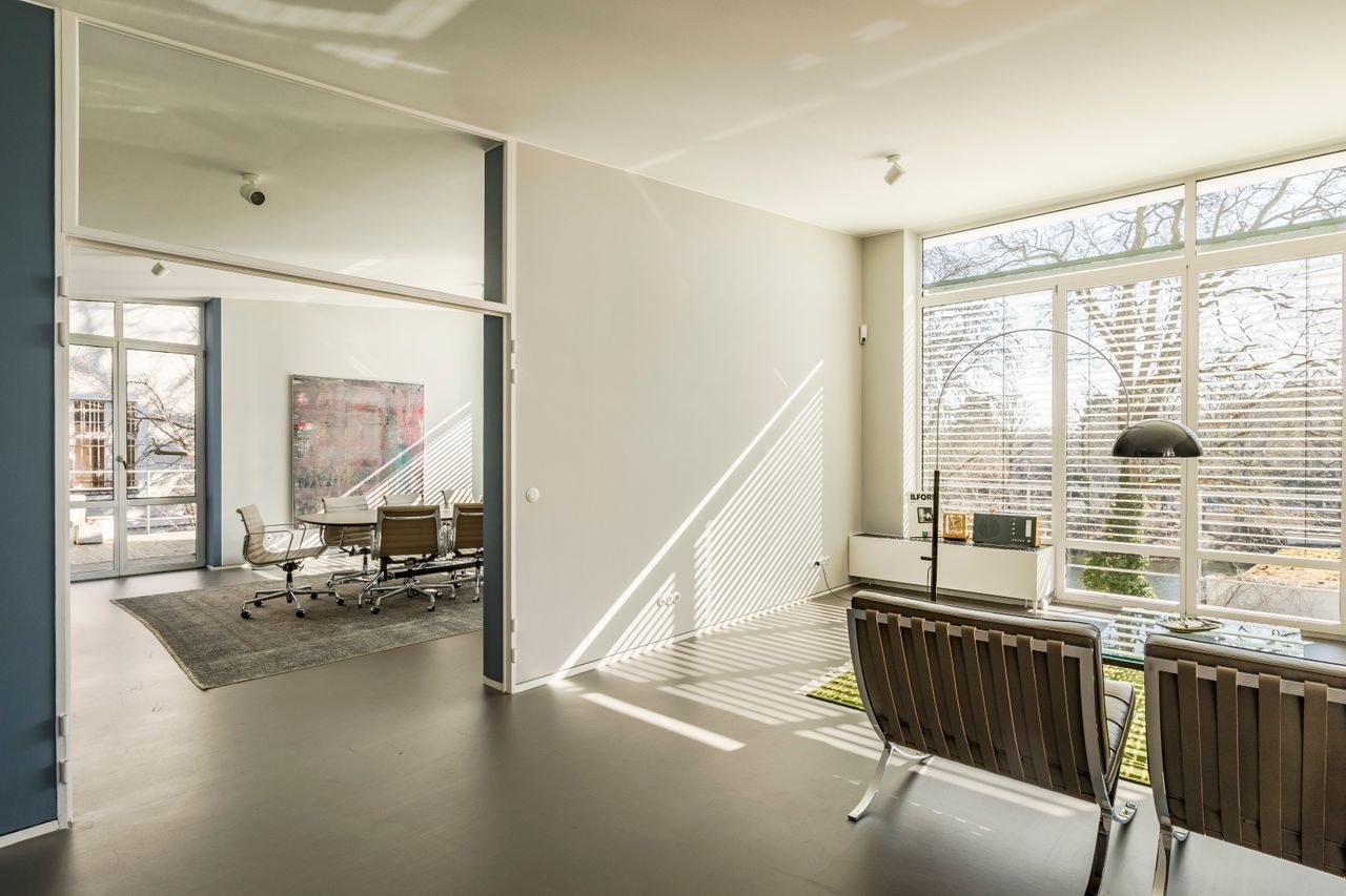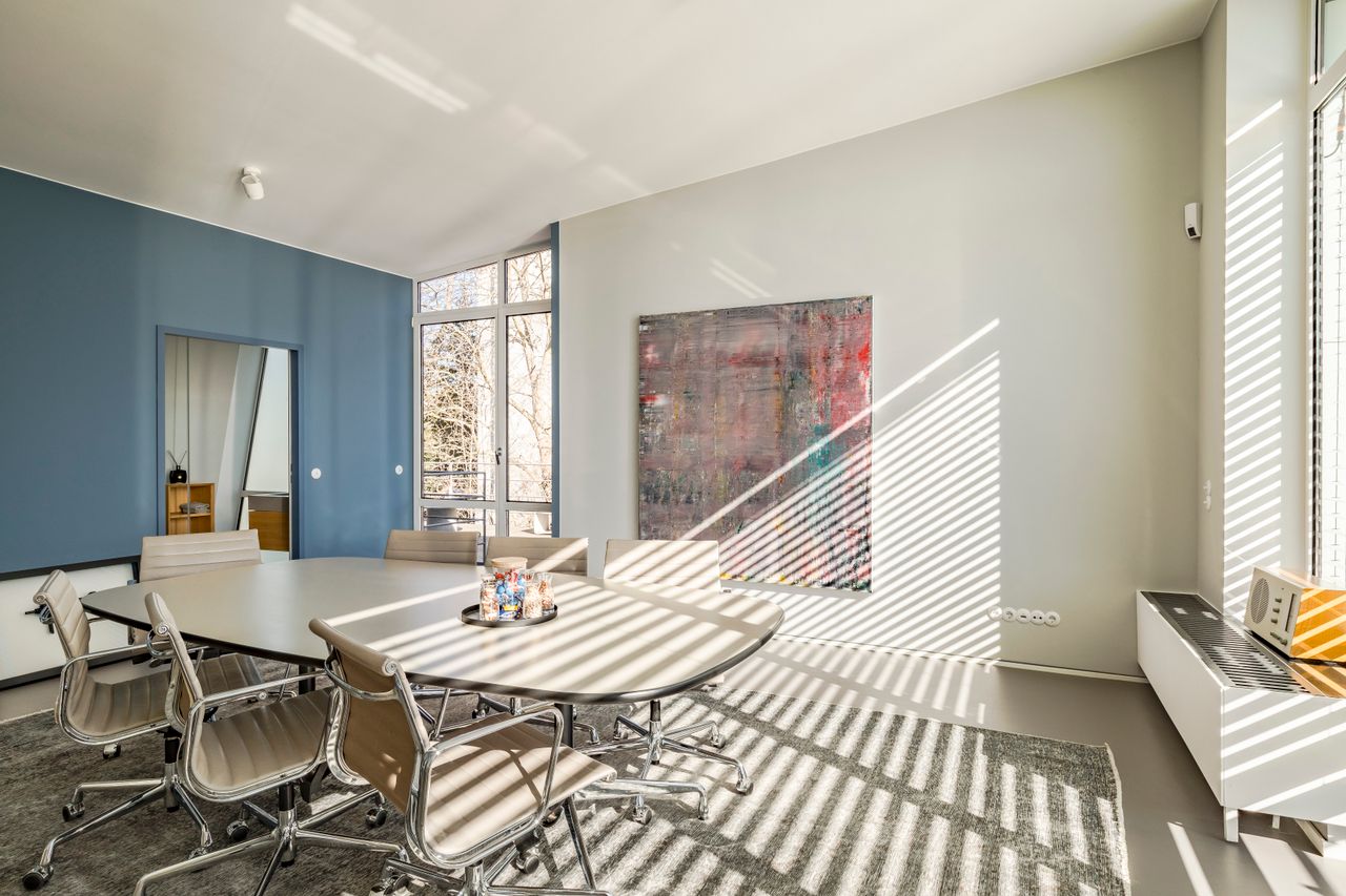 Das Baudenkmal und ehemalige Eternit Gästehaus bietet auf 2 Etagen großzügige, lichtdurchflutete Wohnflächen mit ca. 210 m². Der geöffnete Salon in der oberen Etage mit seinen Terassen schafft durch weite Blickachsen ein beeindruckendes Raumgefühl. Designer-Möbel im Mid-Century-Stil unterstreichen den besonderen Charakter des Hauses und bieten mit Walk-in Dusche, Küche und Kamin eine moderne Repräsentanz. Die Wandfarben sind farbig bzw. hellen Grau – ideal für Filmaufnahmen gestaltet.