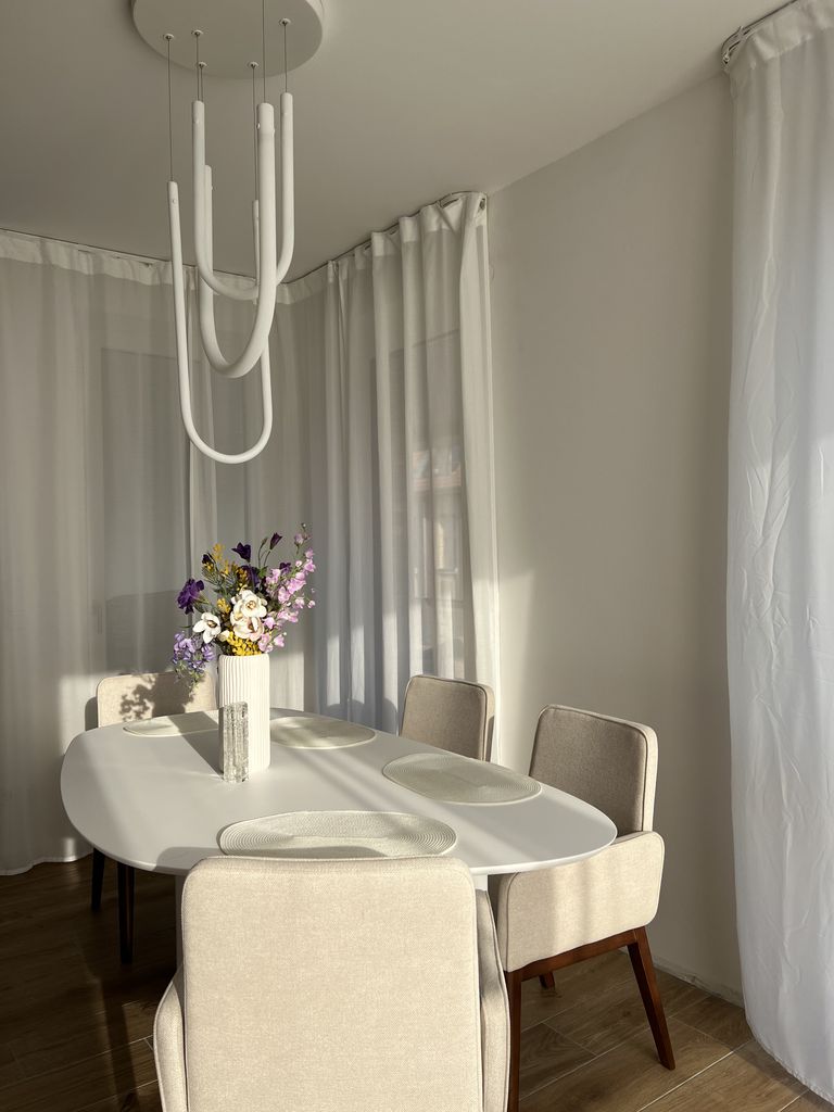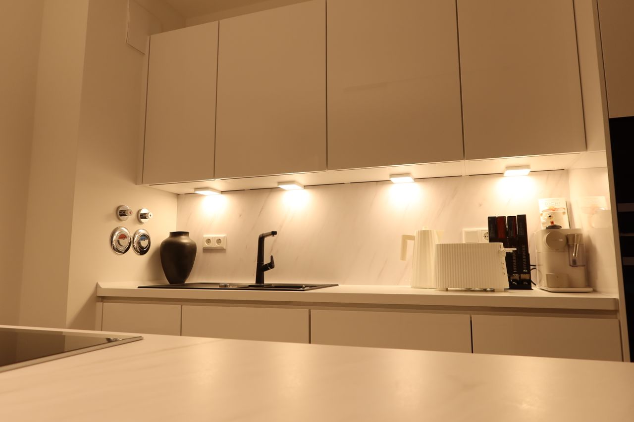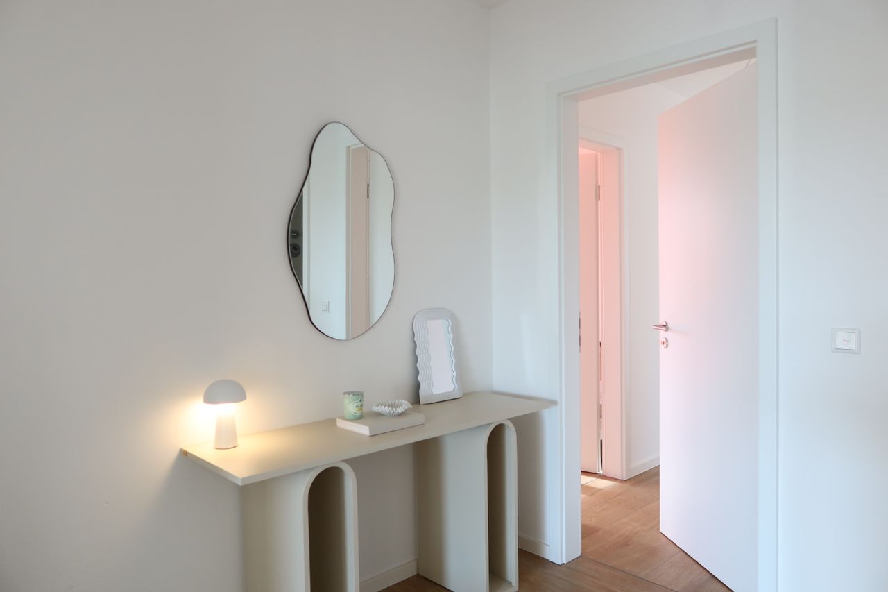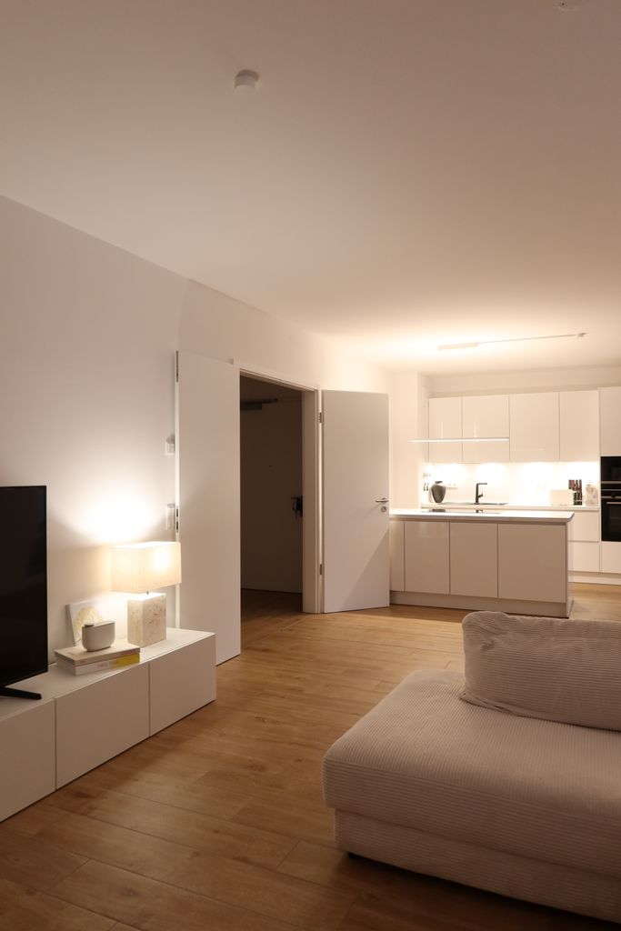 Eine strahlende Wohnung, die dank ihrer Fülle an Licht und modernen, schicken weißen Möbeln einladend wirkt. Genießen Sie ein helles Ambiente und zeitgemäßen Stil in diesem einzigartigen Wohnraum. Die Kombination von Helligkeit und zeitloser Eleganz erzeugt eine ansprechende Atmosphäre.
