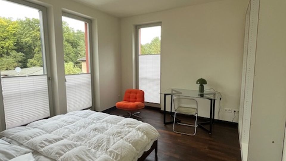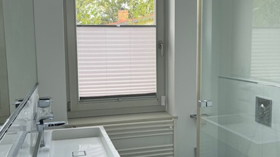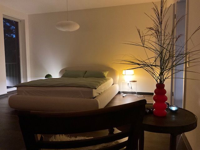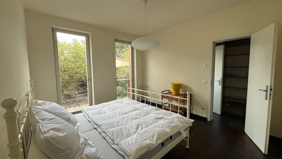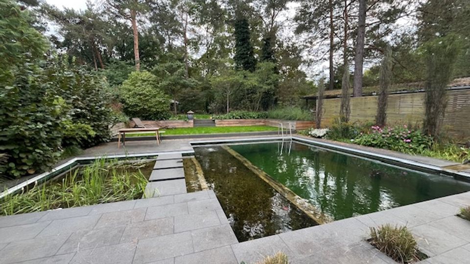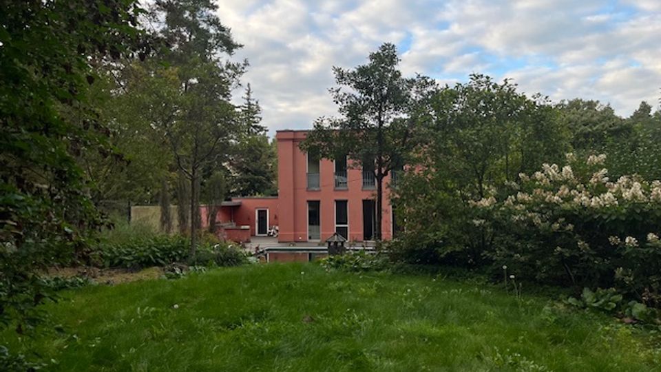 Moderne Stadtvilla aus dem Jahr 2005 mit klarer Architektursprache, dunklem Echtholzboden und großzügigen Fensterfronten, die viel natürliches Licht hereinlassen. Das Haus liegt ruhig und von Grün umgeben, mit Blick auf einen geometrisch angelegten Naturpool und einen weitläufigen Garten. Innen dominieren helle Wände, dunkles Holz und eine reduzierte, zeitlose Gestaltung. Ein Kamin im Salon sowie ein zweiter im oberen Schlafzimmer sorgen für eine warme Atmosphäre. Im Obergeschoss befindet sich auch eine Sauna. Die Räume sind derzeit nur sehr sparsam möbliert, was sie besonders flexibel für Film- und Fotoproduktionen macht – es muss kaum etwas entfernt werden, bevor eigenes Set-Design aufgebaut werden kann. Im Garten befindet sich eine überdachte, rund angelegte Feuerstelle (wigwamartig), die sich hervorragend für Außenaufnahmen eignet. Insgesamt bietet die Villa vielfältige Perspektiven zwischen moderner Klarheit, Naturverbundenheit und Ruhe.