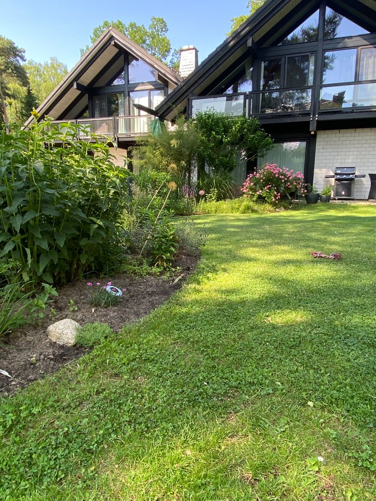 Unser Haus ist geprägt von großen Fensterfronten und offene Räume die es zu einem sehr hellen Haus machen (ähnlich "HUF-Haus"). Auf dem Grundstück stehen 2 versetzt gebaute Häuser. Beide gehören uns als Eigentümer, wobei nur eines der Häuser von uns bewohnt wird und das andere fremdvermietet ist.