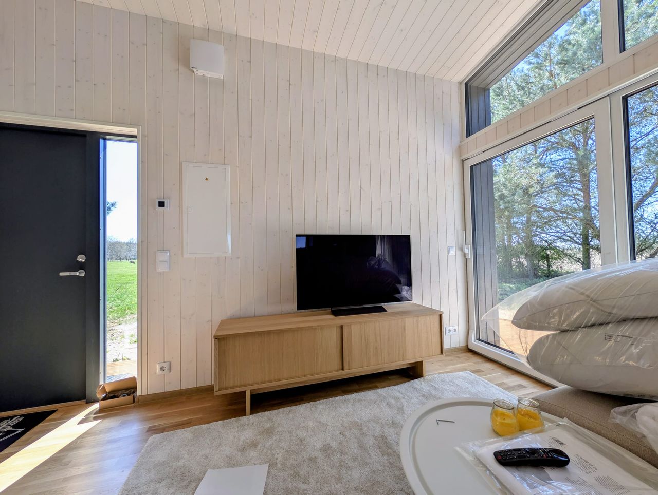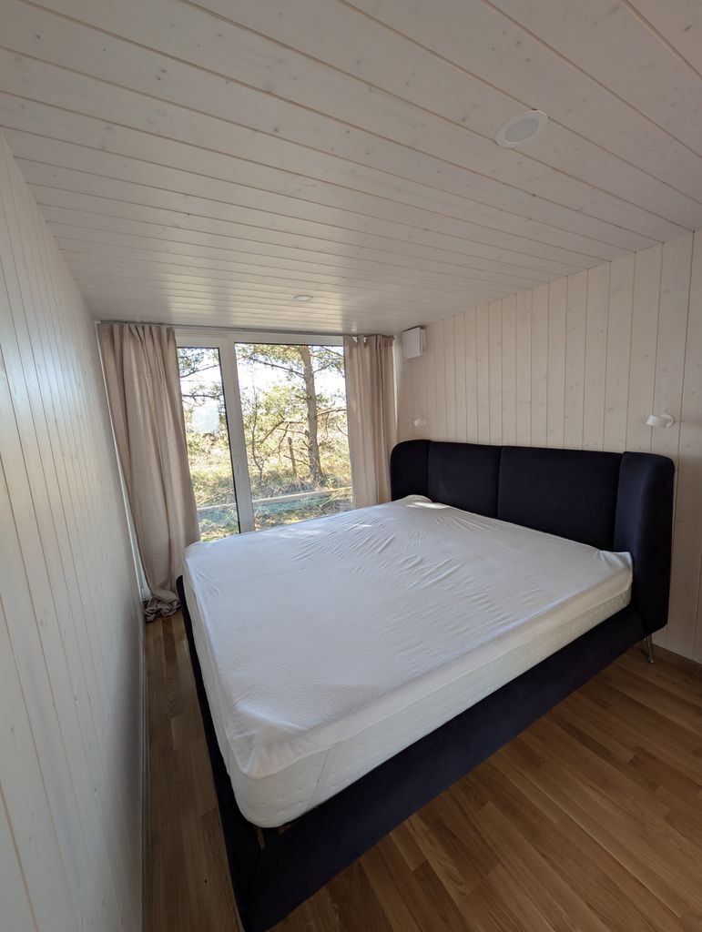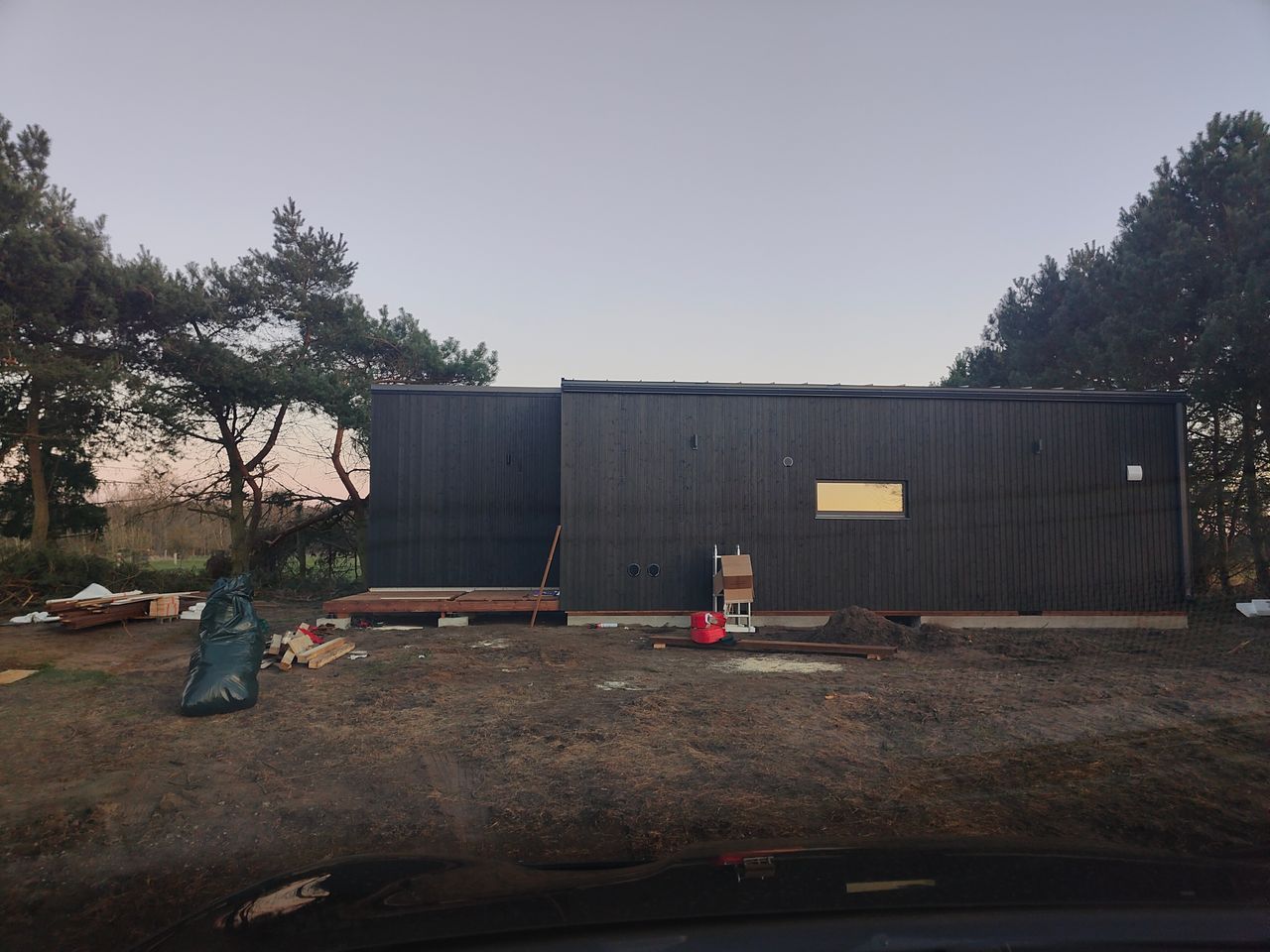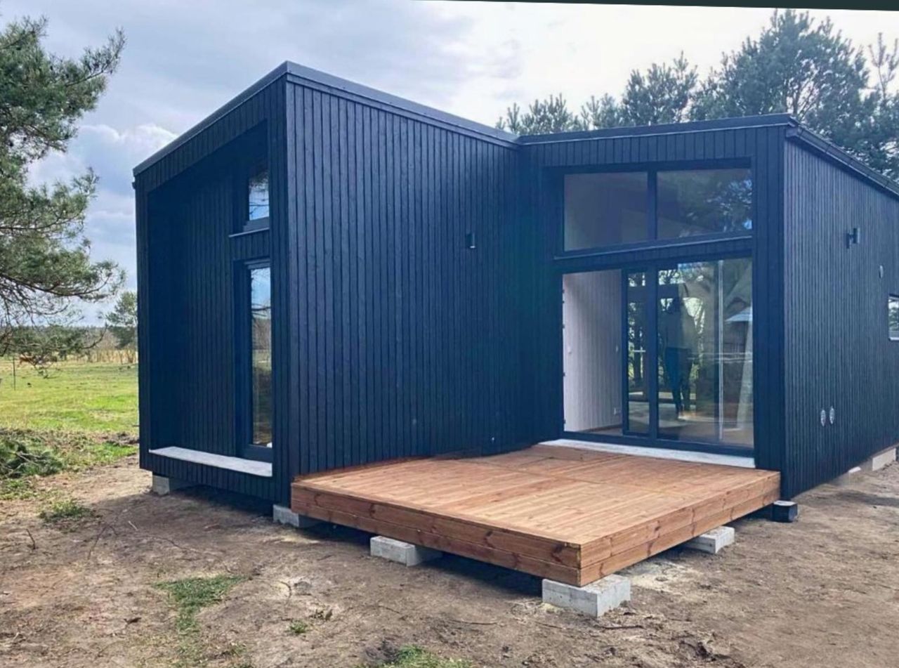 Dieses 50 m² große Modulhaus plus 20 qm Emporen in unmittelbarer Nähe zum Stettiner Haff (MV) ist ein markanter Blickfang für Film- und Fotoproduktionen. Die tiefschwarze Holzfassade fügt sich harmonisch in das 550 m² große Naturgrundstück einfügt.