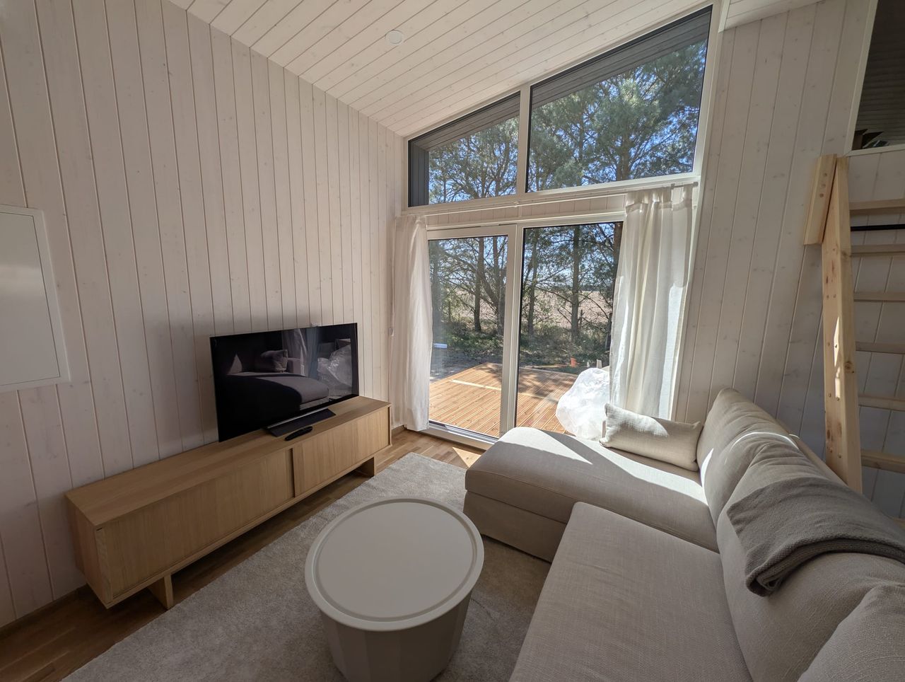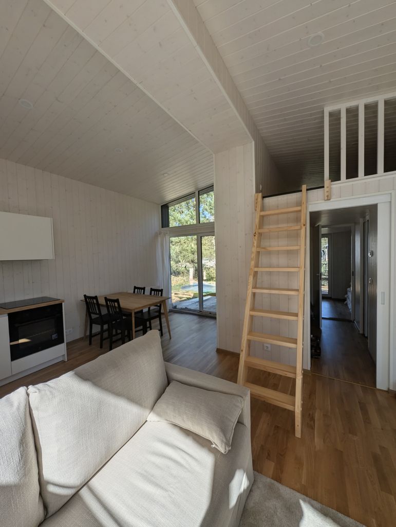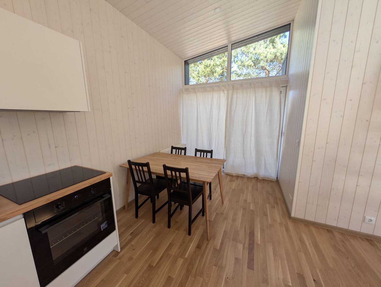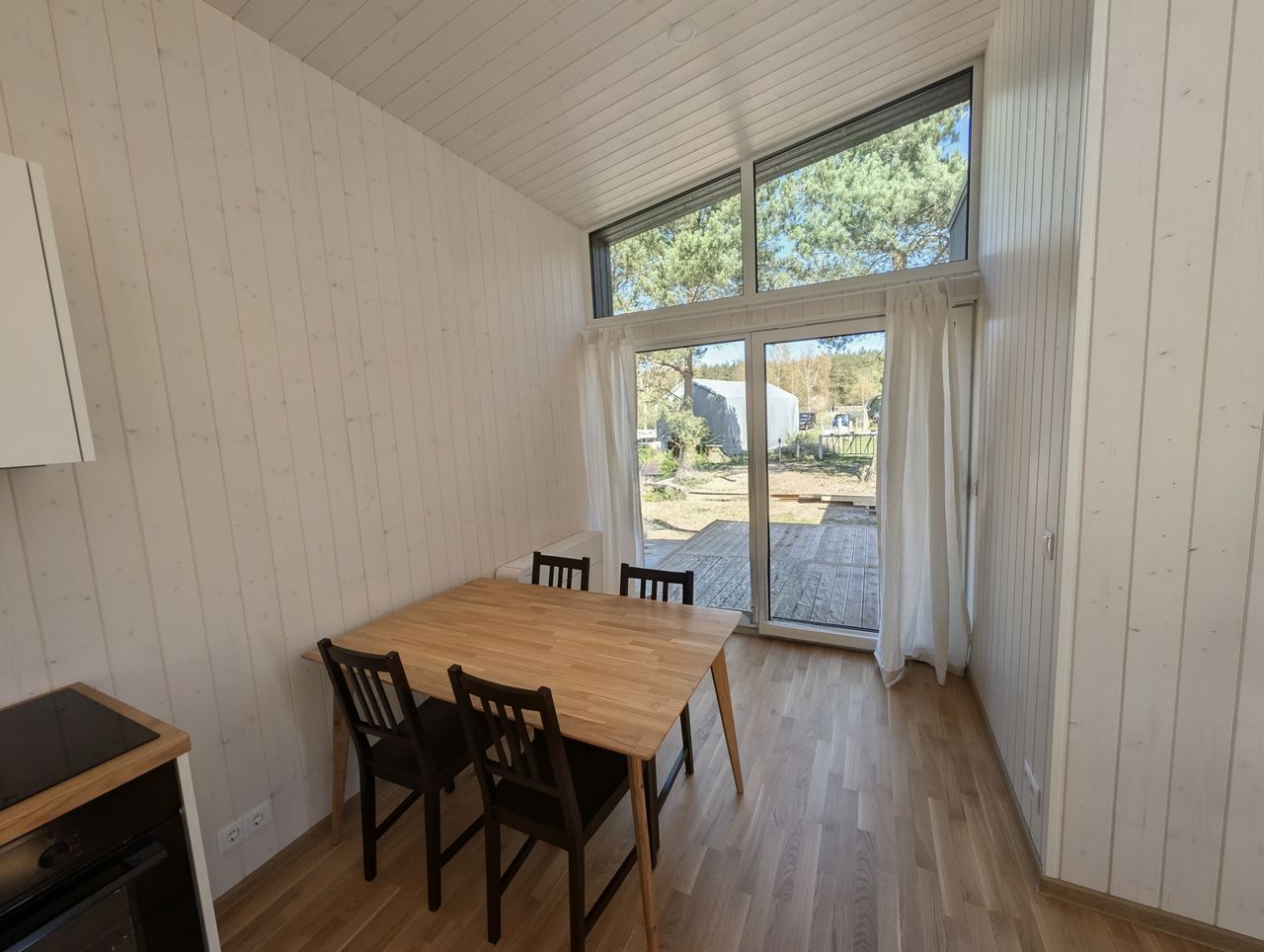 Dieses 50 m² große Modulhaus plus 20 qm Emporen in unmittelbarer Nähe zum Stettiner Haff (MV) ist ein markanter Blickfang für Film- und Fotoproduktionen. Die tiefschwarze Holzfassade fügt sich harmonisch in das 550 m² große Naturgrundstück einfügt.