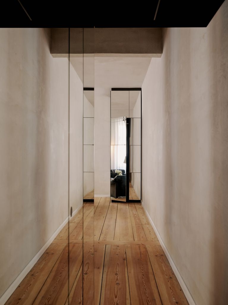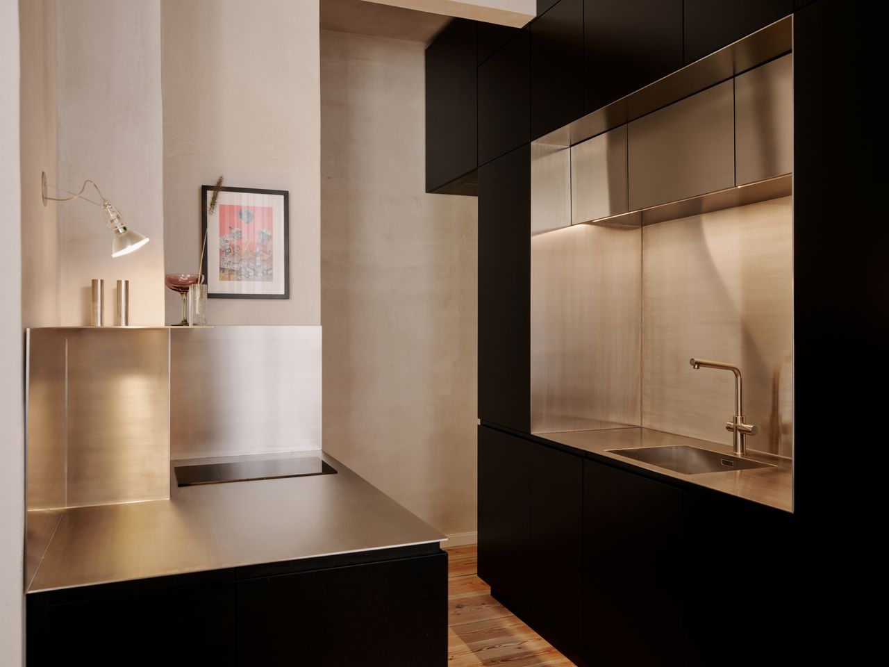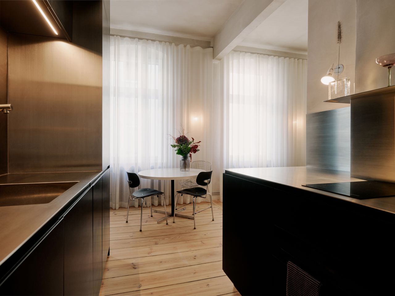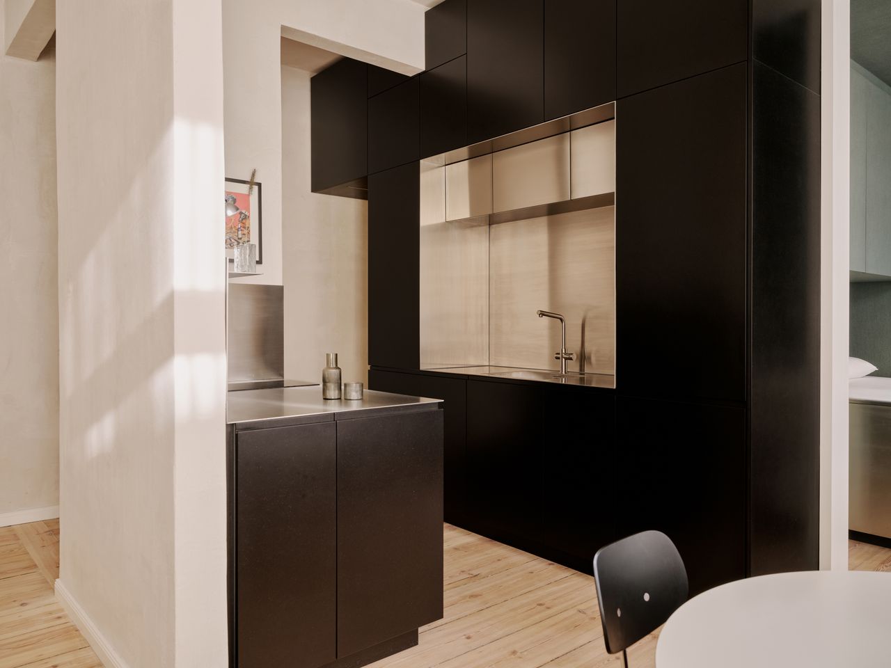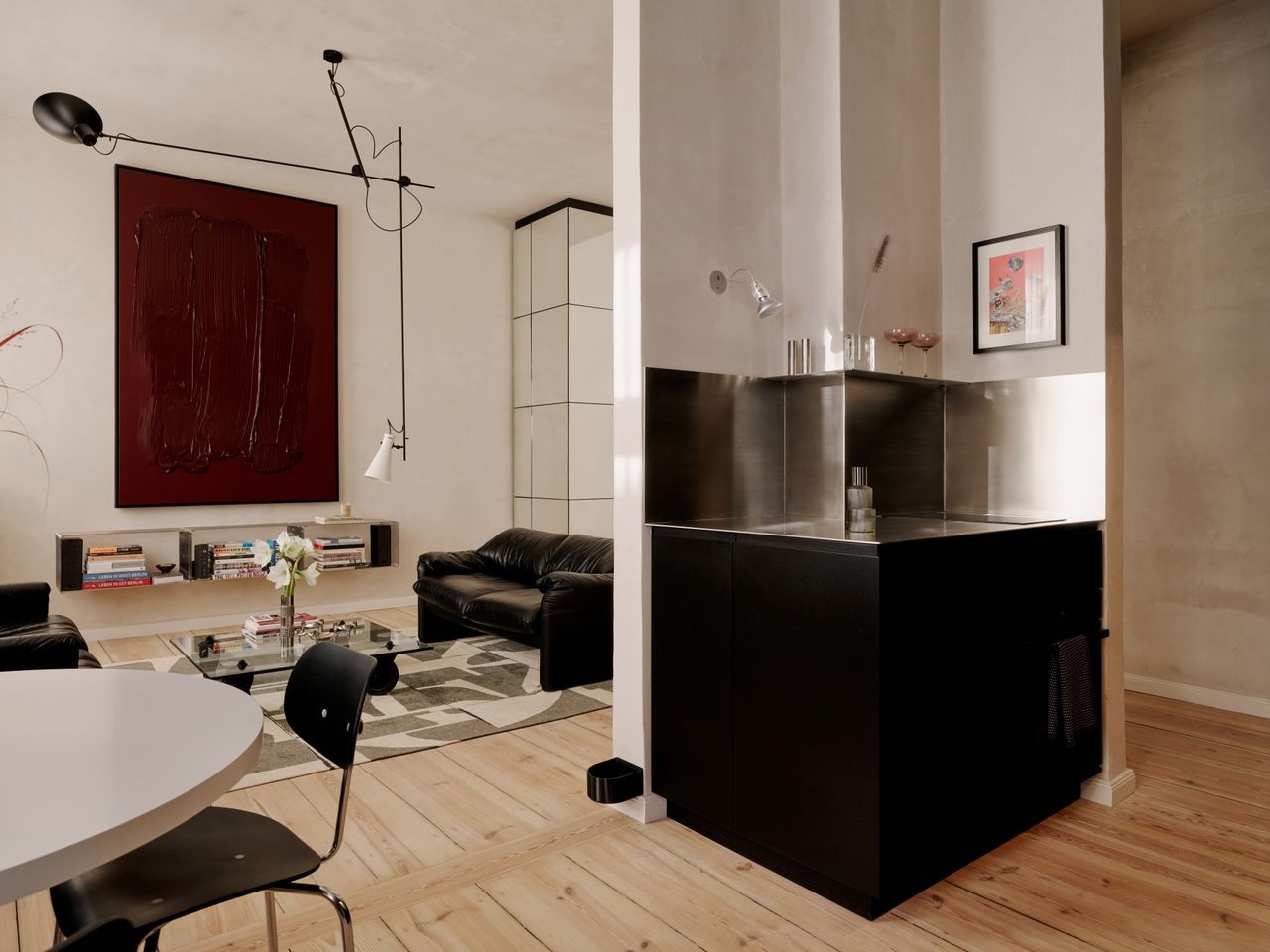 Modernes 49qm Studio apartment mit sehr hochwertigen Einbauten und hohen Wänden. Heller Dielenboden, unverputzte Betonwände. EInbauten aus Edelstahl und Valchromat.