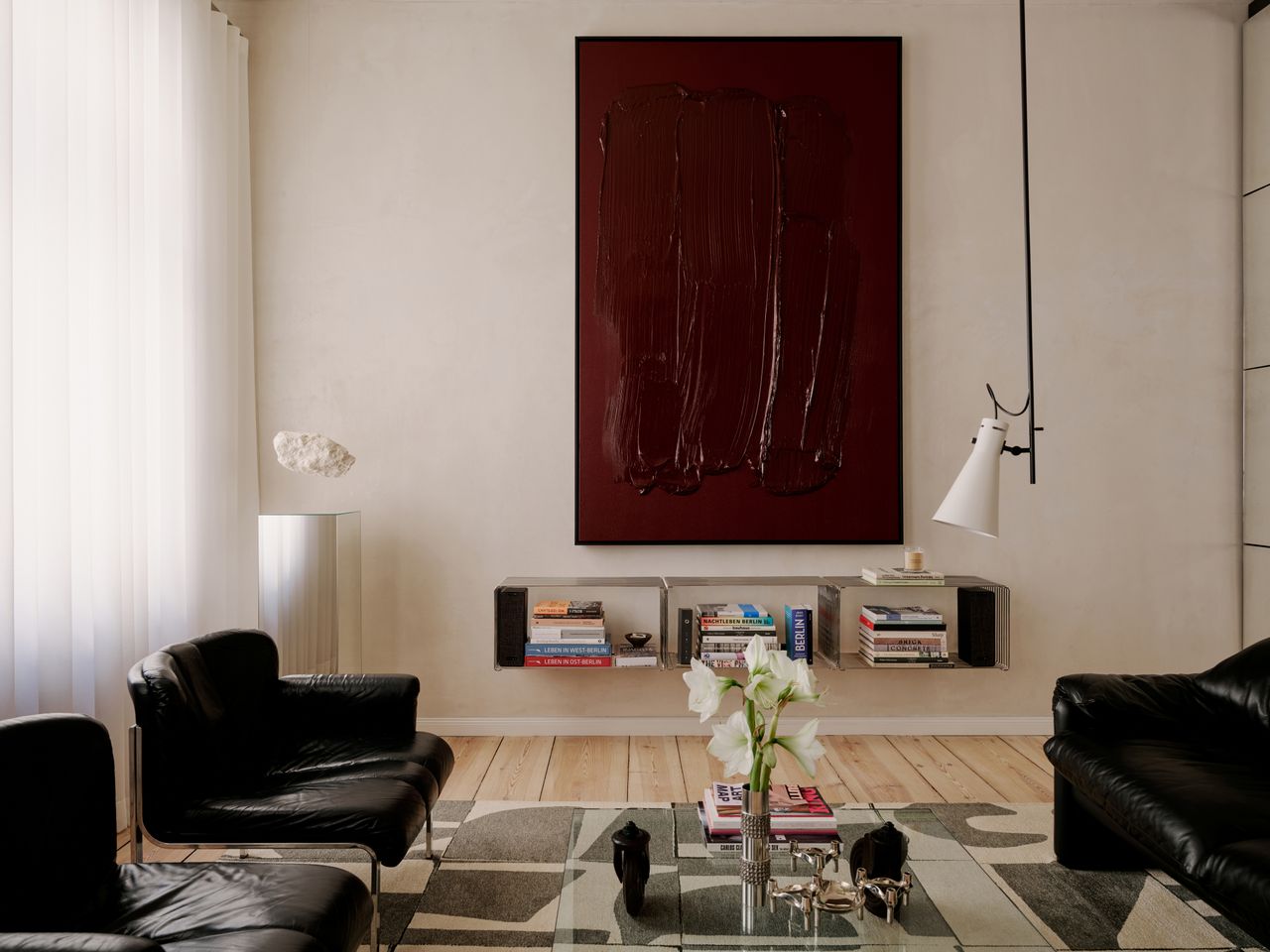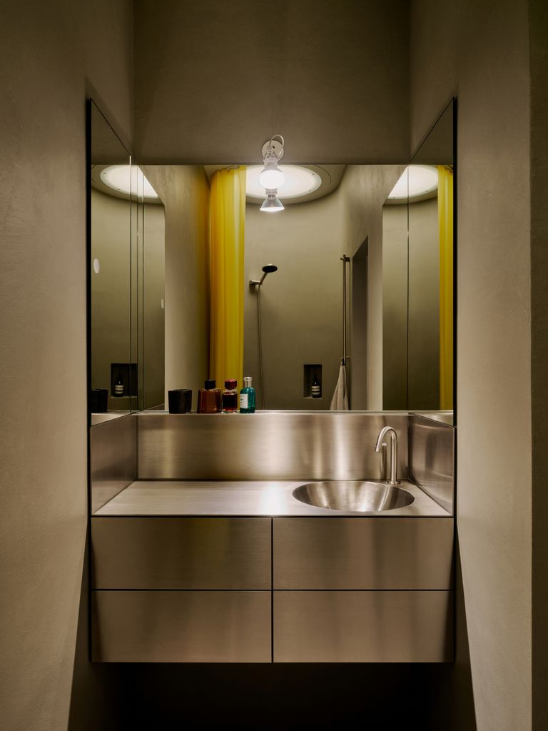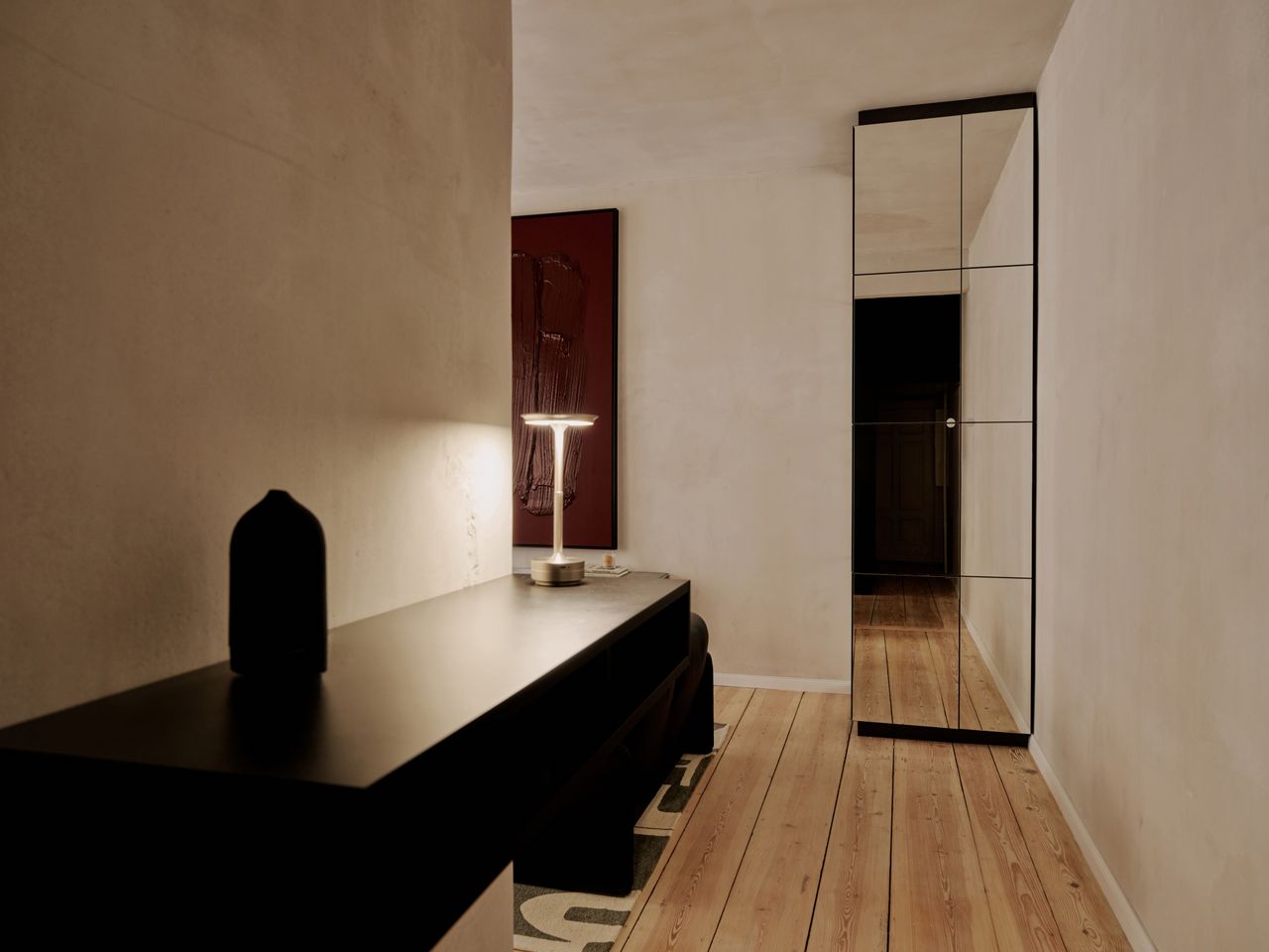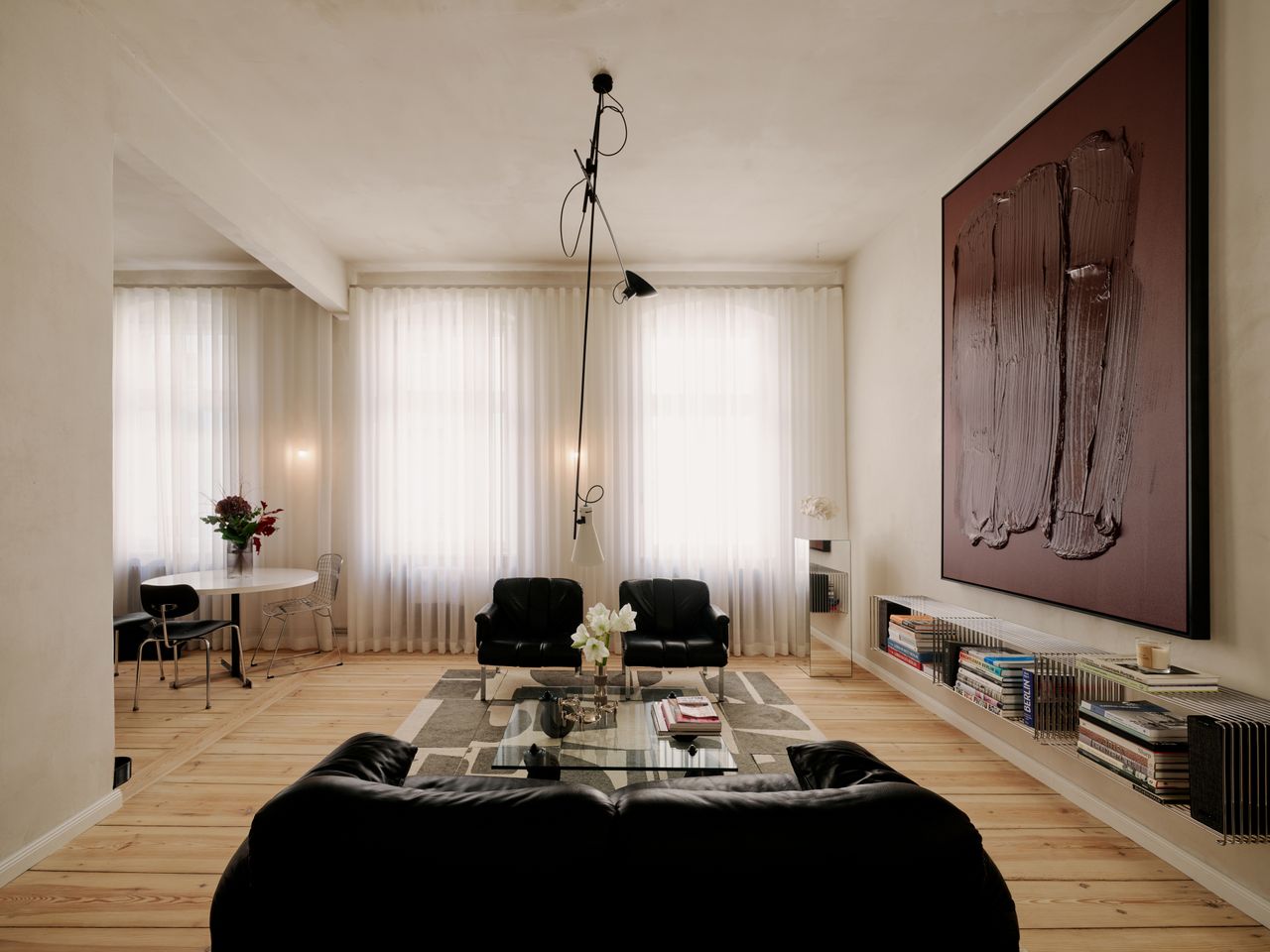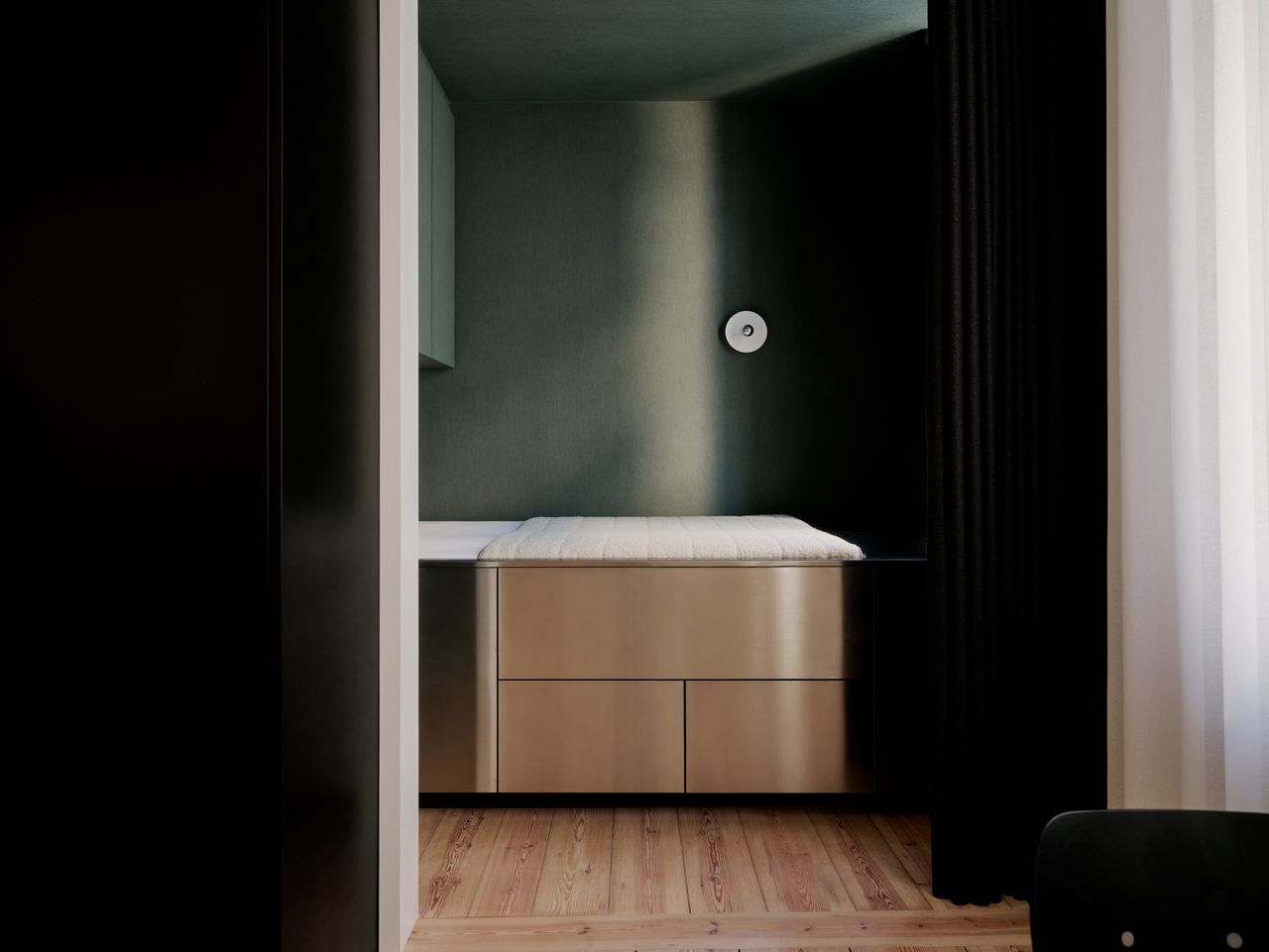 Modernes 49qm Studio apartment mit sehr hochwertigen Einbauten und hohen Wänden. Heller Dielenboden, unverputzte Betonwände. EInbauten aus Edelstahl und Valchromat.