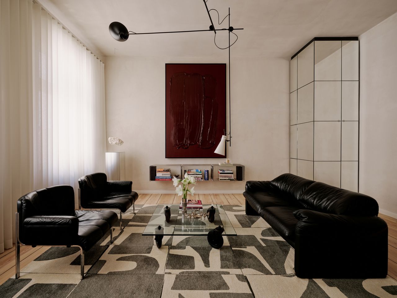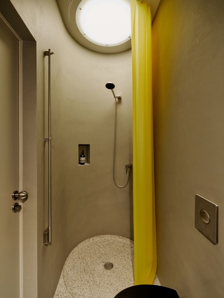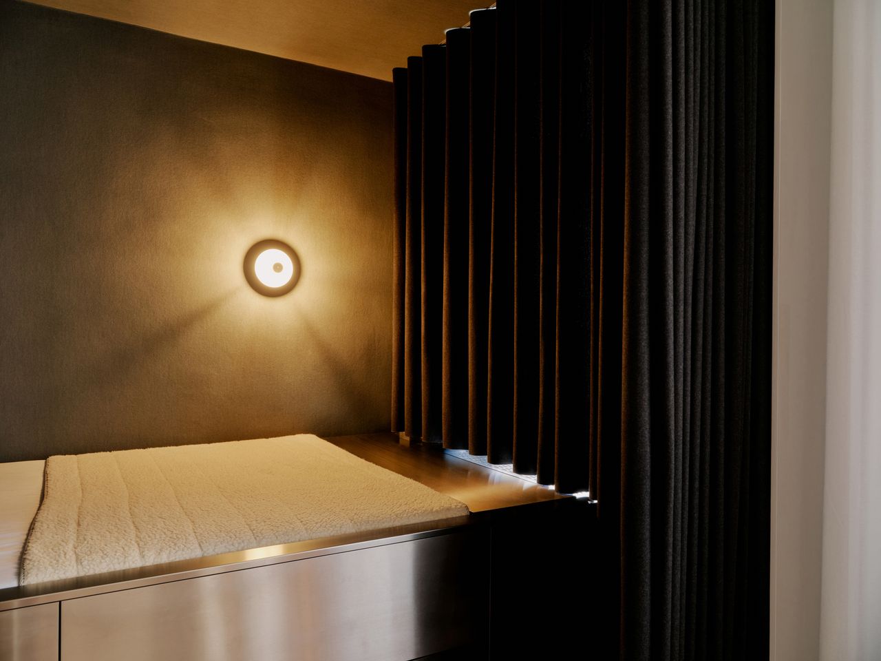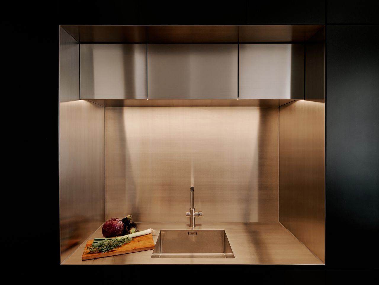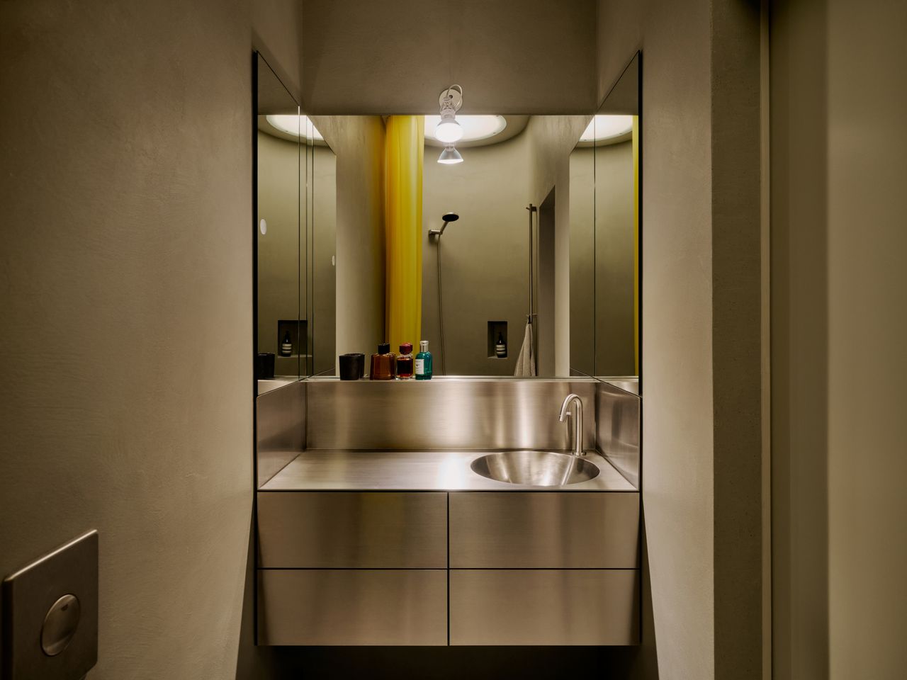 Modernes 49qm Studio apartment mit sehr hochwertigen Einbauten und hohen Wänden. Heller Dielenboden, unverputzte Betonwände. EInbauten aus Edelstahl und Valchromat.