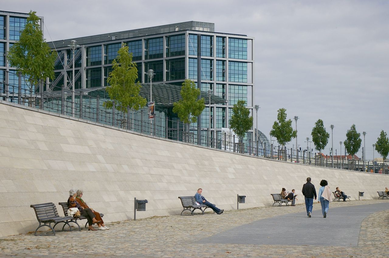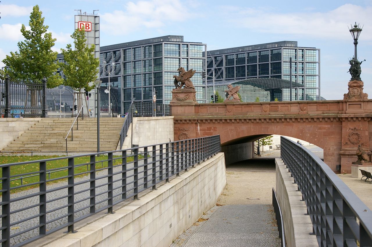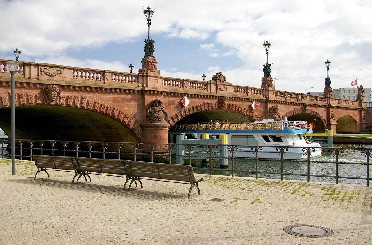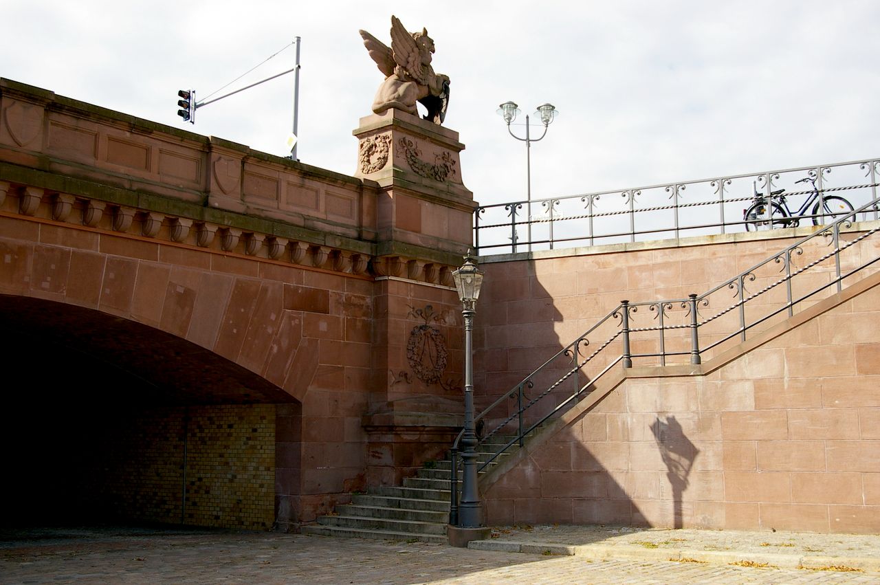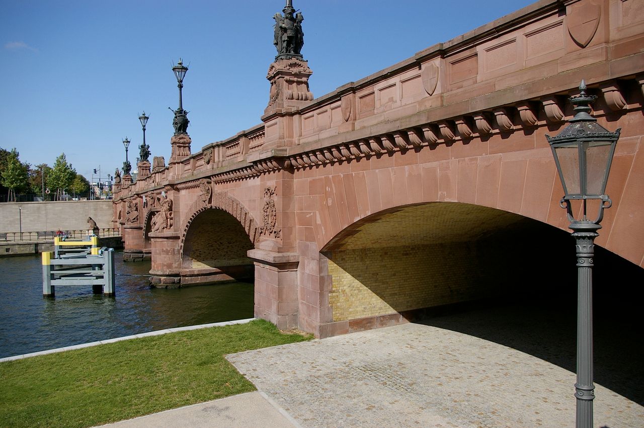 Die Brücke besteht über dem Fluss aus drei Korbbogen und über den Uferwegen jeweils einen kleineren Segmentbogen, die mit Sandstein verkleidet wurden.