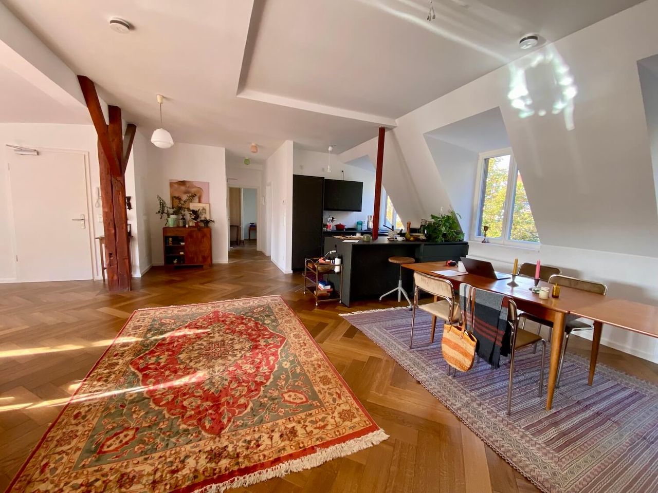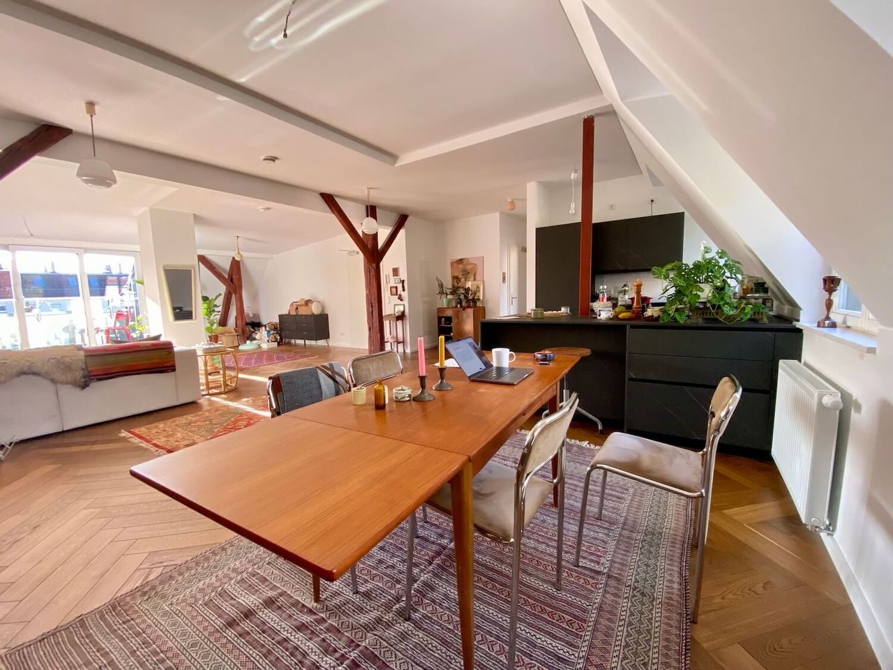 Nestled in a blend of vintage charm and modern elegance, this Home Studio features beautiful herringbone floors, original exposed beams, and an open-plan designer kitchen that effortlessly merges style and function. Sunlight pours in from various angles, creating a naturally lit environment that enhances the space's bright, airy feel. The mix of industrial elements with contemporary touches provides a one-of-a-kind photo and film ready-made set.