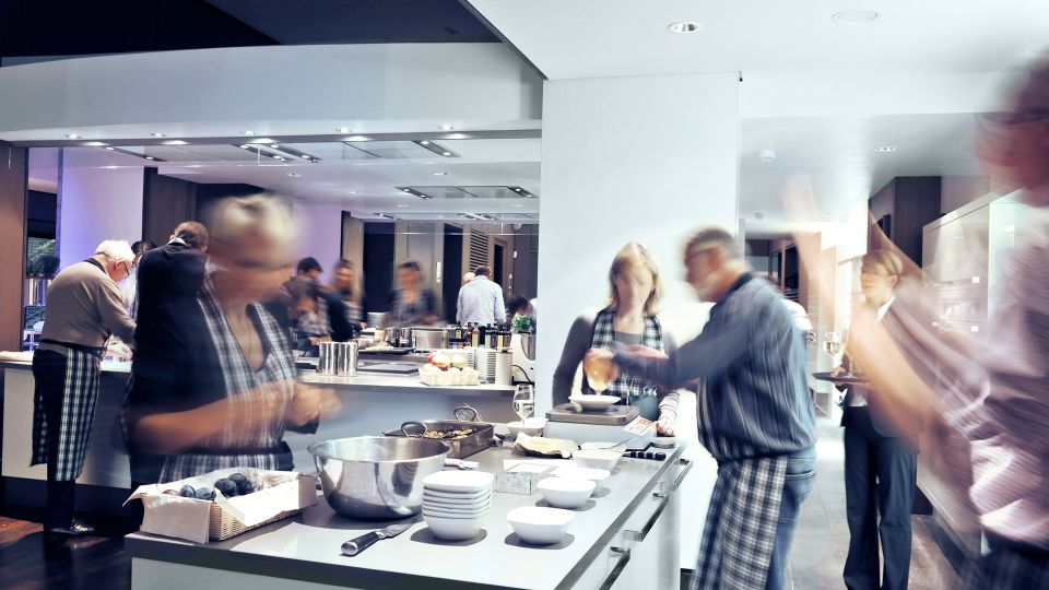 Ob Kochschüler oder Kochkünstler, der Cooking Club ist für jeden die perfekte Spielstätte: An vier Kochstationen können jeweils bis zu zehn Teilnehmer gleichzeitig kochen. Zusätzlich lassen sich Speisen an mobilen Arbeitsplätzen vorbereiten. Insgesamt finden bis zu 190 Gäste Platz, um gemeinsam vorzubereiten und im Anschluss die mehrgängigen Menüs zu genießen. Produktpräsentationen und Degustationen lassen sich im Bar-Bereich oder der Show-Theke zelebrieren. Auf 250 Quadratmetern ist Platz für alle erdenklichen kulinarischen Events.