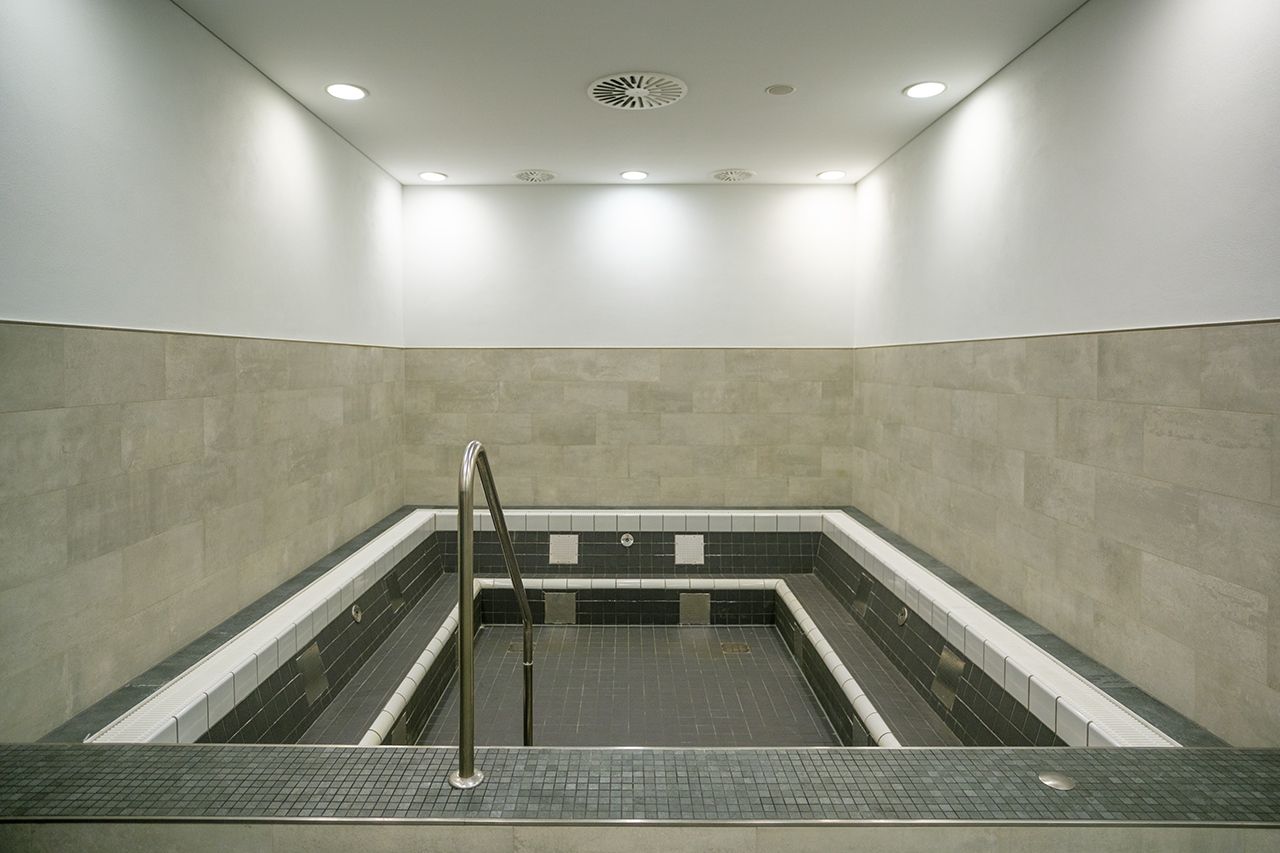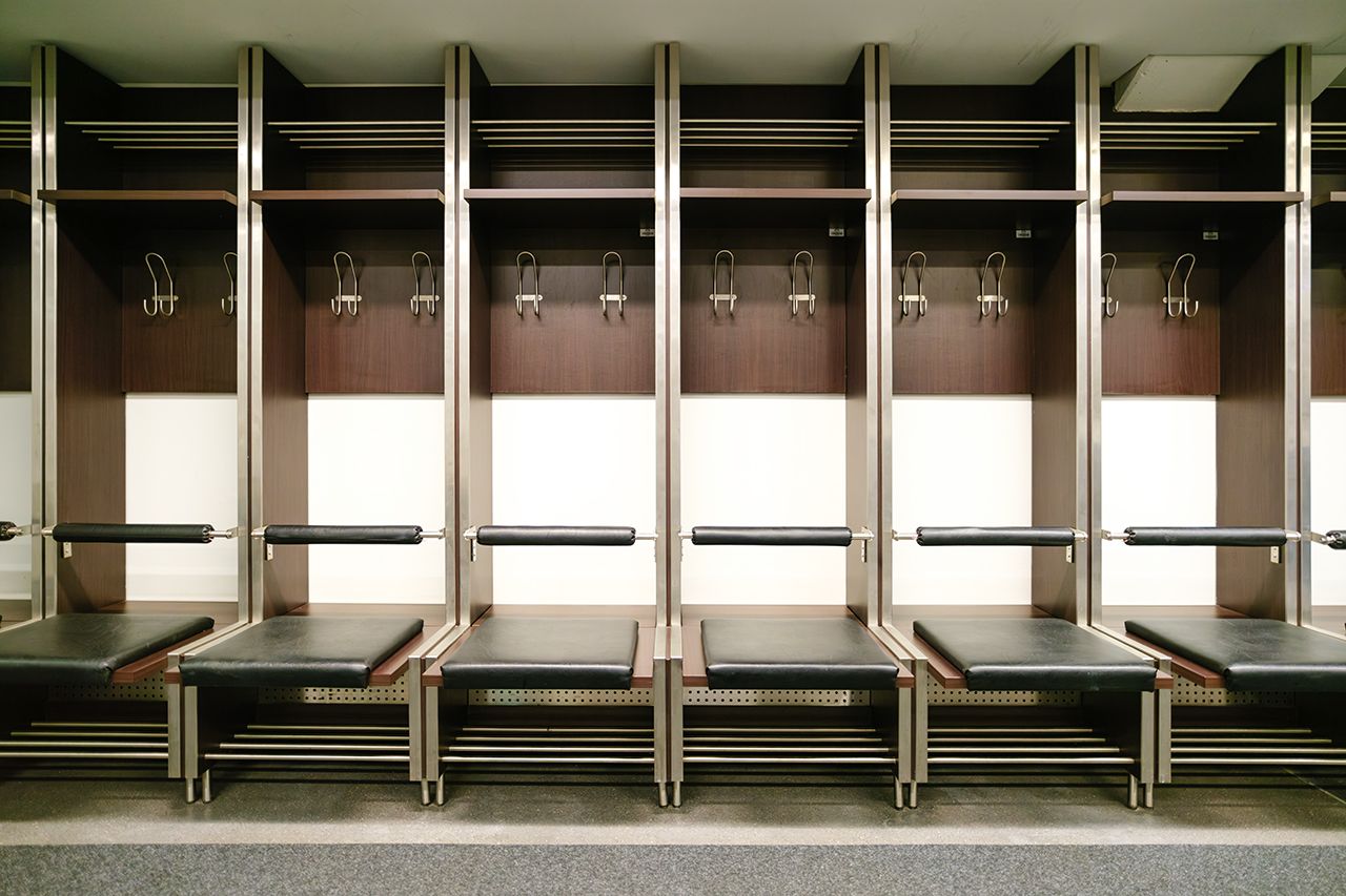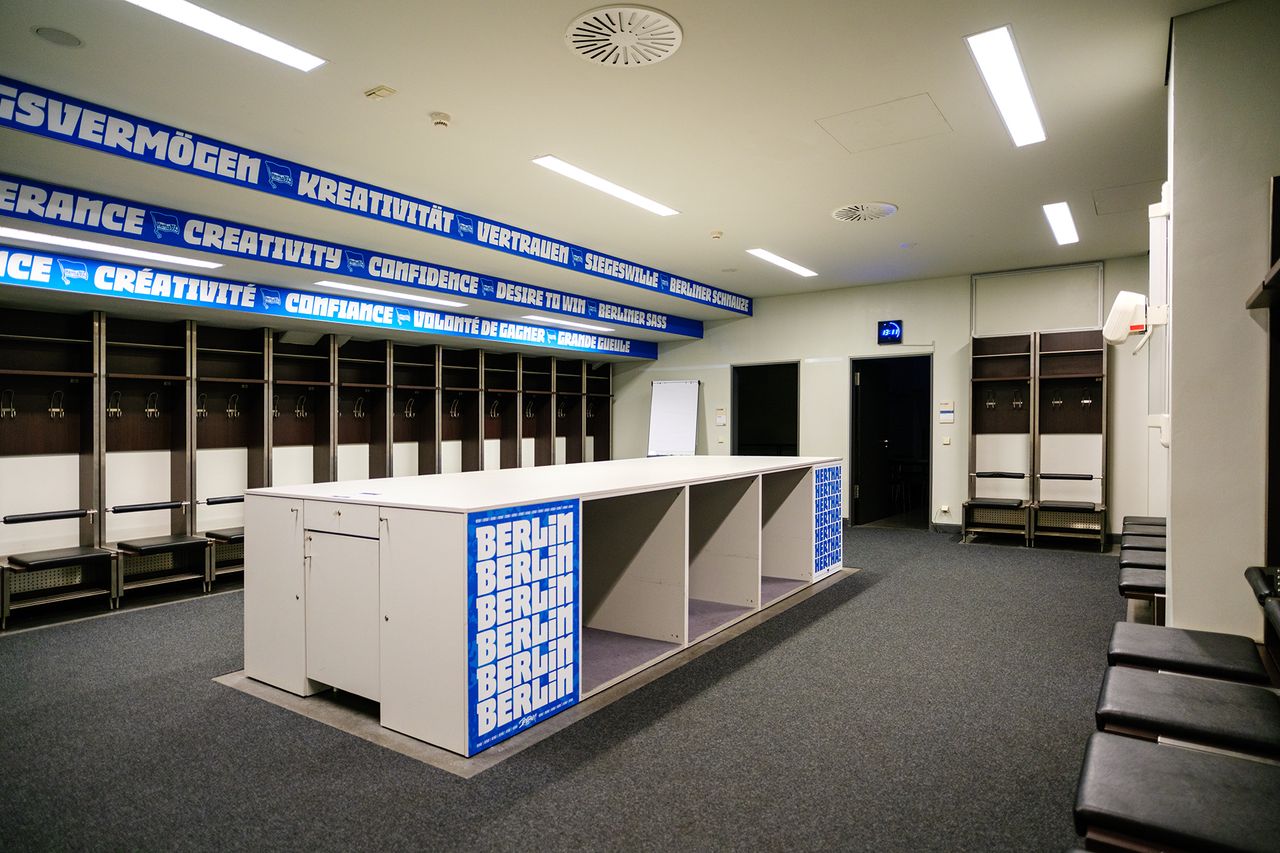 Umkleidebereiche im Olympiastadion Berlin mit Bäderbereich: Das Olympiastadion Berlin verfügt über diverse Umkleideräume mit einer Fläche von 40 bis 72 m². Die hier gezeigte Umkleide A zeigt die größte aller vorhandenen Umkleiden.