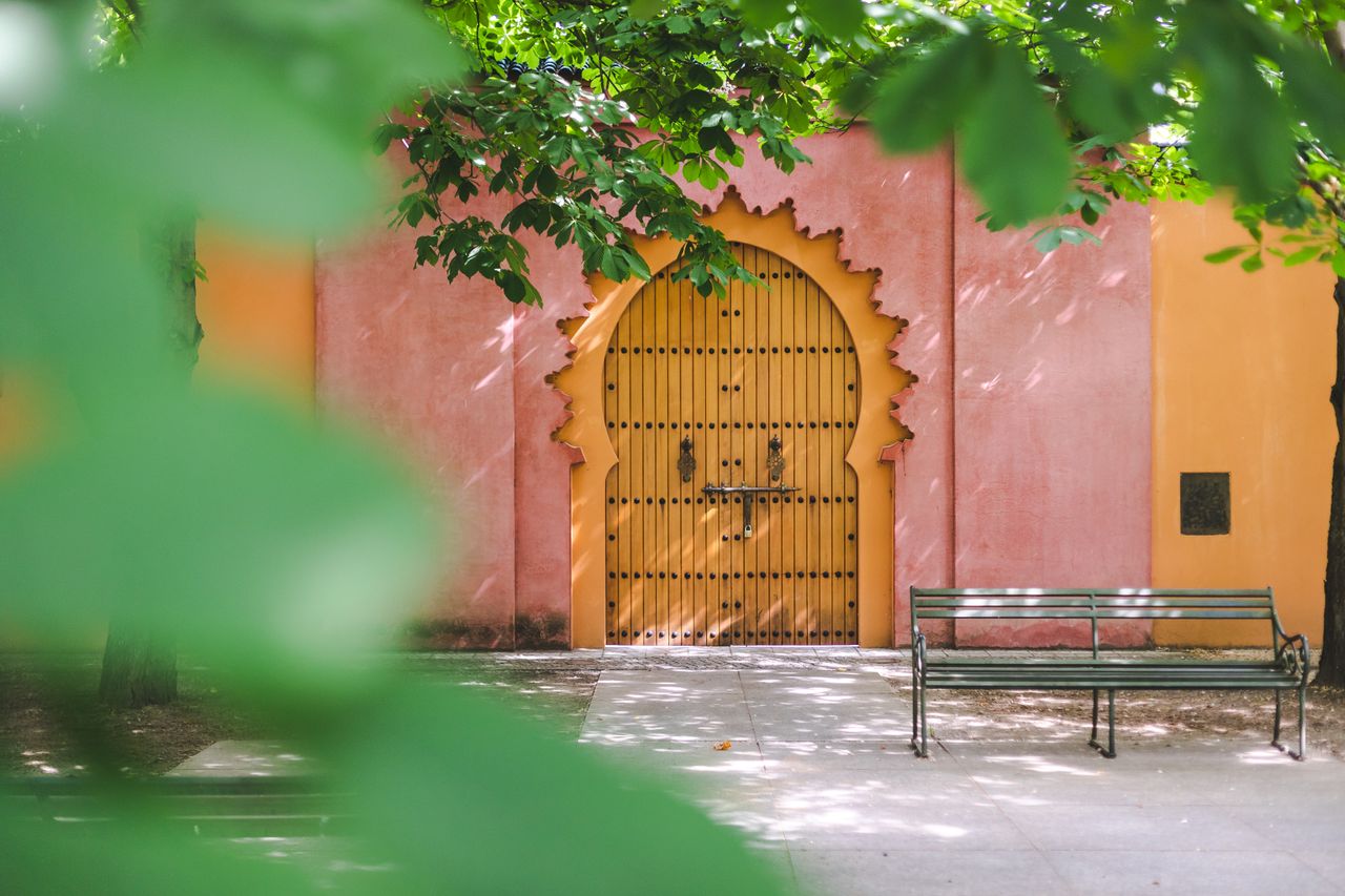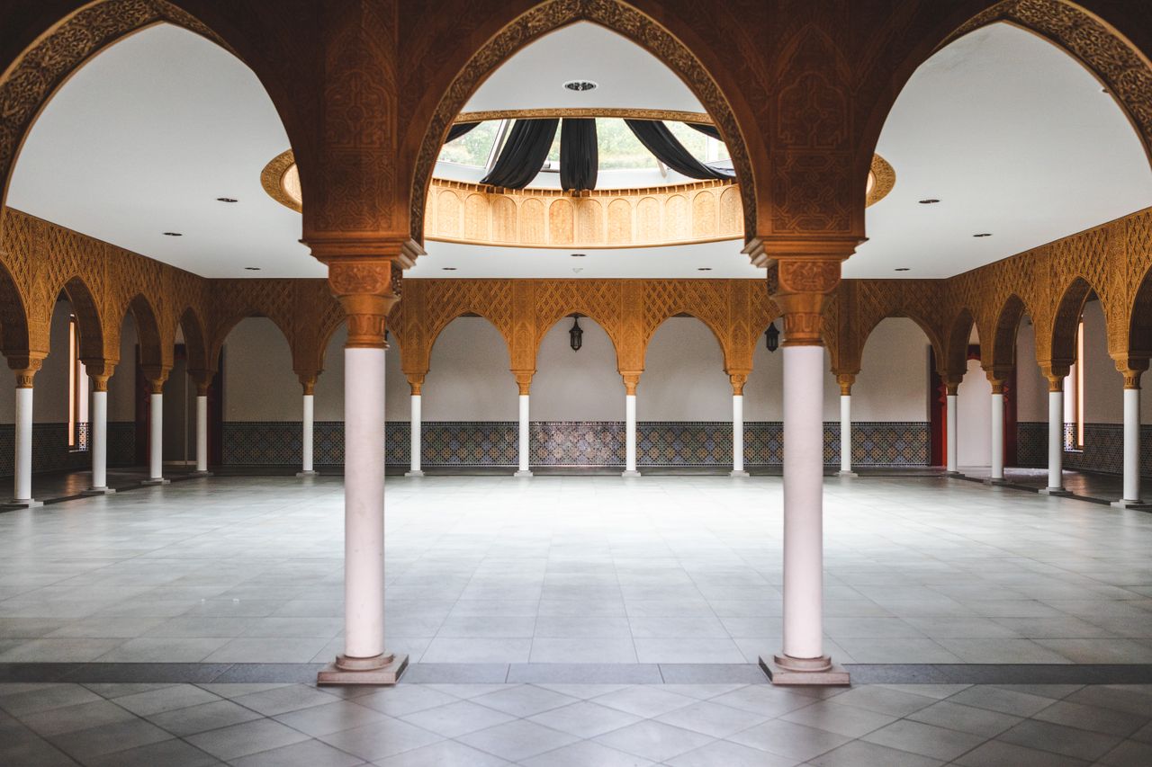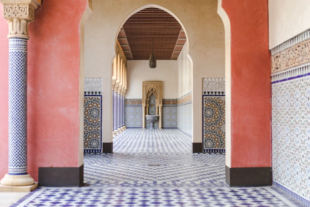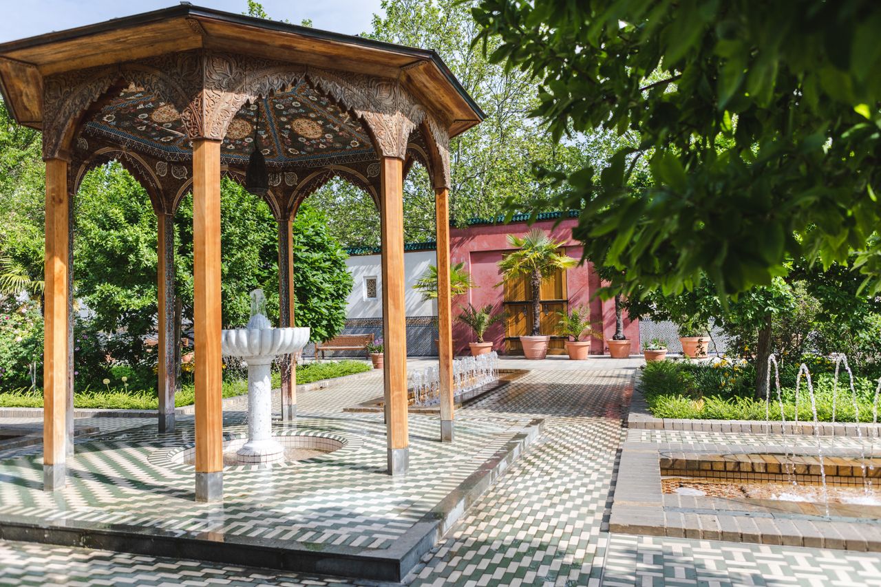 Über den „Saal der Empfänge“ gelangt man in den 63 x 38 Meter großen Gartenhof. Er ist den orientalischen Vorbildern entsprechend geometrisch-vierteilig angelegt. Von der großen Brunnenschale in der Mitte gehen vier Wasserbecken ab, an denen vier gleich große, rechteckige Beete liegen. Entsprechend der orientalisch-islamischen Gartenkultur finden sich hier sowohl Zier- als auch Nutzpflanze. Insgesamt 1,3 Millionen marokkanische Kacheln zieren die Mauern und Arkaden des Gartens.