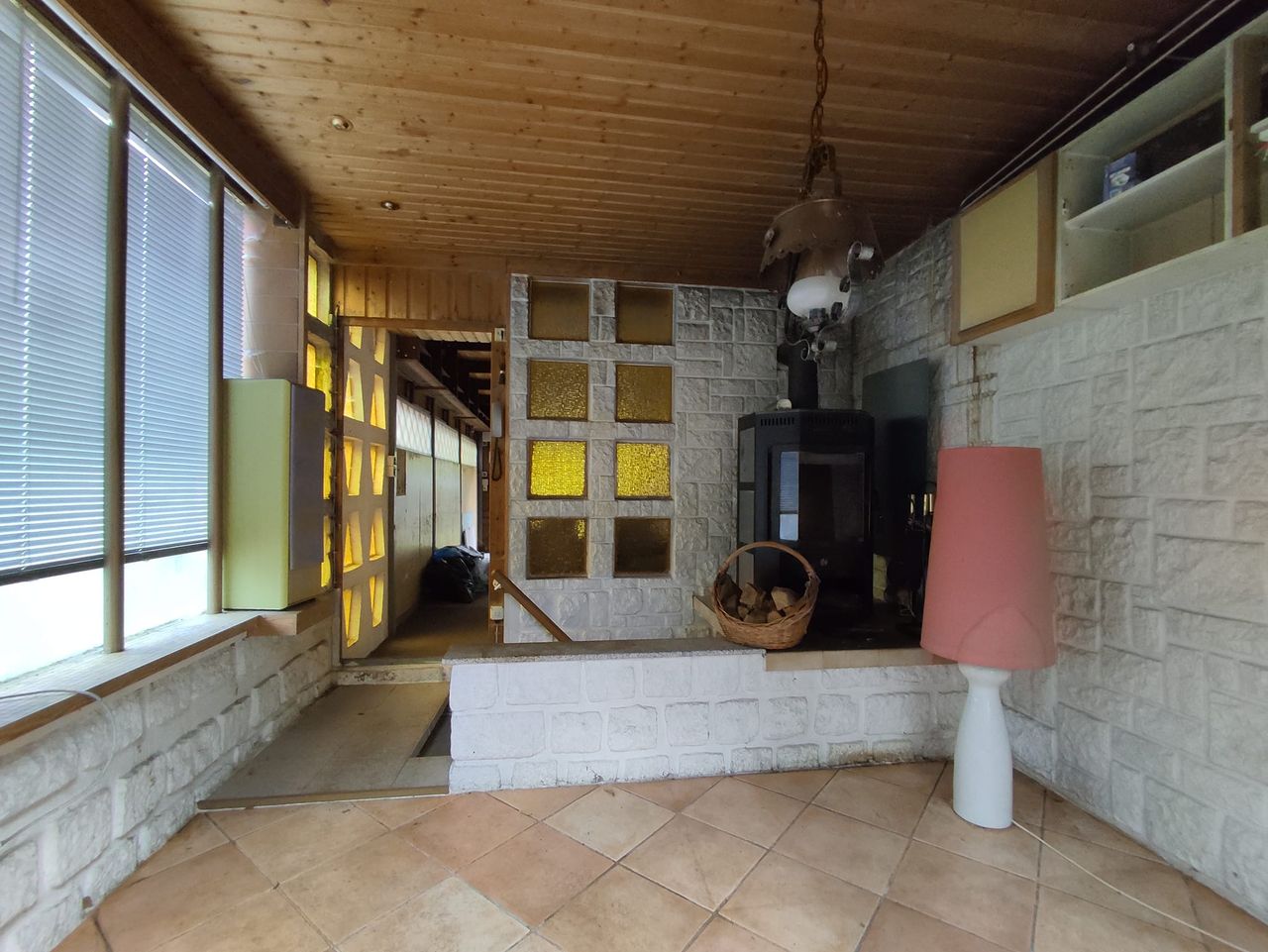 Ein Raum ist mit einem Kaminofen ausgestattet und hat zwei vollverglaste Fronten.