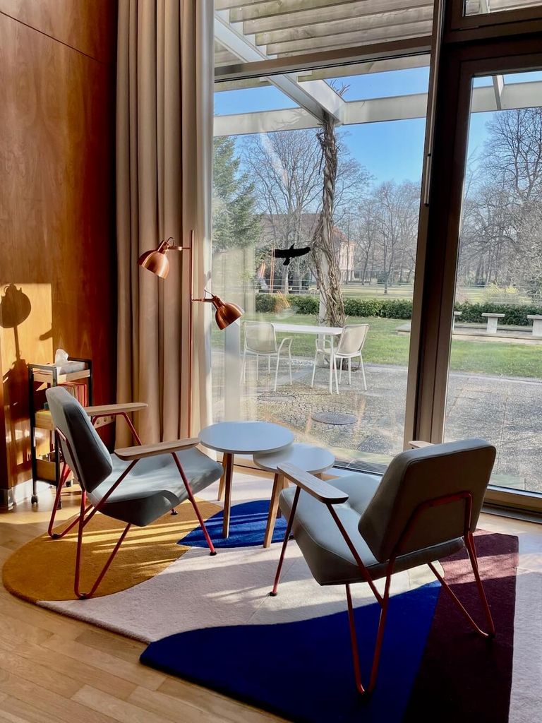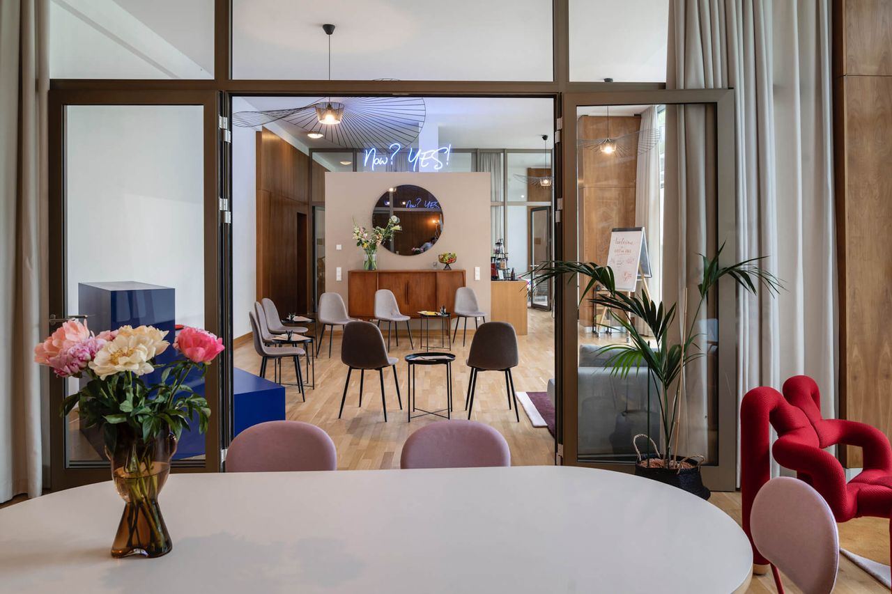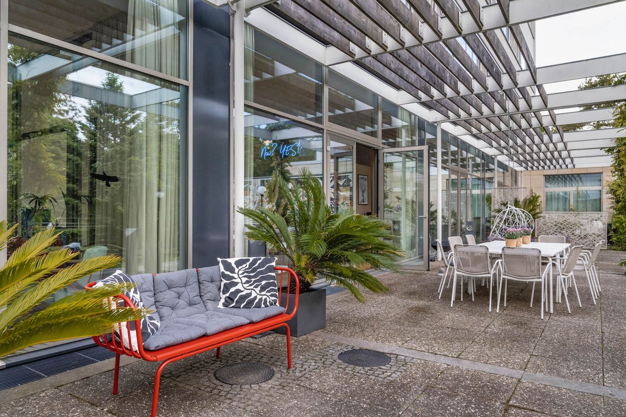 An infinite space for your creative ideas in the former guest house of the GDR government. There's a total of 180 square meters of loft space available for your productions and best of all: the unobstructed view and large terrace overlooking Schönhausen Palace Park and the castle. In this Home Studio, you will find everything you need for an inspiring and productive atmosphere: from comfortable lounge chairs and a cool workshop area to stylish hanging chairs with a wide view of the park.