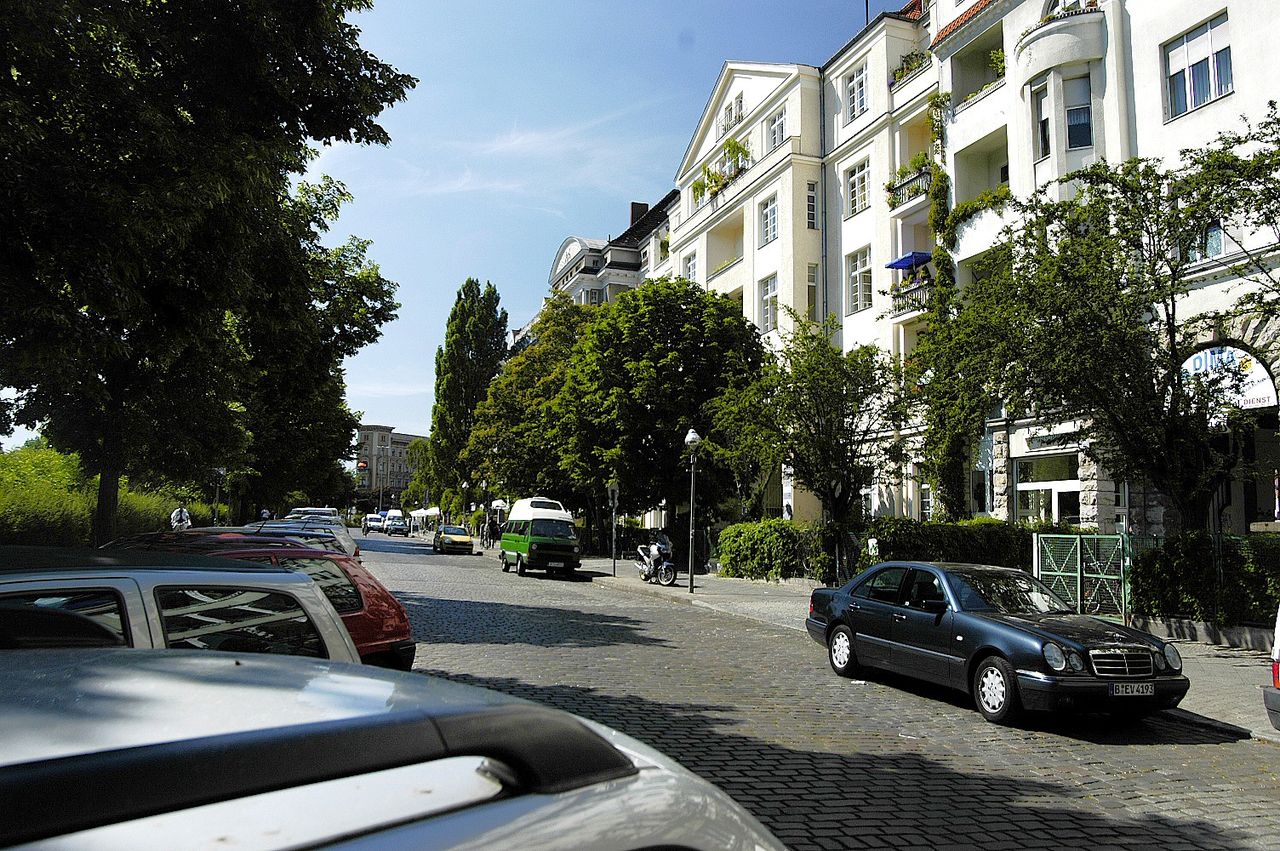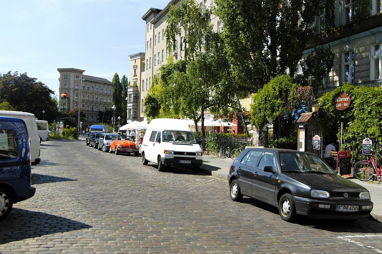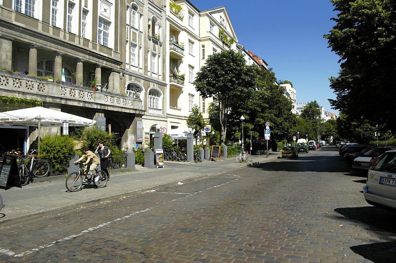 Kopfsteinpflasterstraße mit Gründerzeitbauten und romantischer Uferpromenade, tagsüber viele Jogger und Spaziergänger, viele schicke Cafés
