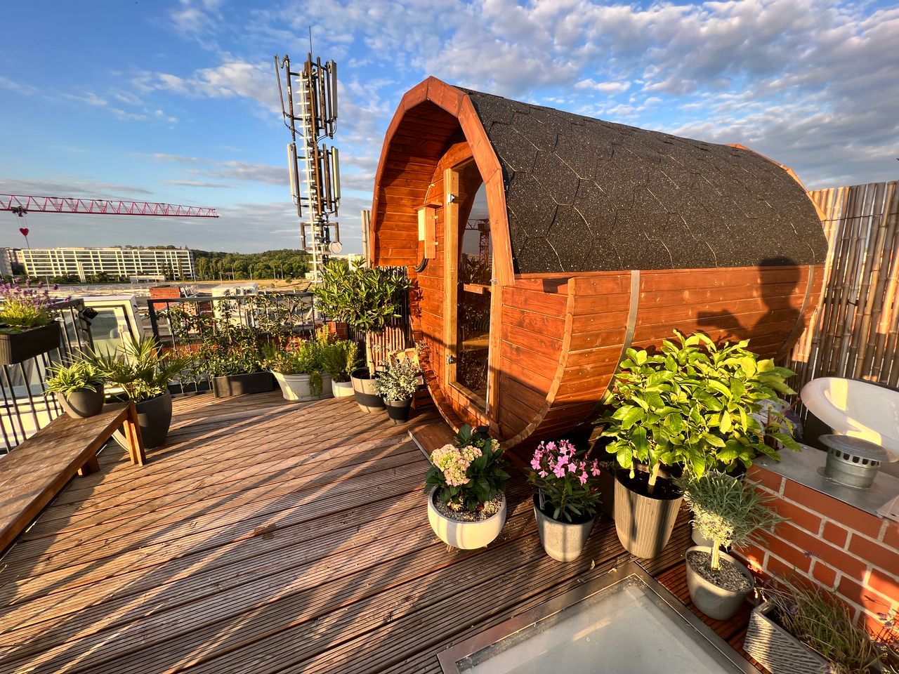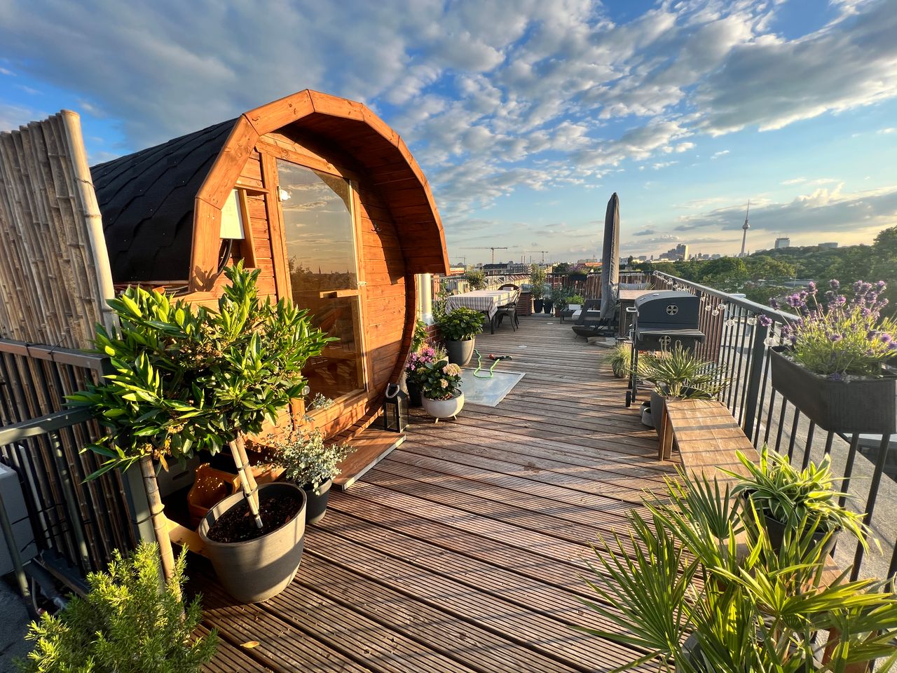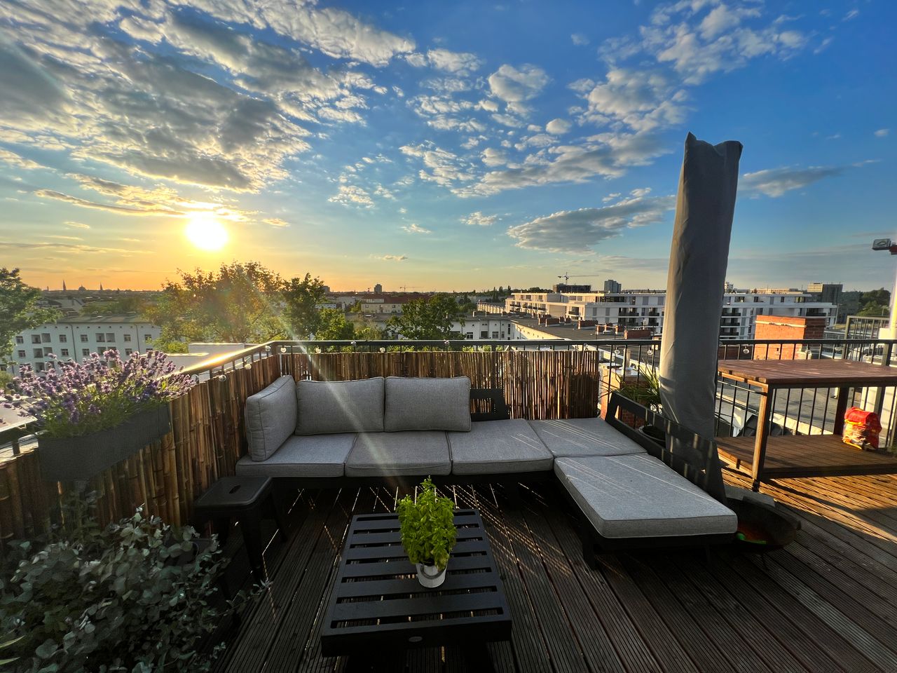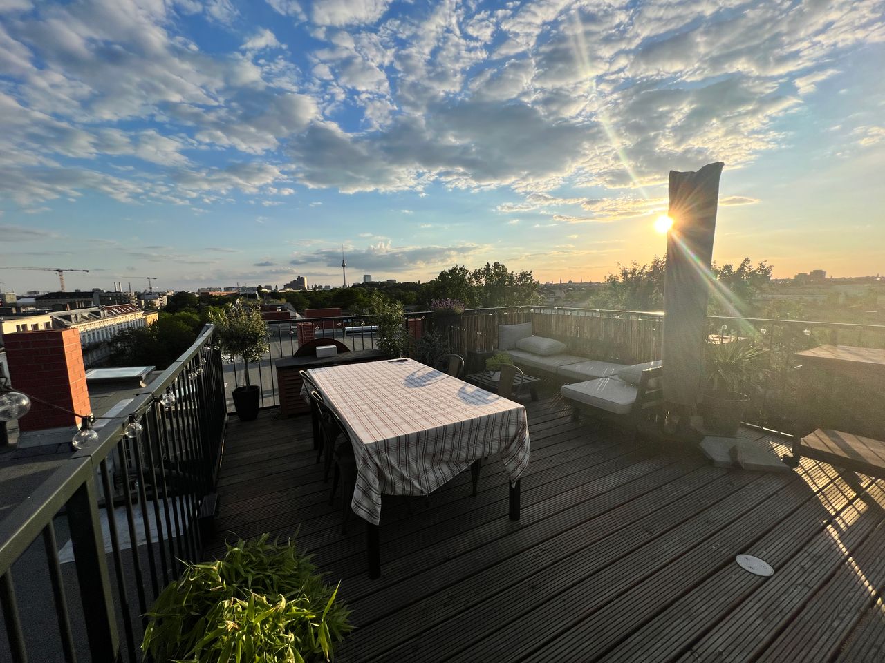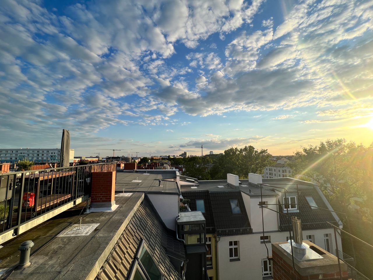 Modernes Aufdachpenthouse im Prenzlauer Berg. Insgesamt besteht die Wohnung aus 4 Zimmern, 2 Bädern, 2 Eingänge und einer Dachterrasse. Man betritt die Wohnung über das offene Wohnzimmer, mit Kamin, Oberlicht und Küchenbereich. Die restlichen Zimmer gehen von einem 15m langen Flur ab. Auf der ca. 50m2 großen Aufdachterrasse, befindet sich neben einer Sitzecke mit Lichterkette und Esstisch, auch eine Sauna. Die Wohnung befindet sich im 5 Stock und verfügt über einen Fahrstuhl.