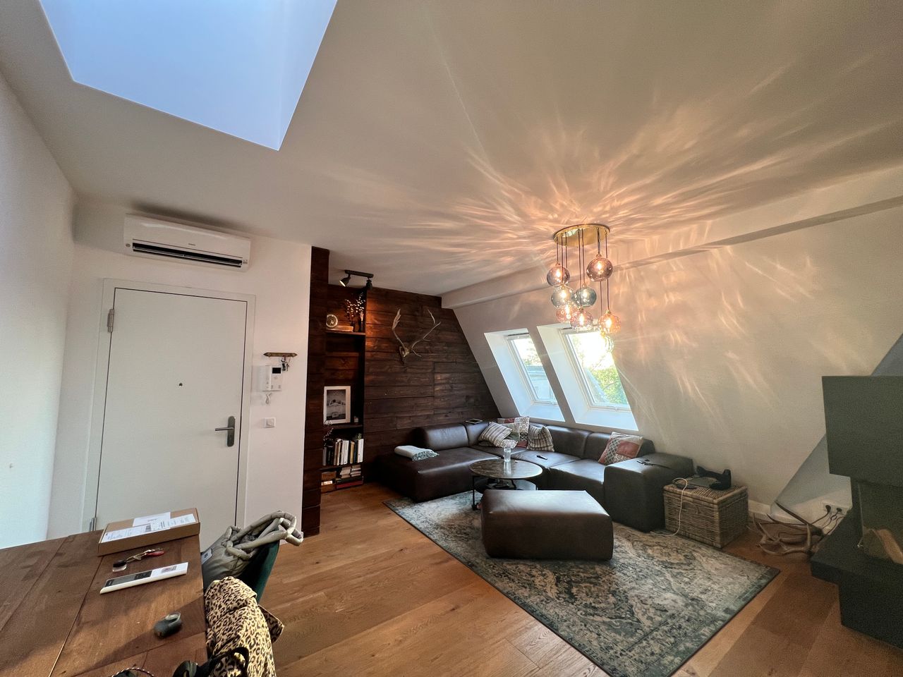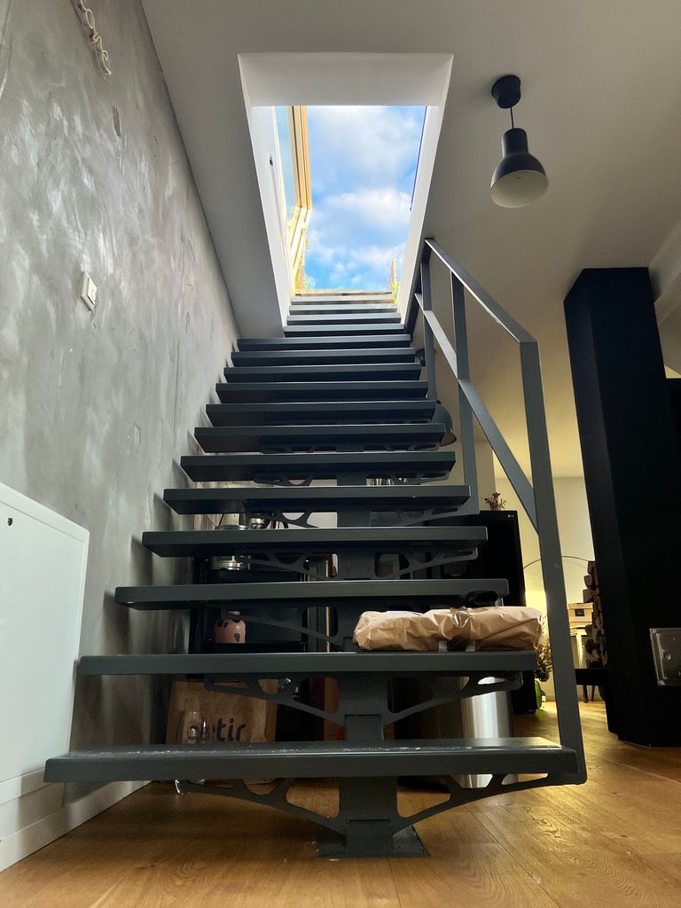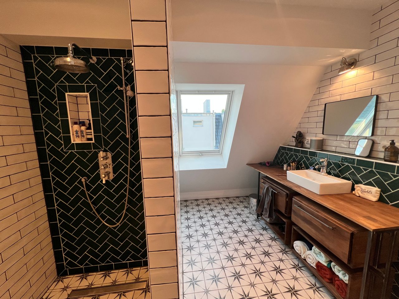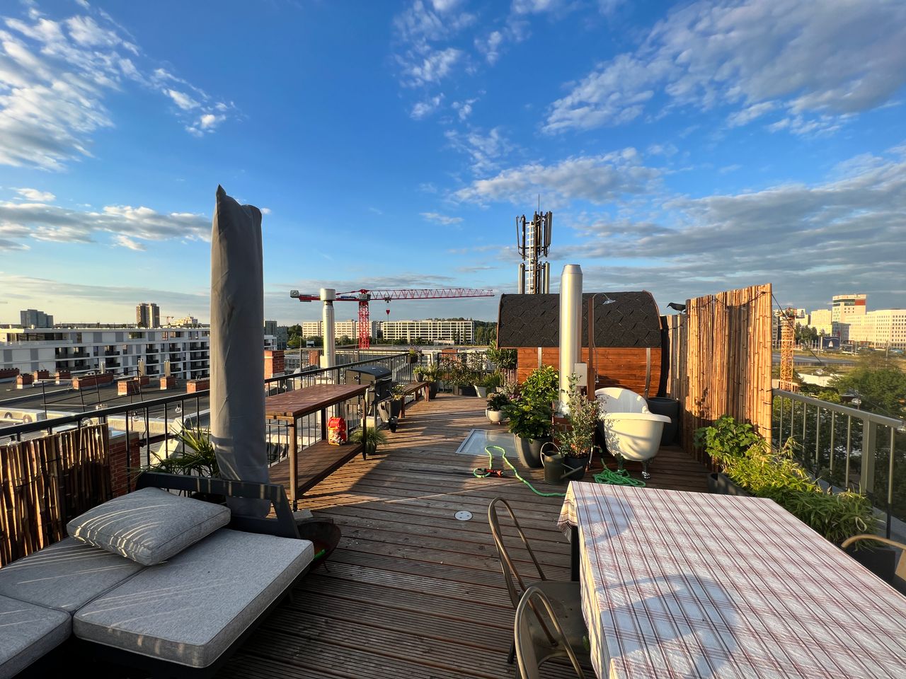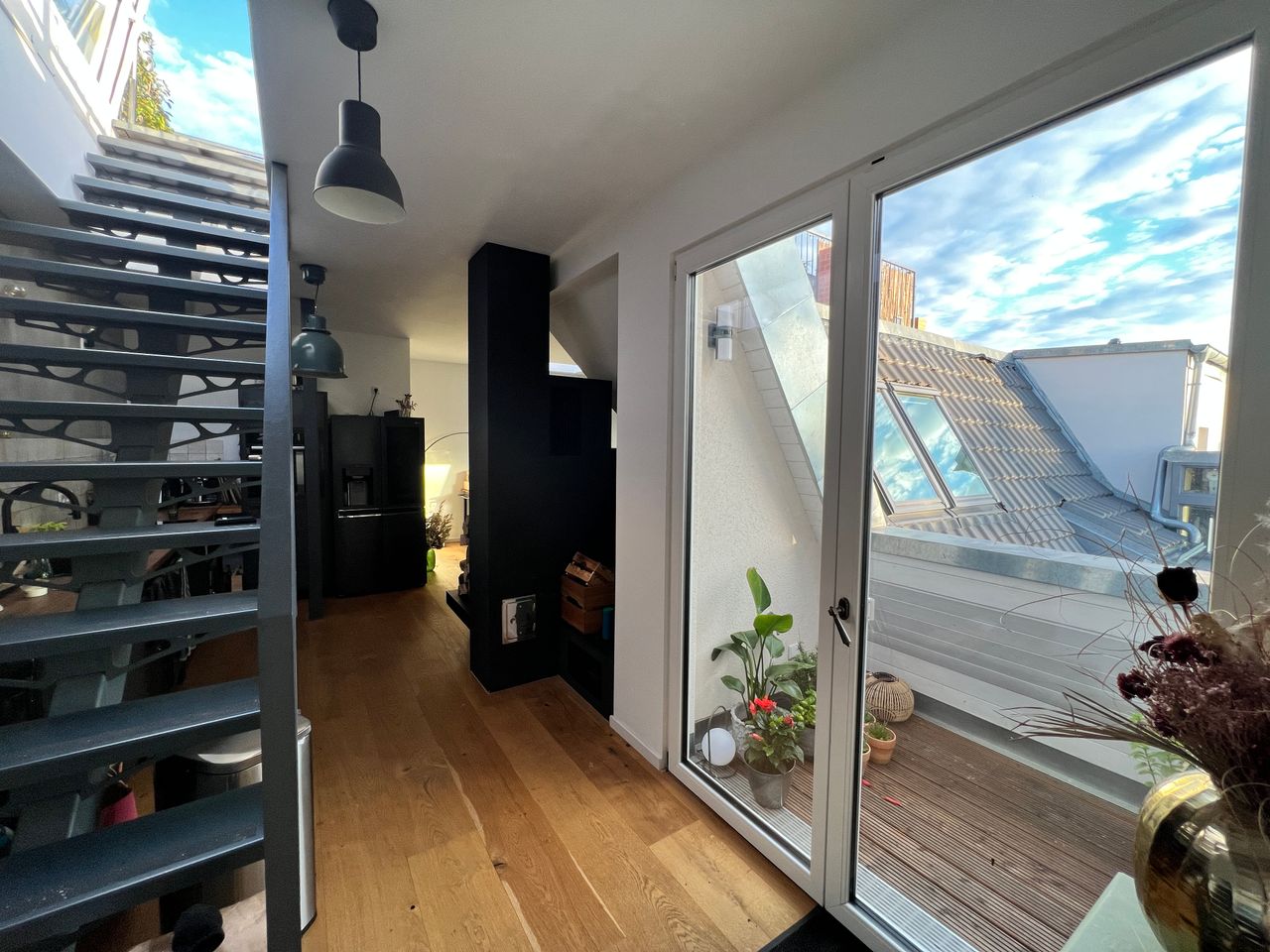 Modernes Aufdachpenthouse im Prenzlauer Berg. Insgesamt besteht die Wohnung aus 4 Zimmern, 2 Bädern, 2 Eingänge und einer Dachterrasse. Man betritt die Wohnung über das offene Wohnzimmer, mit Kamin, Oberlicht und Küchenbereich. Die restlichen Zimmer gehen von einem 15m langen Flur ab. Auf der ca. 50m2 großen Aufdachterrasse, befindet sich neben einer Sitzecke mit Lichterkette und Esstisch, auch eine Sauna. Die Wohnung befindet sich im 5 Stock und verfügt über einen Fahrstuhl.