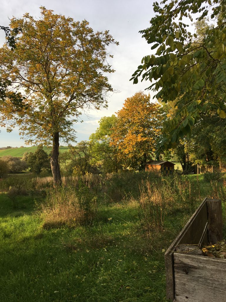 Orts-Randlage mit nur 1 direktem Nachbar. Der Blick vom Grundstück suggeriert Alleinlage. Alter Baumbestand vorhanden.