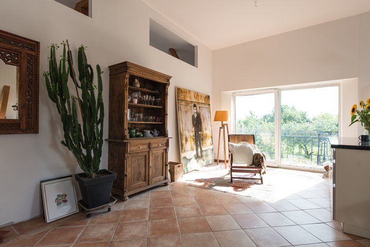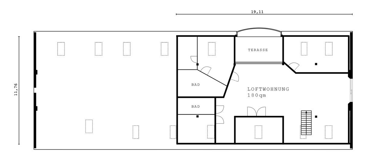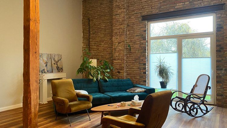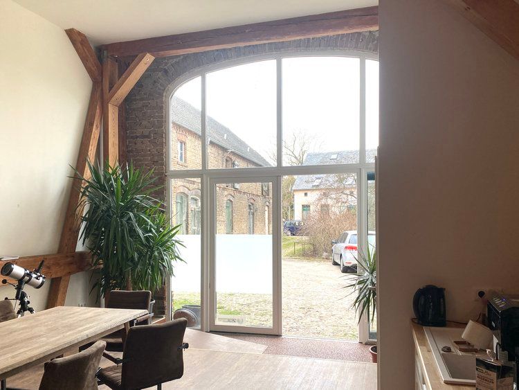 Über das Tor und den Hof gelangt man zum östlichen Stallgebäude, das komplett ausgebaut wurde und sich in drei Bereiche teilt. Das offene Studio, die etwas kleinere ebenerdige Wohnung und die Loftwohnung unterm Dach.