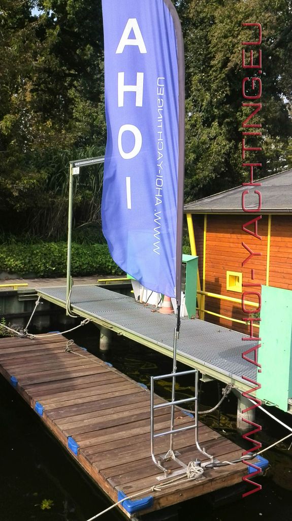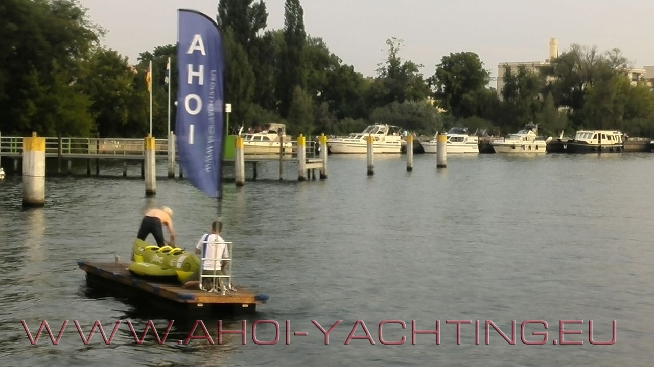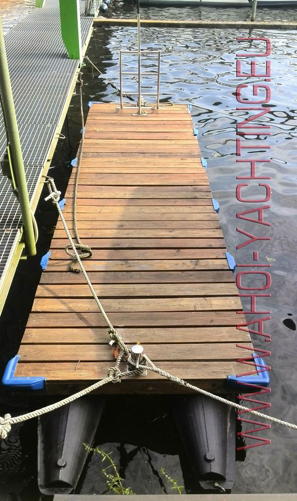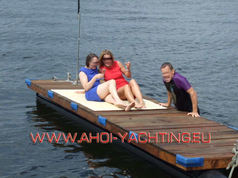 Ponton mit zwei Schwimmern aus Stahl. Flacher hölzerner Aufbau, Badeleiter und Flaggenhalter. Länge Aufbau 5,7 m, Breite 1,6 m, Länge über alles 6,3 m, Tiefgang 0,5 m Kapazität ca. 5-6 Personen. Gewicht ca. 1000 kg.
