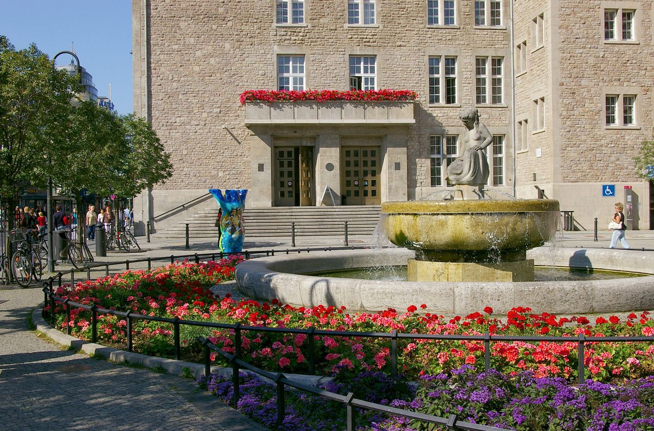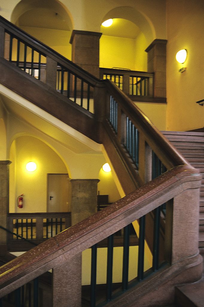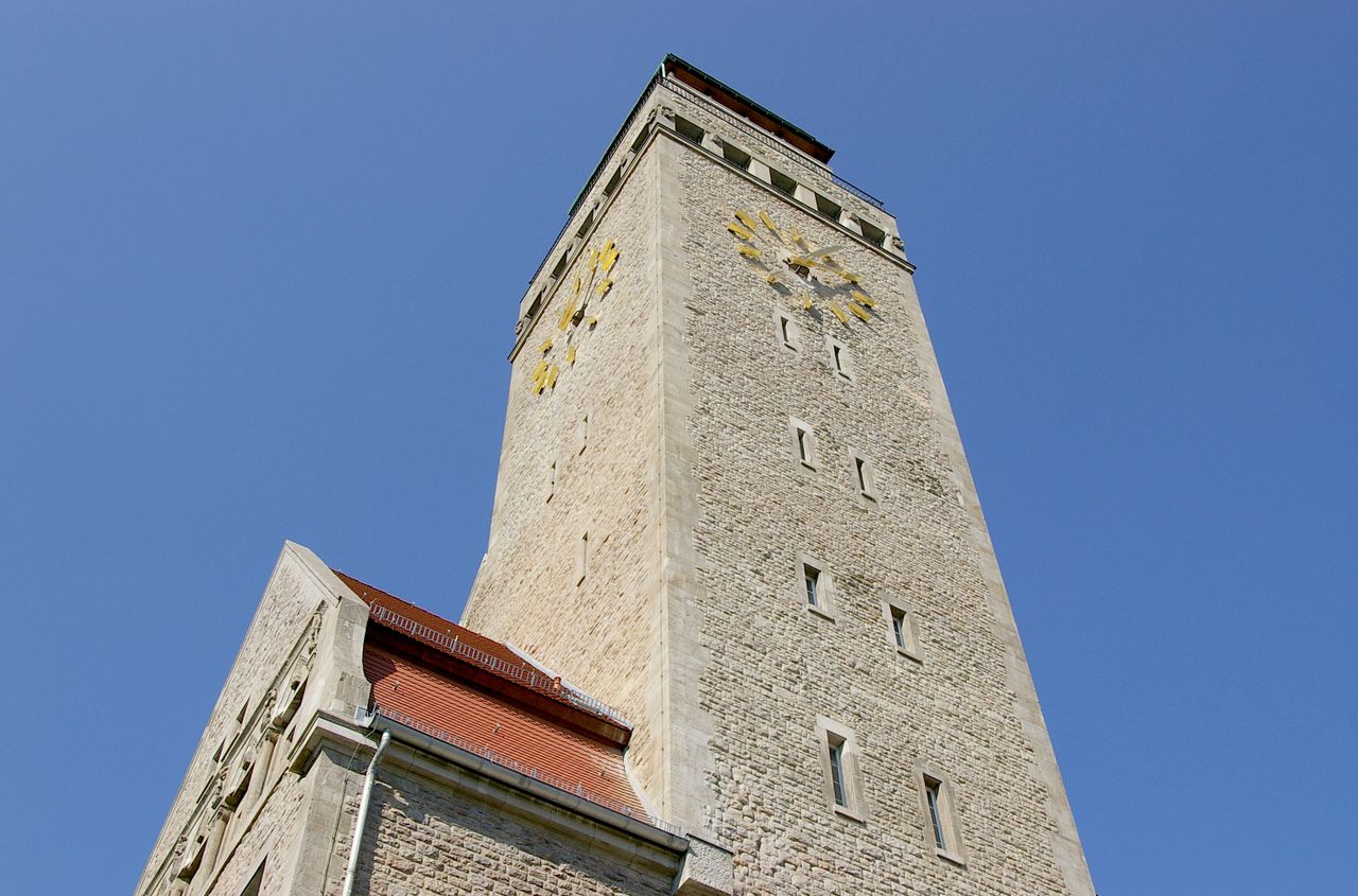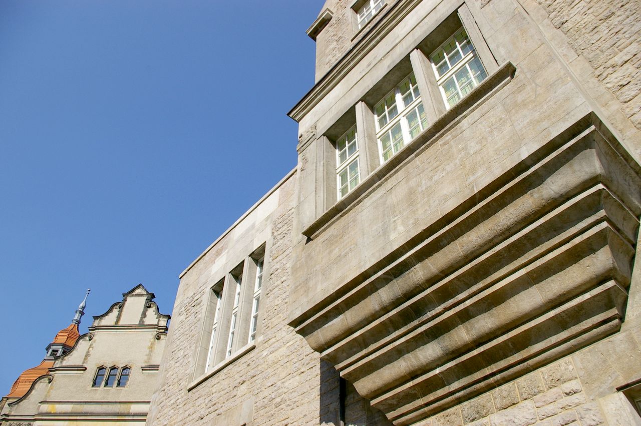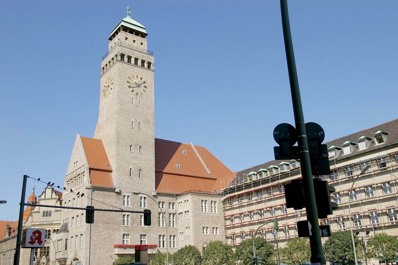 Der 1905/ 09 errichtete vier- bis fünfgeschossige Bau mit gestaffeltem Giebel ist mit monumentalisierenden Werksteinplatten verkleidet. Die Funktion der Räume des eigentlichen Rathausteils wird auch nach außen hin sichtbar gemacht: die Bogenfenster im EG deuten die Kassenräume an, während die langgestreckten Fenster des 1. und 2. Geschosses die Sitzungssäle zu erkennen geben.