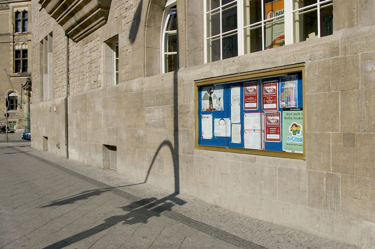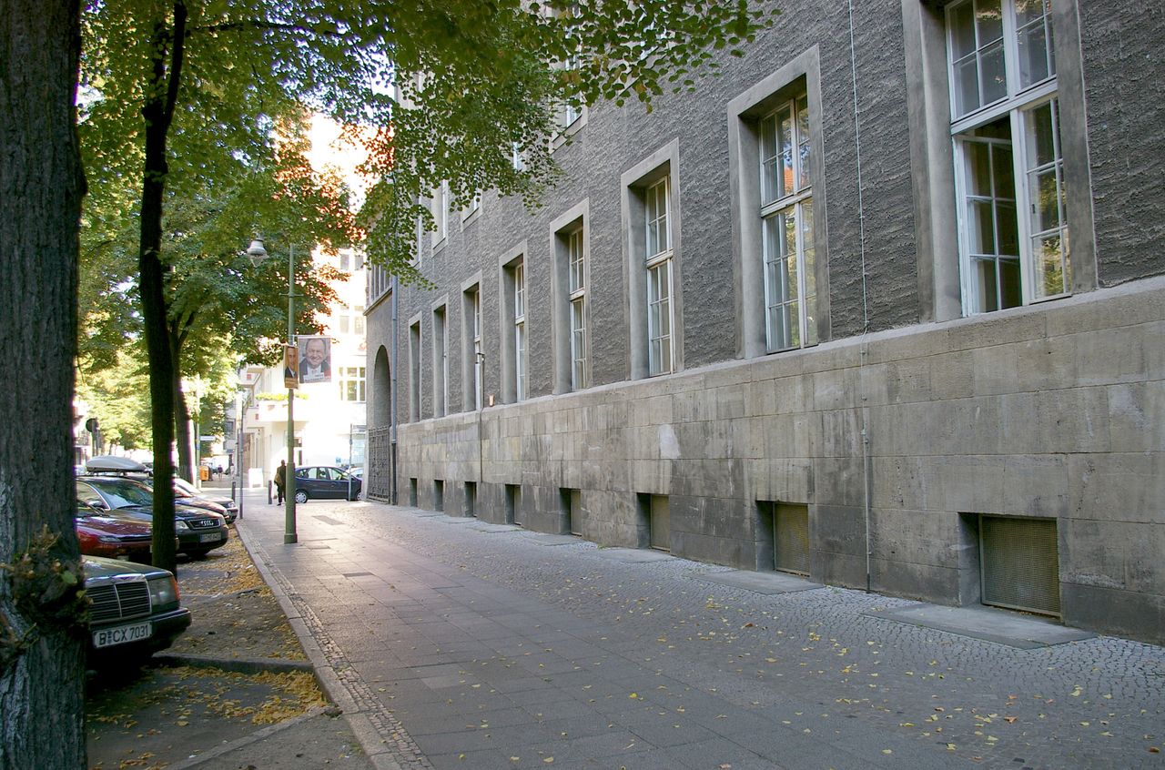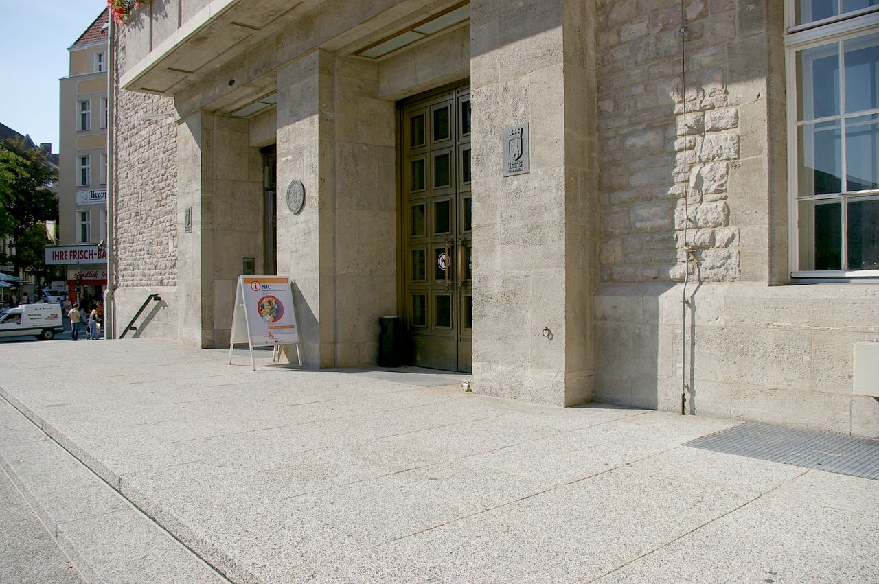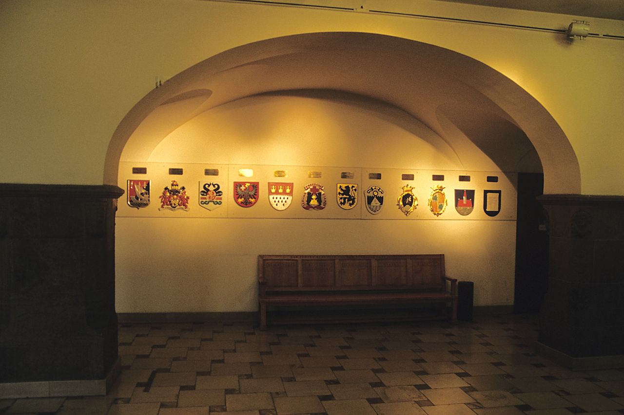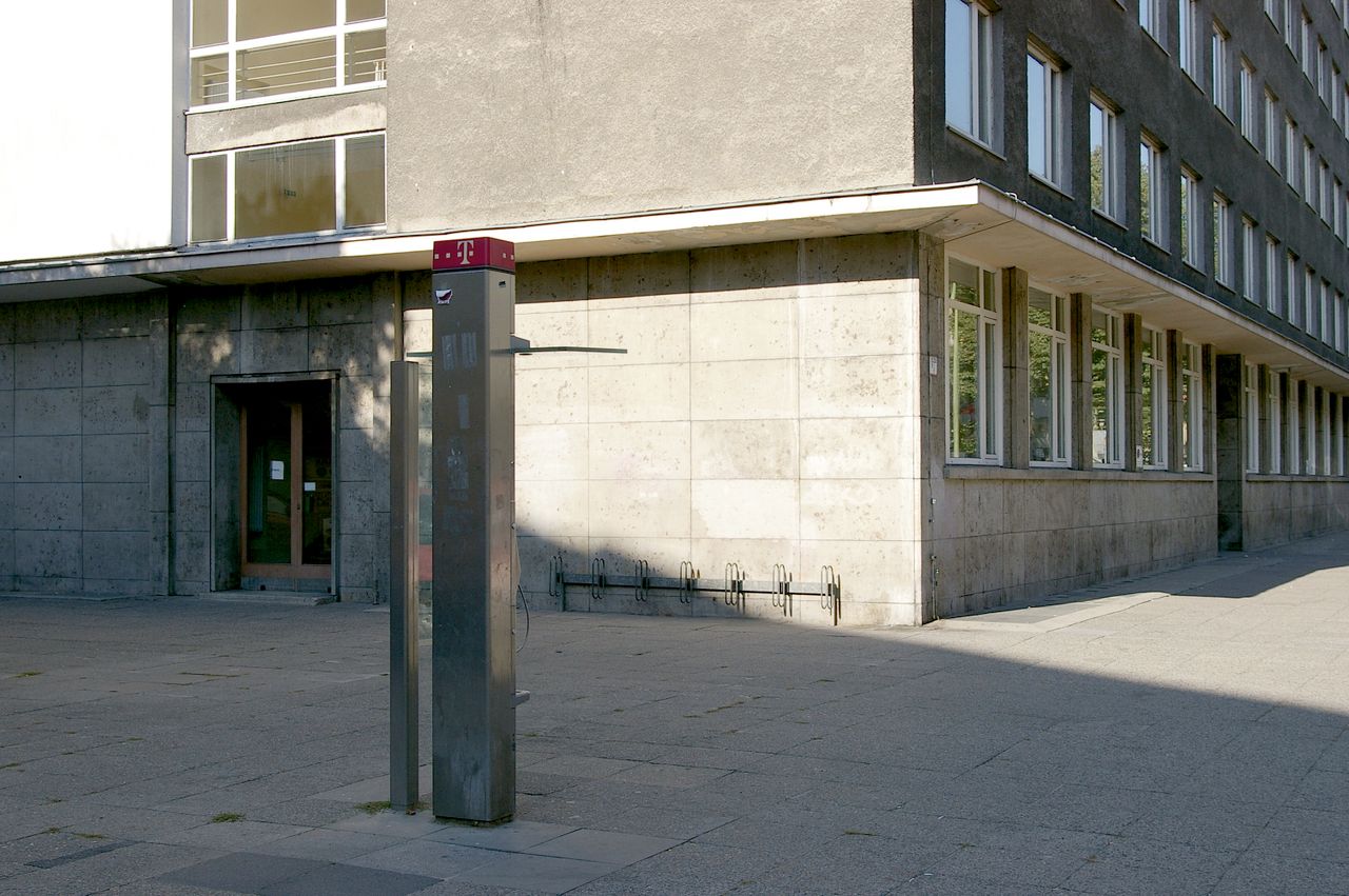 Der 1905/ 09 errichtete vier- bis fünfgeschossige Bau mit gestaffeltem Giebel ist mit monumentalisierenden Werksteinplatten verkleidet. Die Funktion der Räume des eigentlichen Rathausteils wird auch nach außen hin sichtbar gemacht: die Bogenfenster im EG deuten die Kassenräume an, während die langgestreckten Fenster des 1. und 2. Geschosses die Sitzungssäle zu erkennen geben.