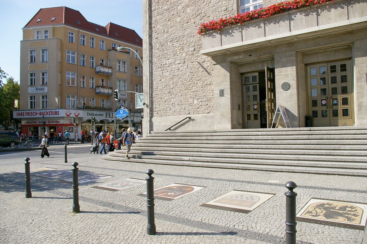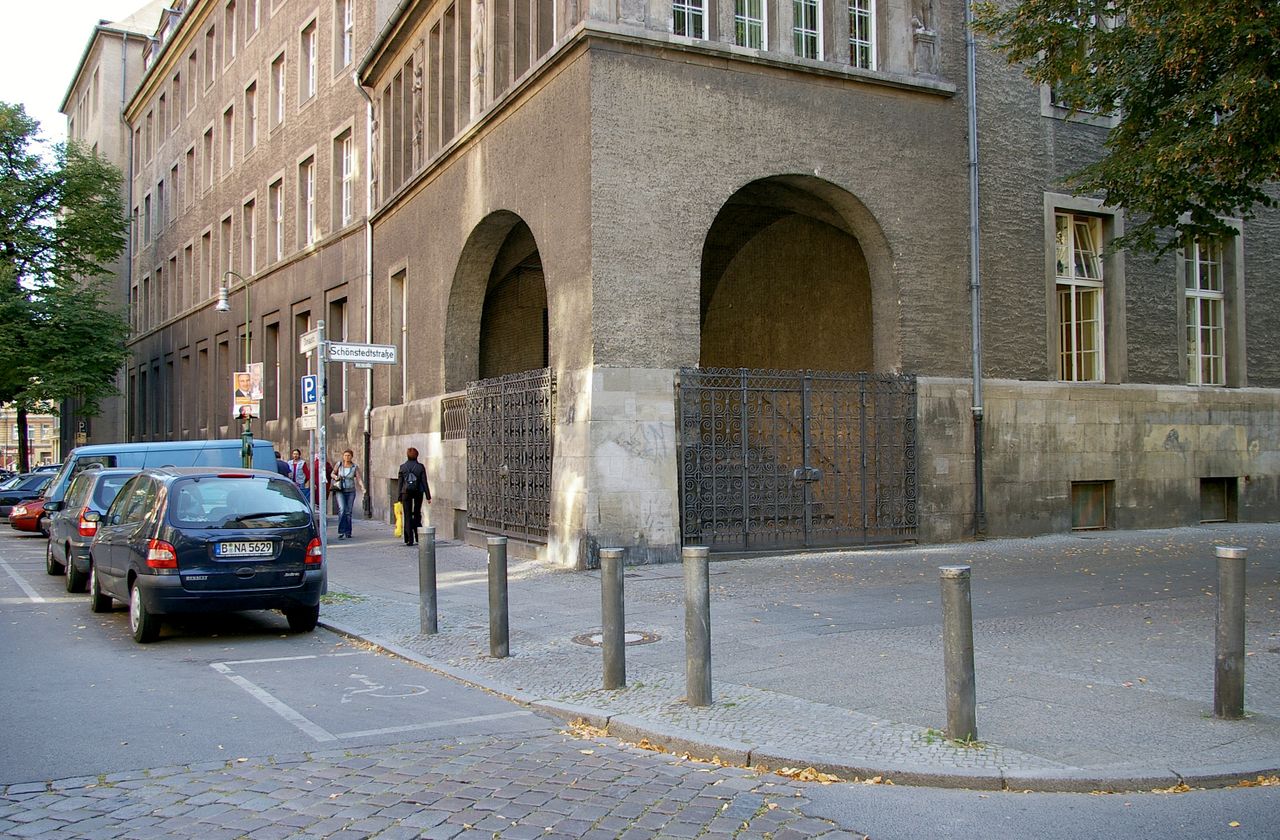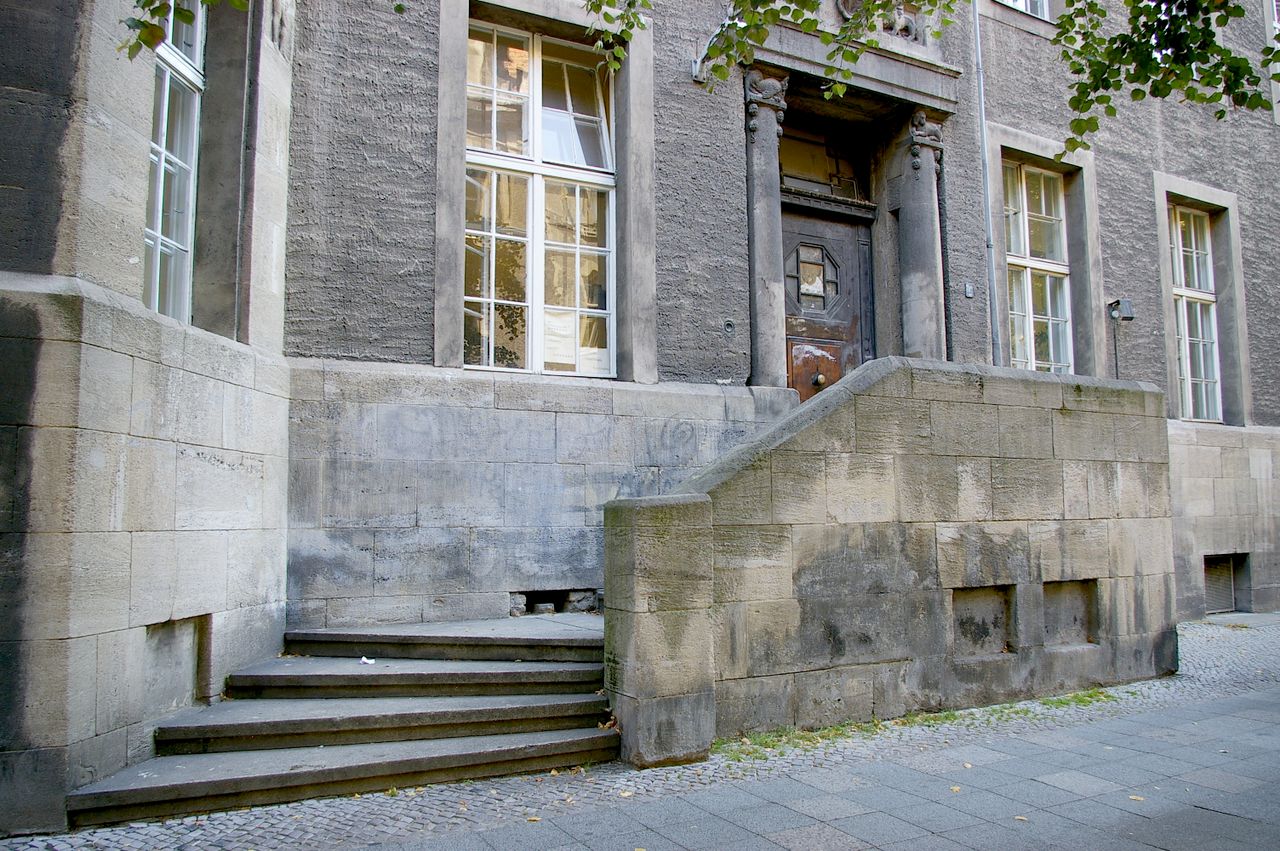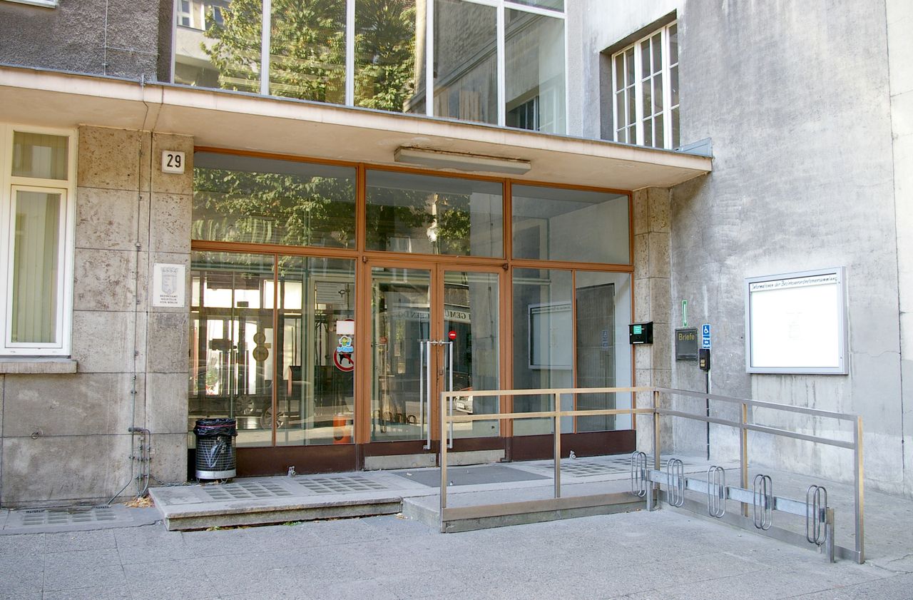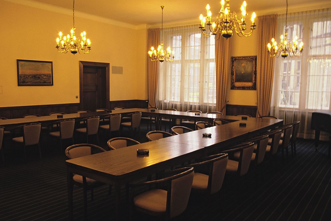 Der 1905/ 09 errichtete vier- bis fünfgeschossige Bau mit gestaffeltem Giebel ist mit monumentalisierenden Werksteinplatten verkleidet. Die Funktion der Räume des eigentlichen Rathausteils wird auch nach außen hin sichtbar gemacht: die Bogenfenster im EG deuten die Kassenräume an, während die langgestreckten Fenster des 1. und 2. Geschosses die Sitzungssäle zu erkennen geben.