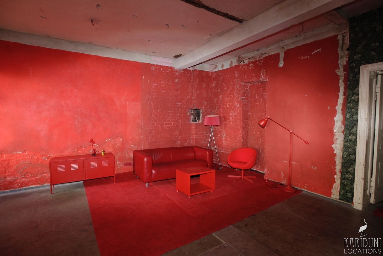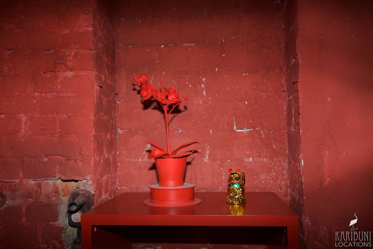 Knallrot bis zur Schmerzgrenze ist dieses Tableau-Set in einer Ecke aus Backsteinwänden, bestehend aus Schalenstuhl, Teppich und einiger weiterer Accessoires.