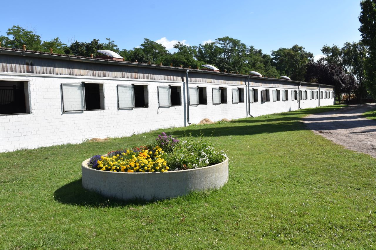 ein großer Sand- und ein Rasen-Springplatz, Galopprennbahn,Weiden, Paddocks, Longierplätze, überdachte Führmaschine und eine Longierhalle,