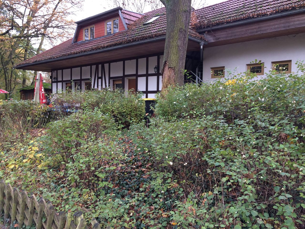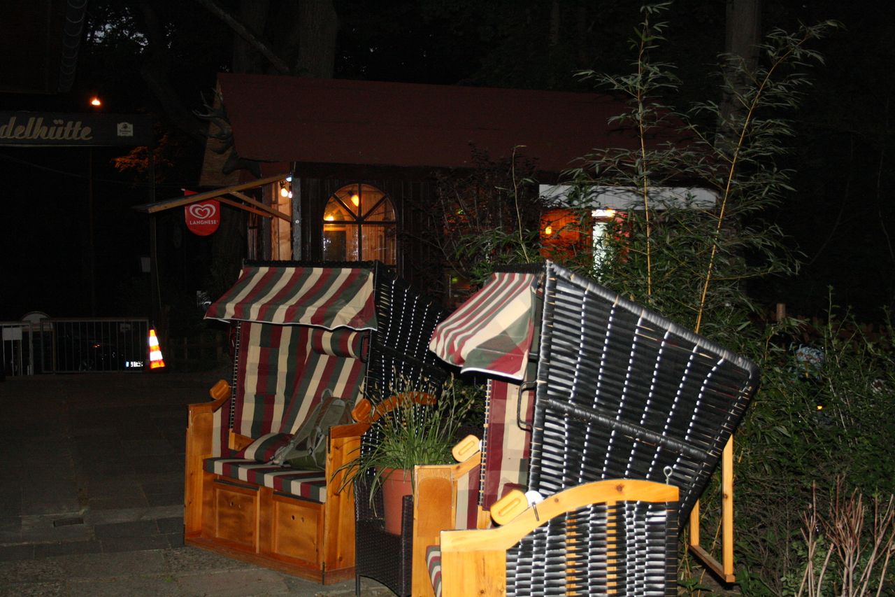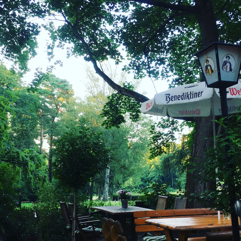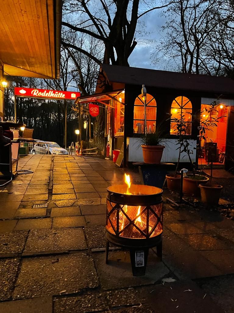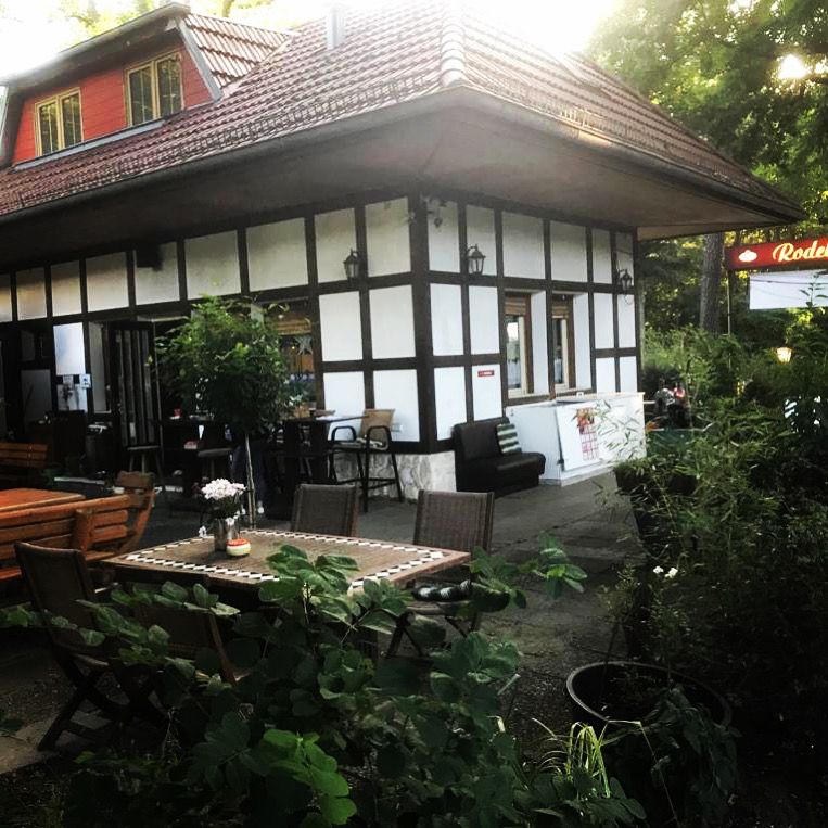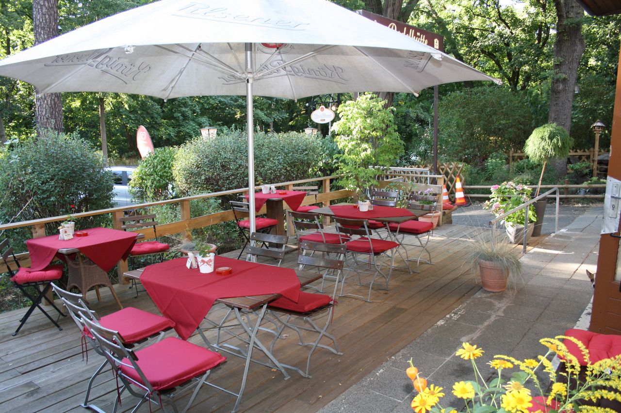 Kleines mitten im Grunewald ( Bezirk Zehlendorf) vom Wald umgebenes Restaurant/ Kneipe.Die kleine Hütte, gibt es seit 1930 und macht den Anschein eines Fachwerkhauses. Der Biergarten hat 40 Sitzplätze mit Blick auf die Rodelbahn und den Grunewald.( Wald und Wiese ) Die vordere Terrasse