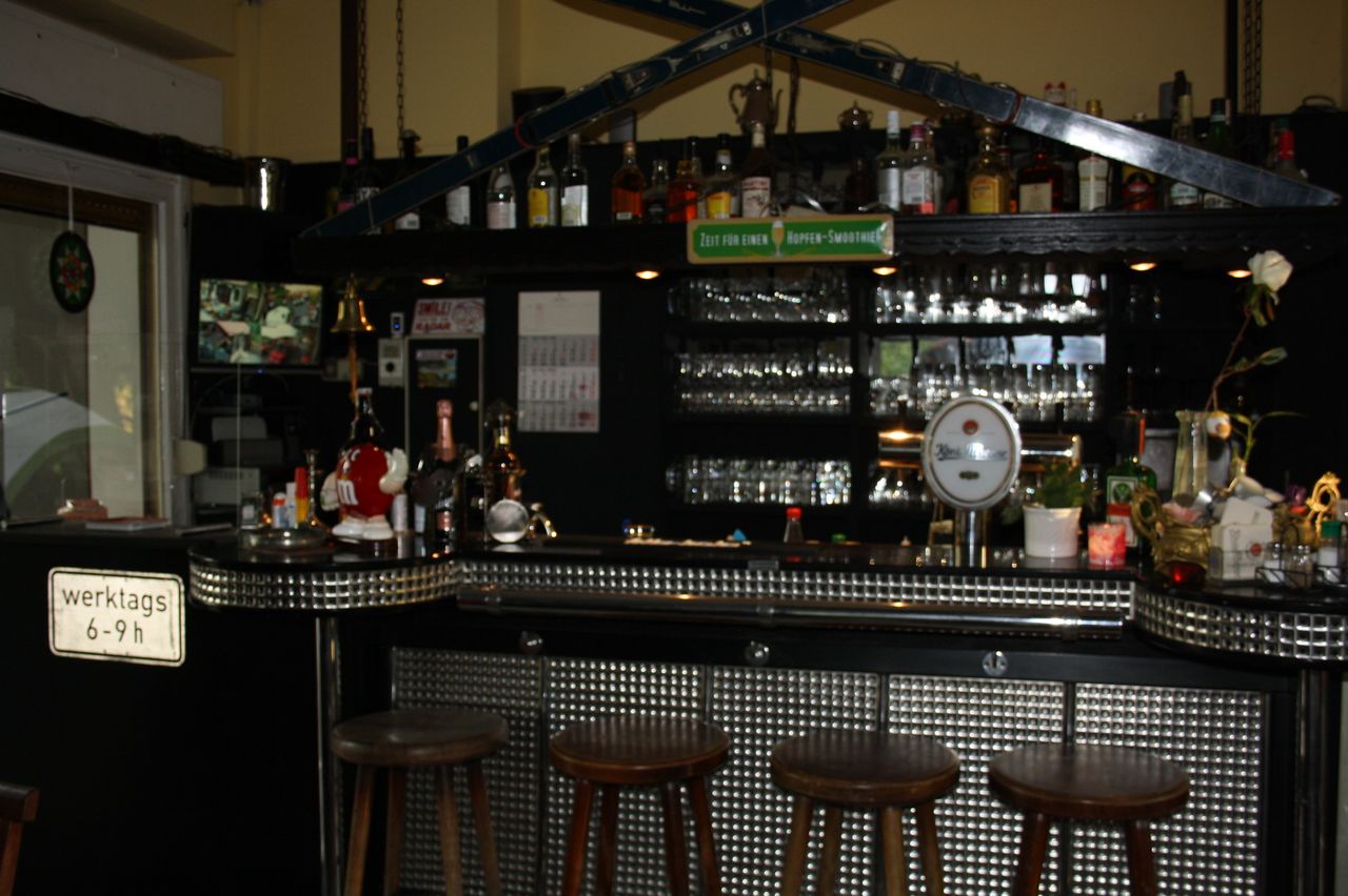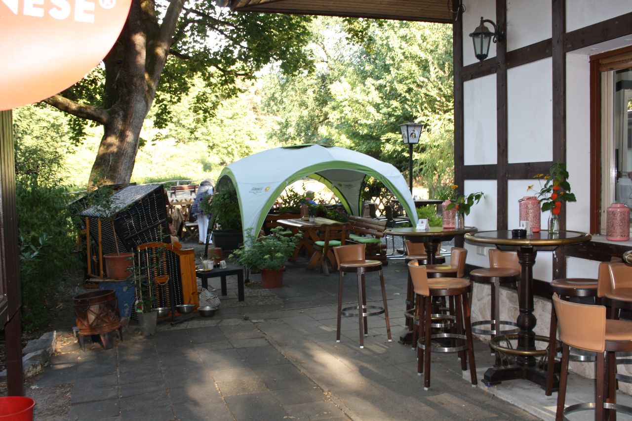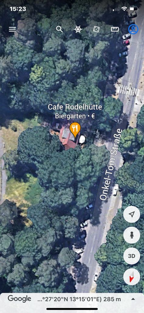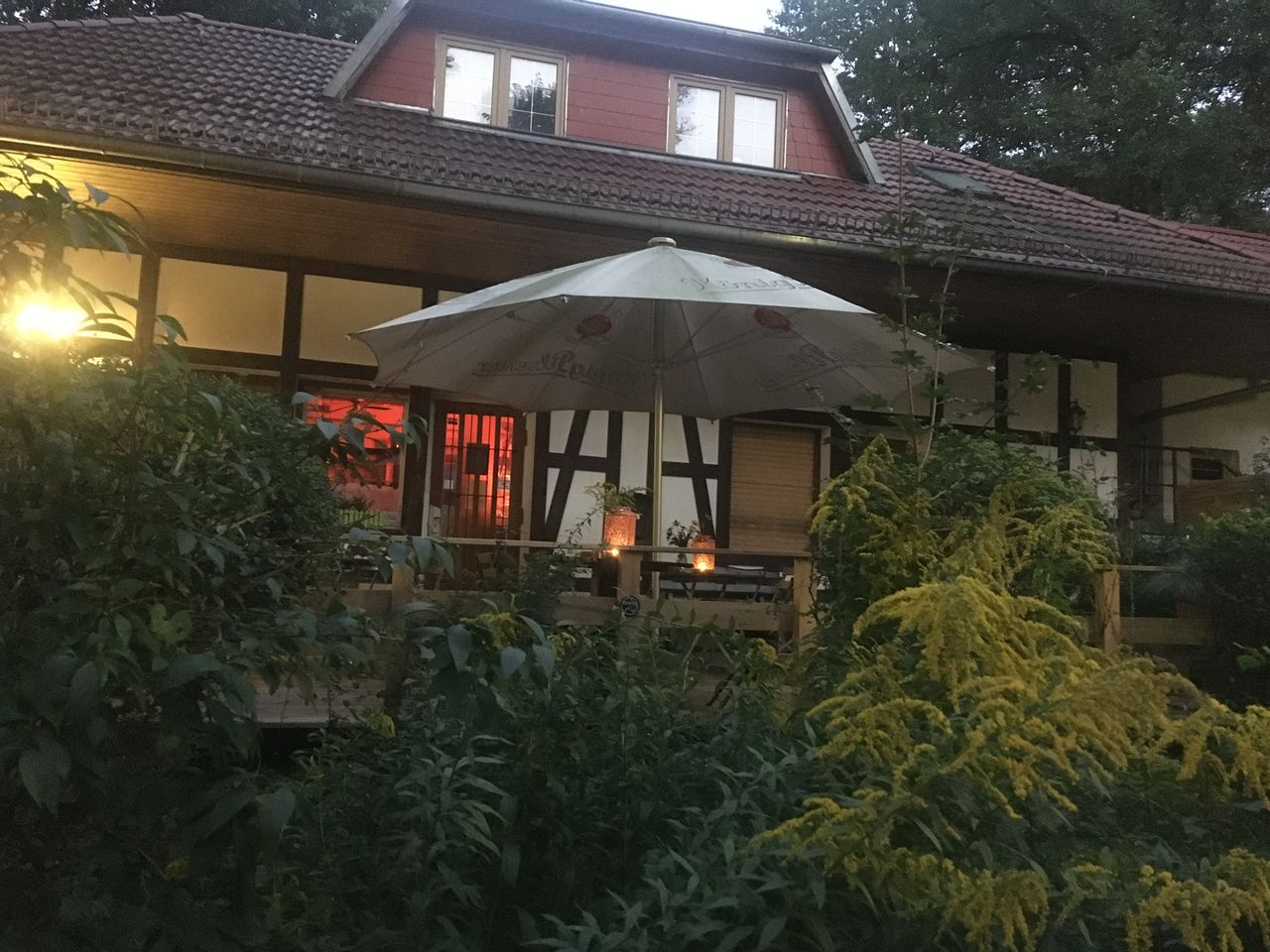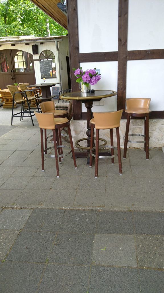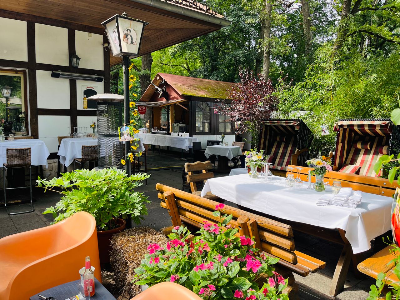 Kleines mitten im Grunewald ( Bezirk Zehlendorf) vom Wald umgebenes Restaurant/ Kneipe.Die kleine Hütte, gibt es seit 1930 und macht den Anschein eines Fachwerkhauses. Der Biergarten hat 40 Sitzplätze mit Blick auf die Rodelbahn und den Grunewald.( Wald und Wiese ) Die vordere Terrasse