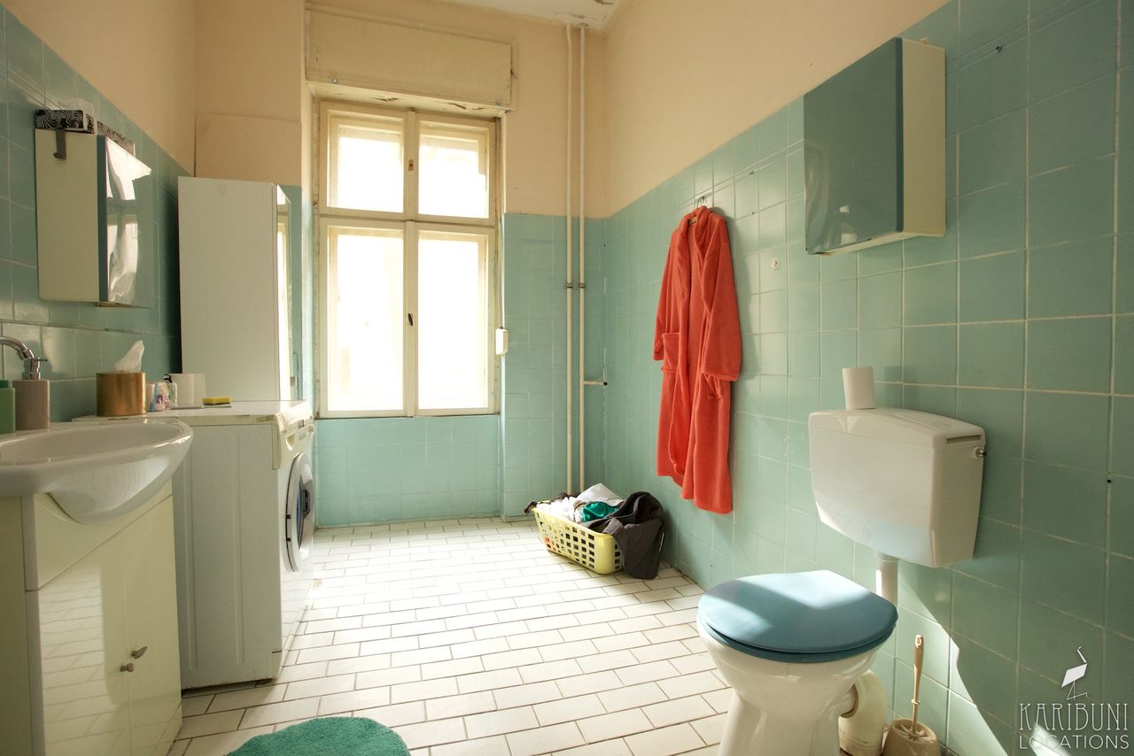 Das Bad aus unserer Renter-Wohnung hat mintfarbene Kacheln, die deutlich in die Jahre gekommen sind. Einige moderne Elemente wie das Waschbecken und der beheizte Handtuchhalter stehen im Kontrast zum grundsätzlich antiquierten Charme des Badezimmers.