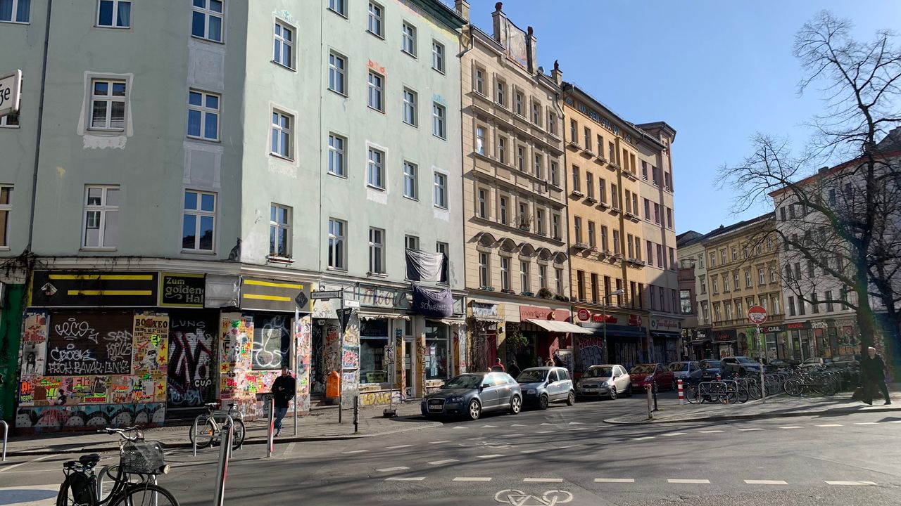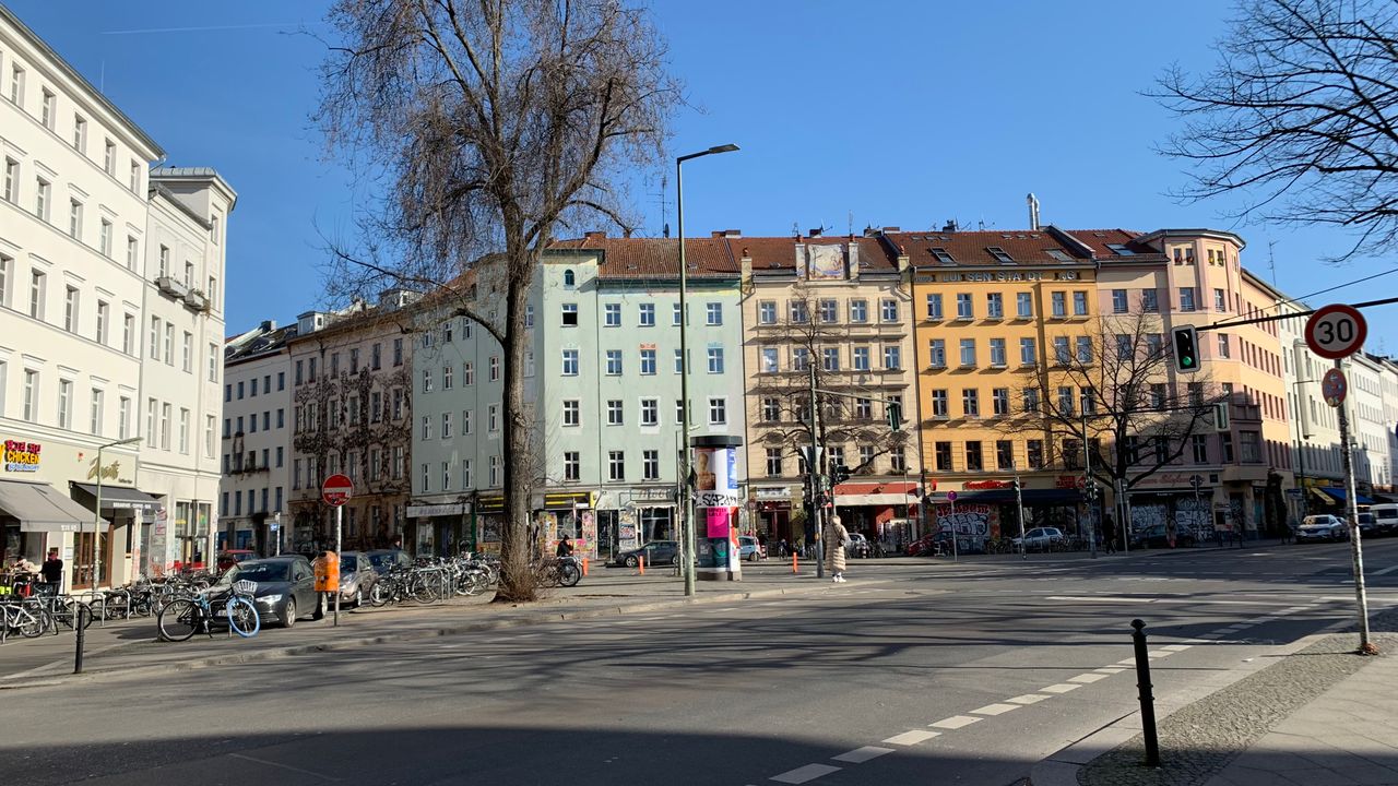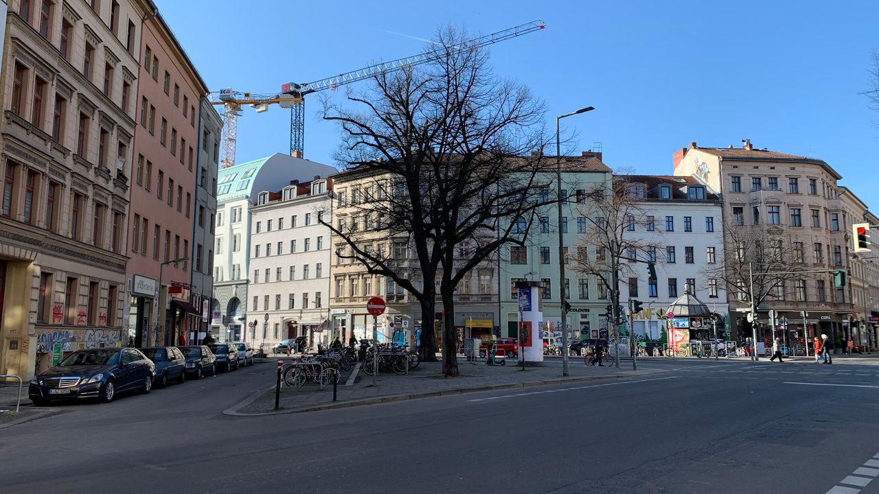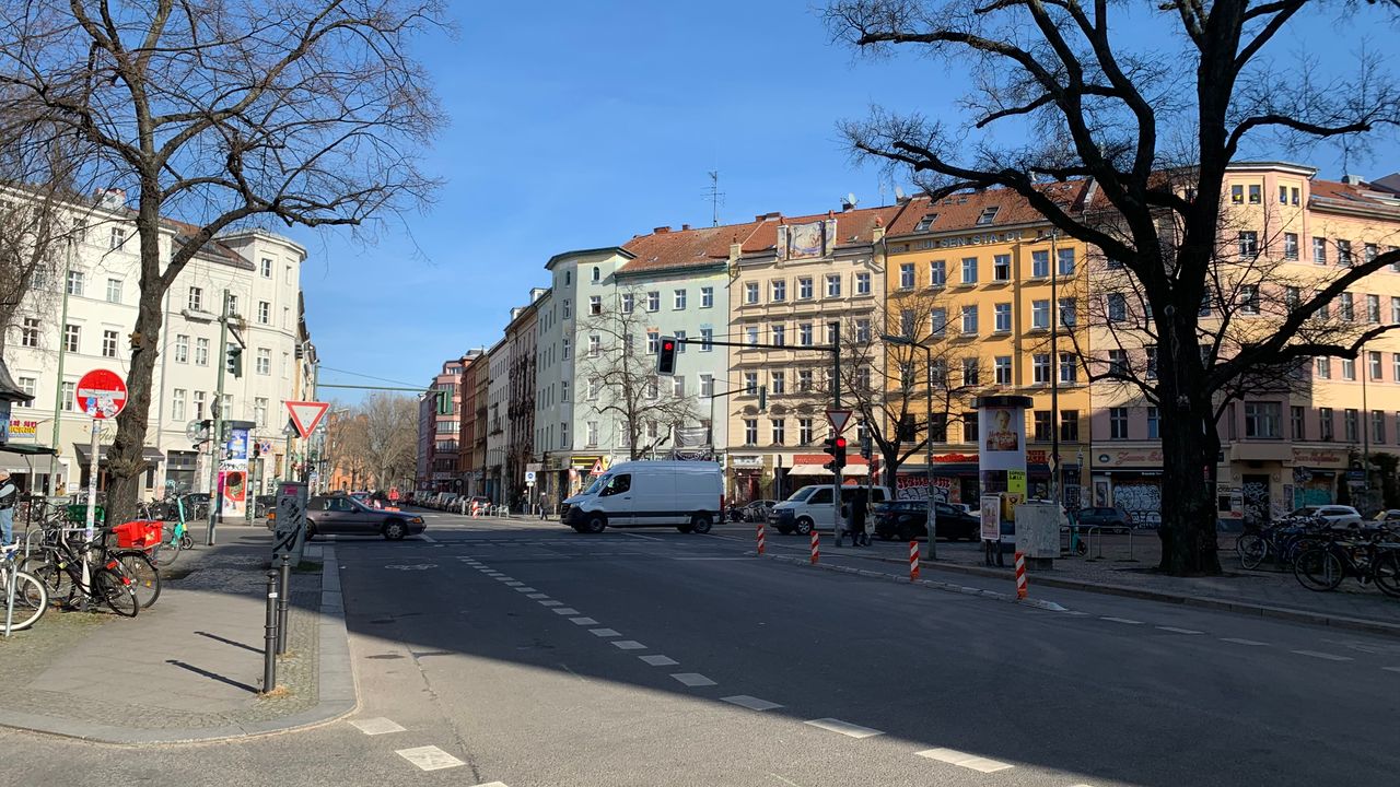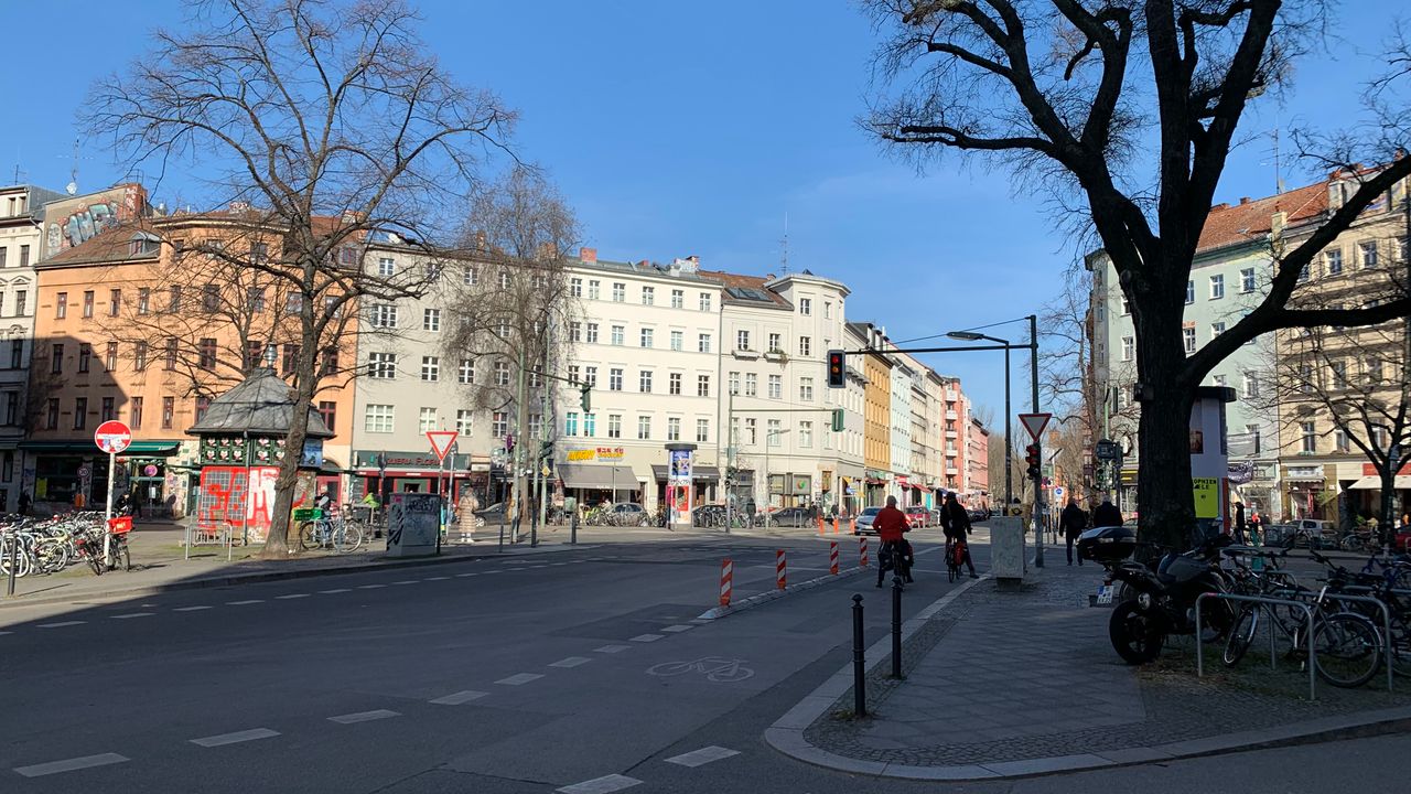 Kleiner Platz an einer Straßenkreuzung mitten im Kreuzberger Szeneviertel, viele Kneipen mit jungem Publikum, viele türkische Läden und Cafés
