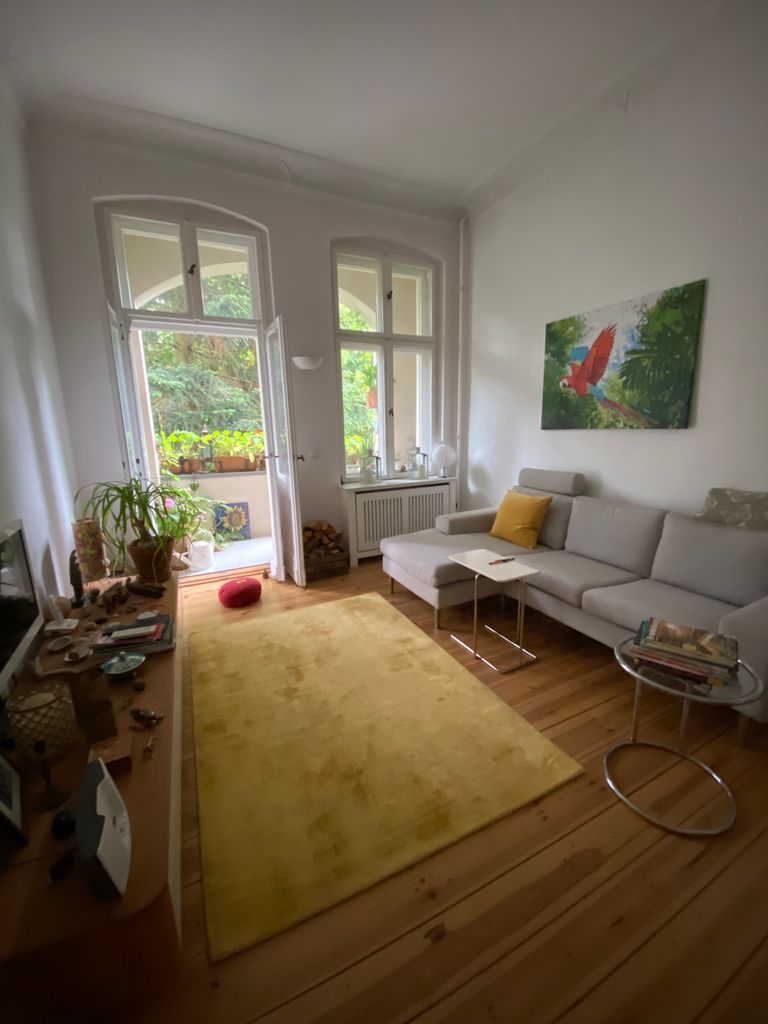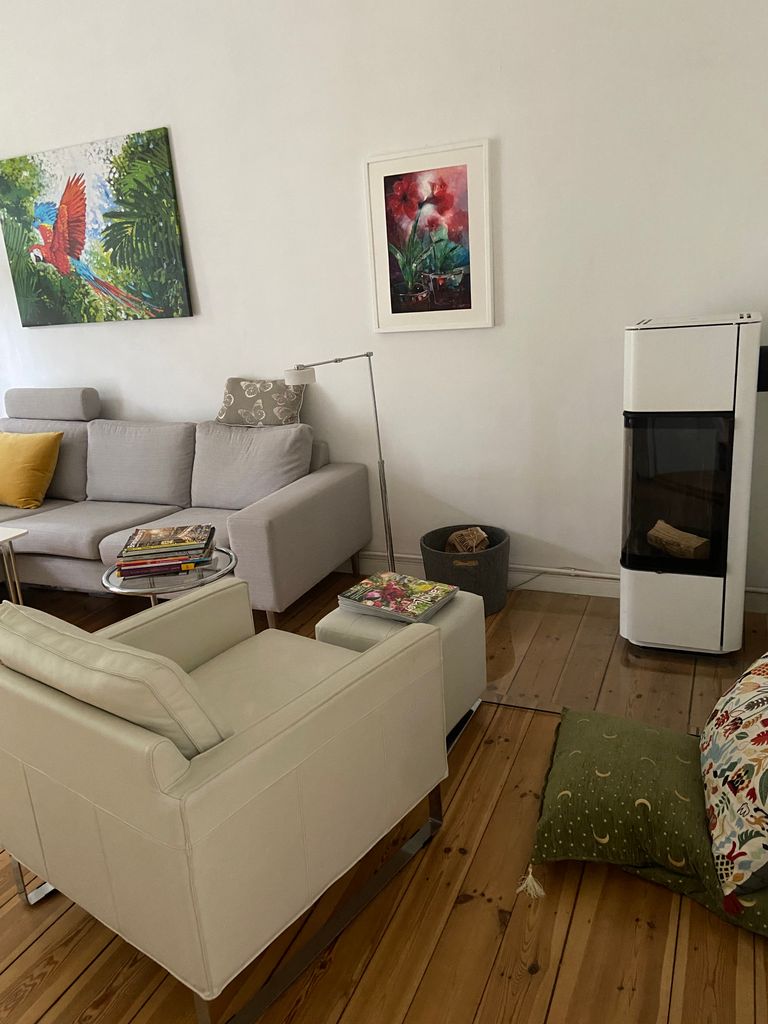 Romantische Dreizimmerwohnung im denkmalgeschützten Mehrfamilienhaus. Das Haus befindet sich in einer ruhigen, mit Linden versehenen Straße. Die Wohnung hat einen kleinen romantischen Balkon, ein Wohnzimmer mit einem weißen Kamin (zwei Sichtfenster), ein Schlafzimmer und einen Yogaraum. In der Küche kann man sitzen, das Bad hat sowohl eine Dusche als auch ein Bad. Alle Räume, bis auf das Wohnzimmer, haben eine Südwestausrichtung. Im Wohnzimmer scheint im Sommer bis 11 Uhr die Sonne (Ostseite).