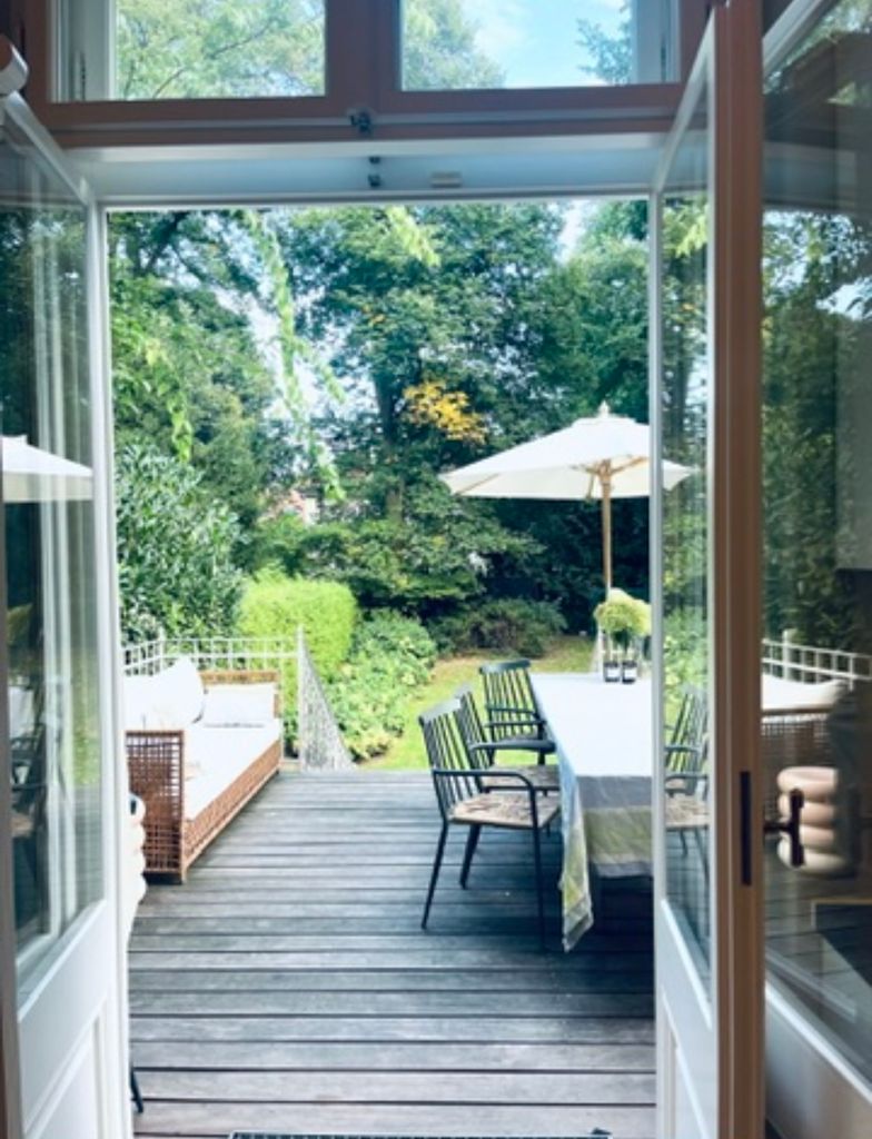 Es handelt sich um eine rosafarbene, grosszügig geschnittene Villa. Im Hochparterre befinden sich eine große Küche mit anschließender Terrasse und Zugang zum sehr großen Garten., Wohnzimmer, Esszimmer mit Flügeltüren verbunden, einem Büro, einem Fernsehzimmer und einem Gäste-WC. Außerdem gibt es eine weitere Terrasse nach vorne hin. Oben befinden sich 5 Schlafzimmer und 2 Bäder (eins davon en-suite), im Souterrain gibt es einen Kellerraum und einen Gästebereich mit großer Garderobe, Schlafzimmer und Gästebad.