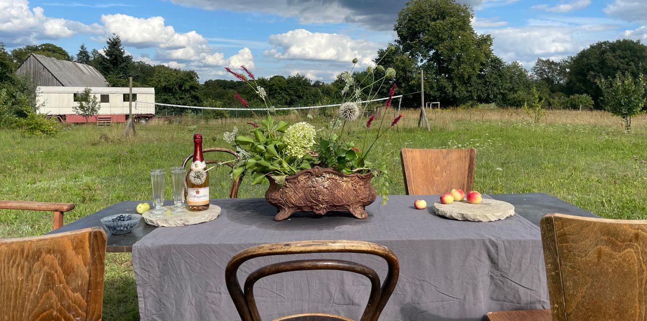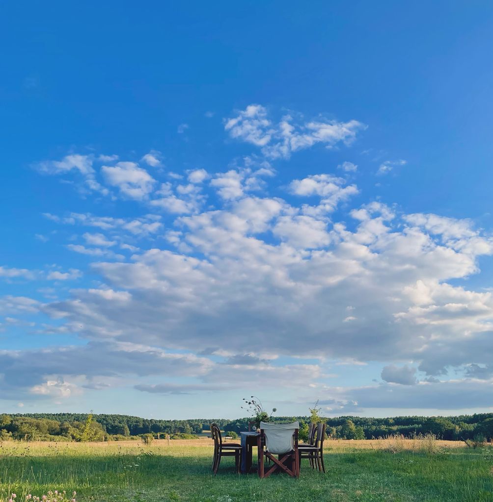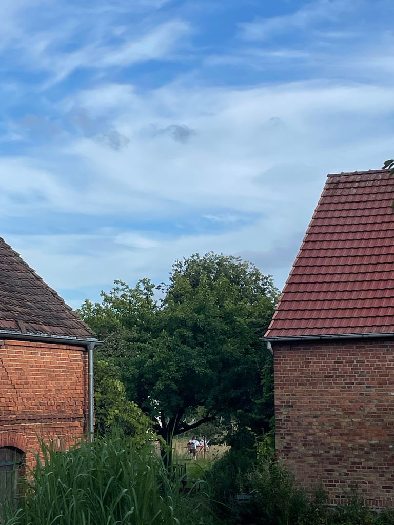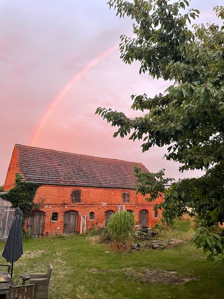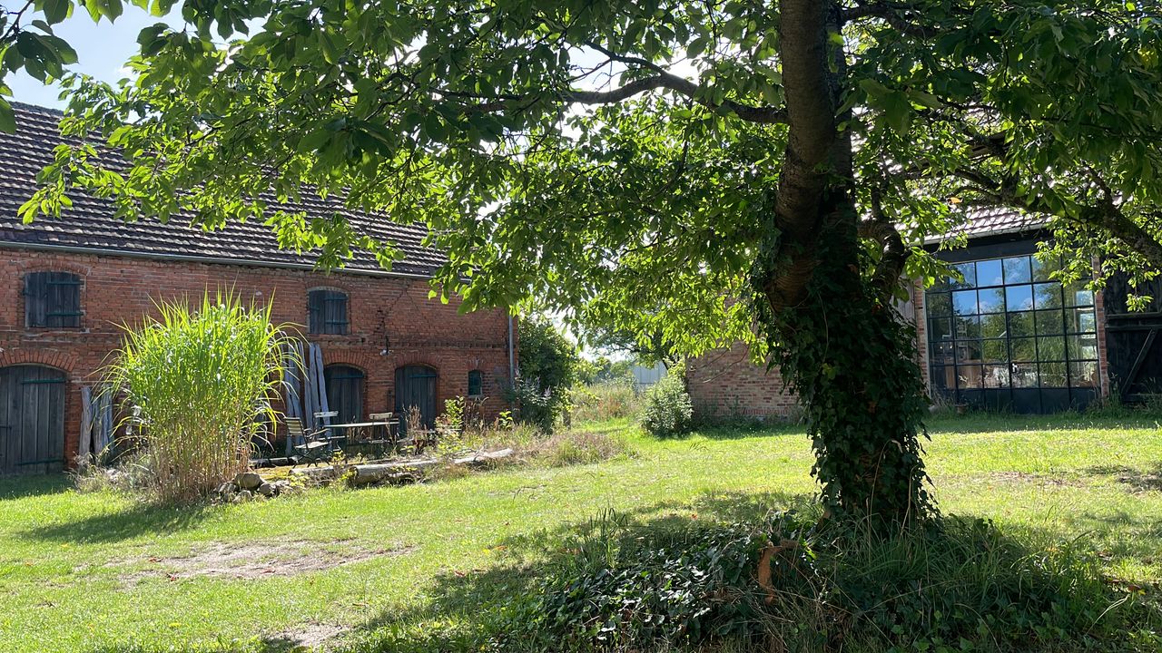4-Seithof mit Wiese und unverbautem Weitblick, Außenaufnahmen möglich, nach Absprache für kl. Produktionen auch in der Scheune oder im Zirkuswagen möglich, keine Parkplätze auf dem Hof, aber fast nebenan