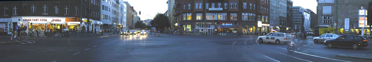 Verkehrsreiche Straßenkreuzung, verschiedene Baustile, Wohn- und Geschäftshäuser