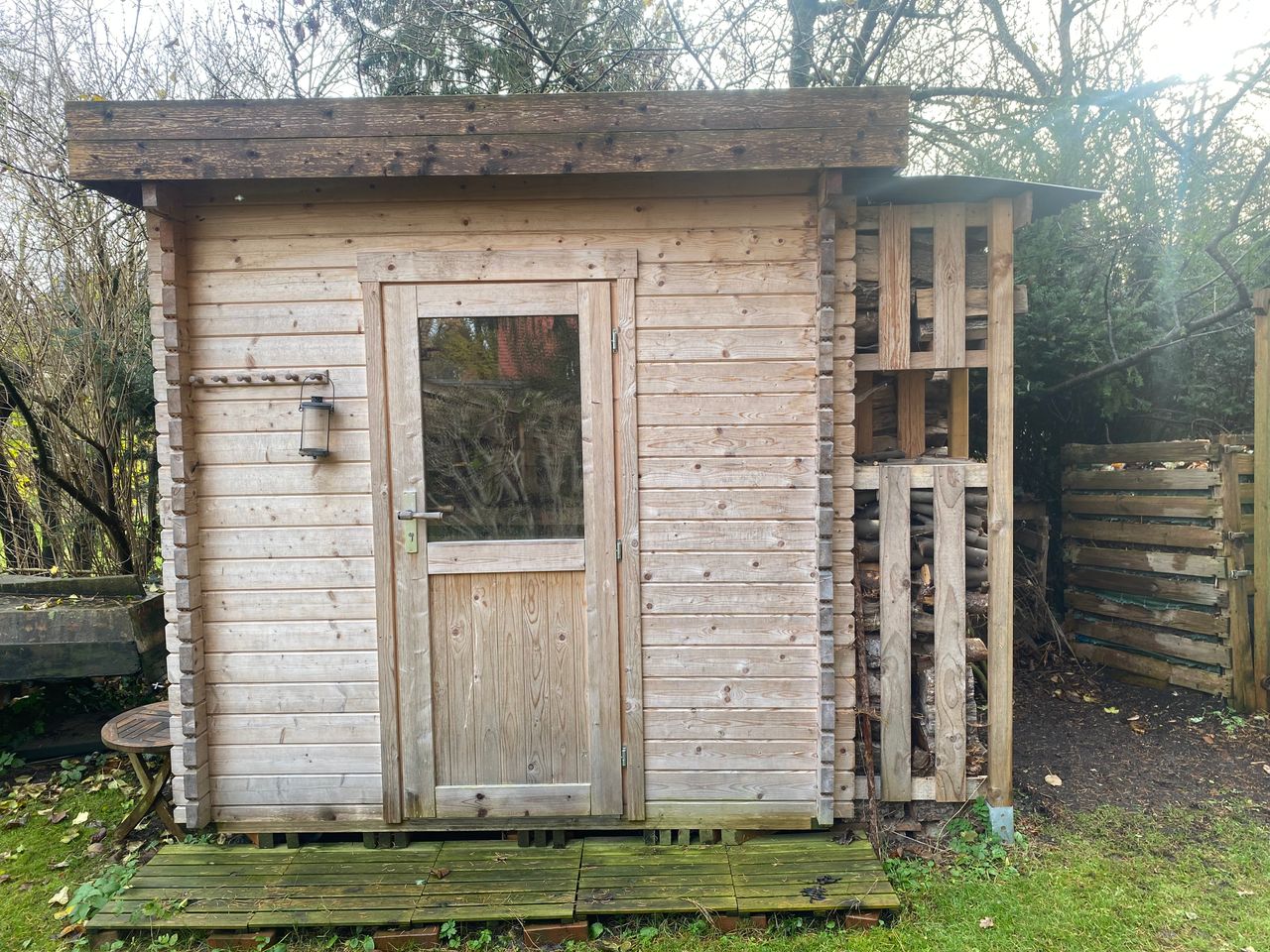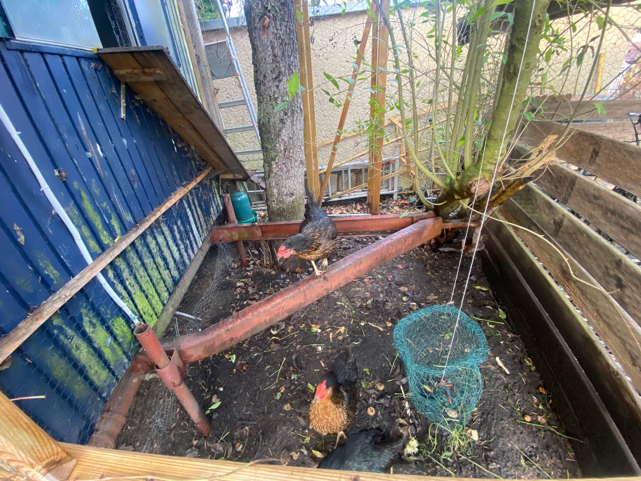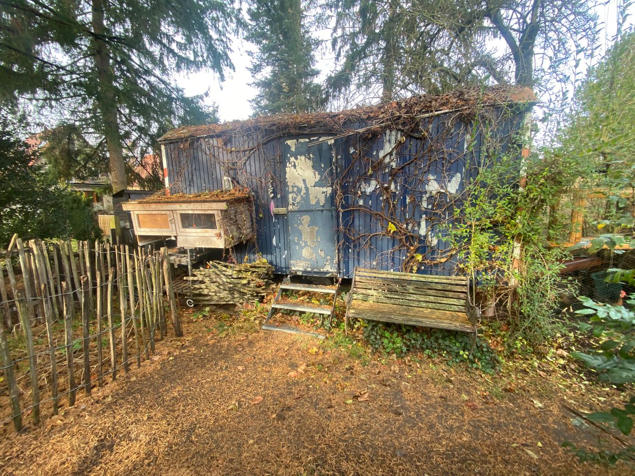 Im Garten steht ein Saunahaus, ein blauer Bauwagen als Schuppen und Hühnerstall mit drei Hühnern.