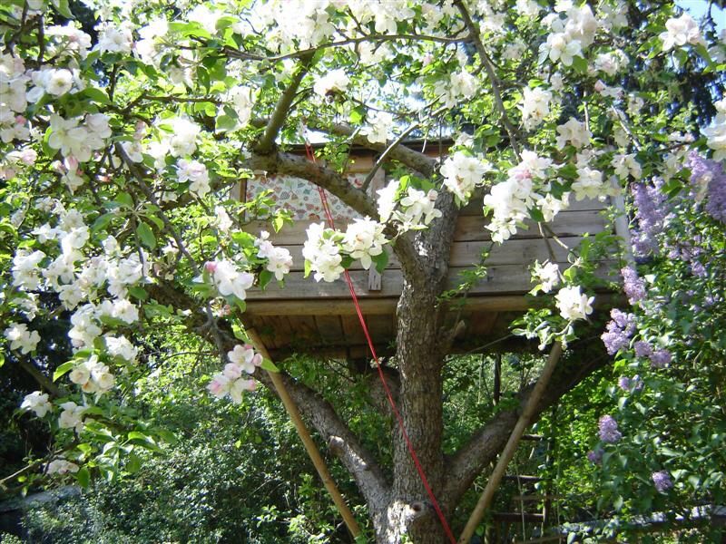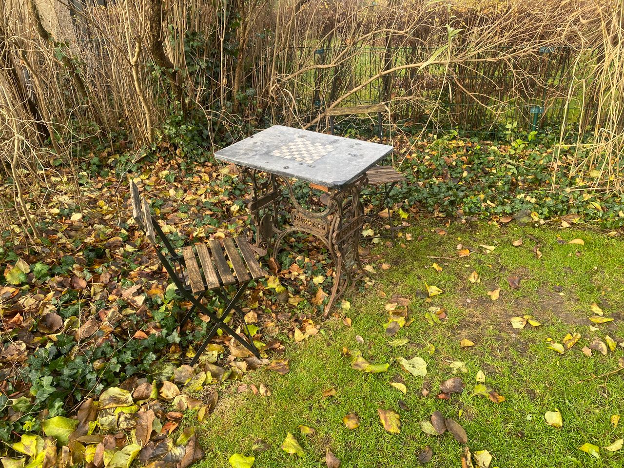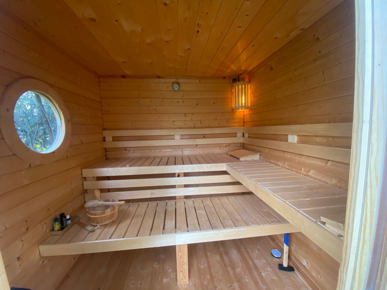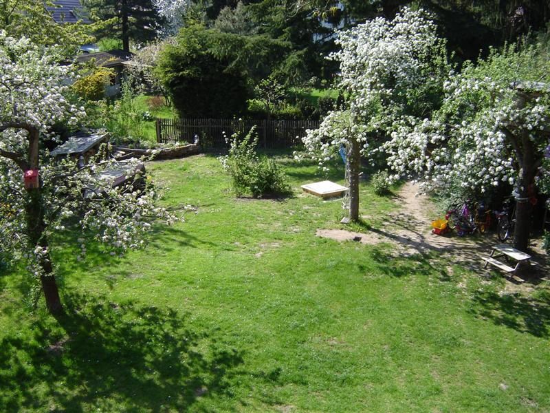 Im Garten steht ein Saunahaus, ein blauer Bauwagen als Schuppen und Hühnerstall mit drei Hühnern.