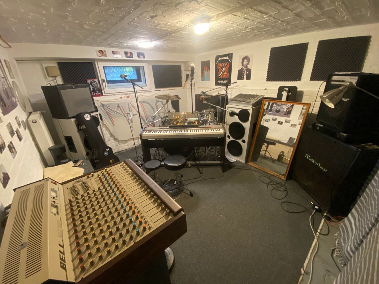 Im Keller befindet sich ein Bandkeller mit Schlagzeug, E-Guitarren und entsprechendem Equipment.