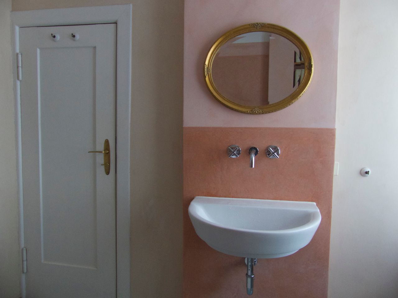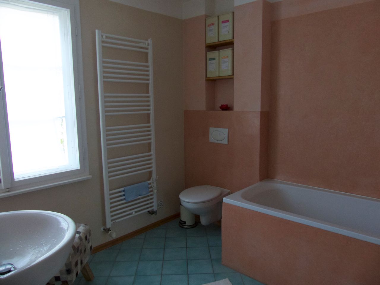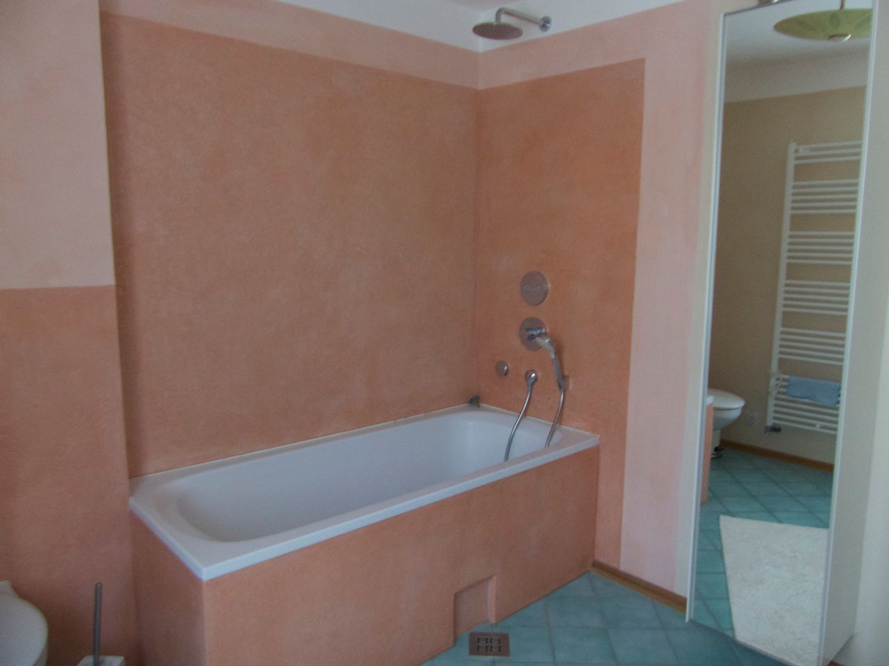 In der unteren Etage außer Küche, Wohnzimmer und Esszimmer befindet sich noch das Badezimmer mit Badewanne, Dusche und WC.