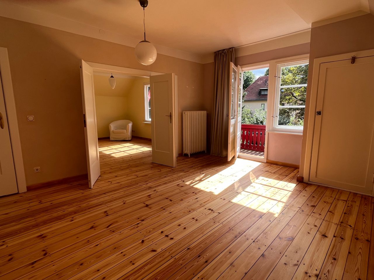 In der oberen Etage befinden sich vier abgeschlossene Räume und ein Gäste WC. Ein Südbalkon erstreckt sich über die ganze Südseite des Hauses.
