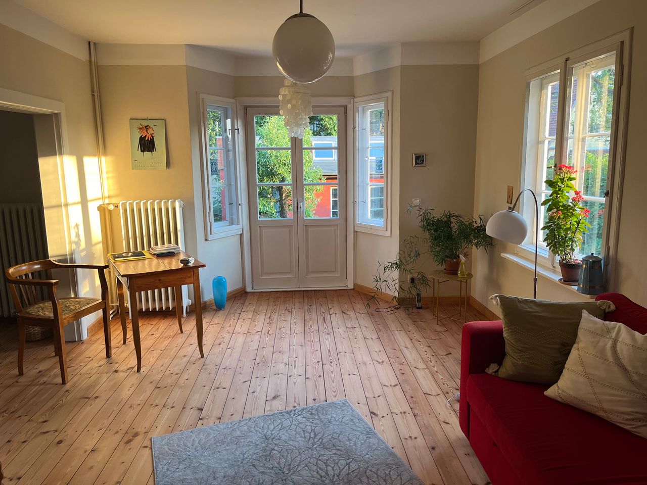 Die Küche in der Hochparterre ist direkt verbunden mit dem Esszimmer und dem Wohnzimmer. Die ganze Etage ist tagsüber voller Sonnenlicht. Vom Wohnzimmer und Esszimmer durch mehrere Fenster und die Gartentür wird ein weiter Blick in den Garten mit den alten Bäumen gewährt. Direkt von dem Wohnzimmer mit Kamin gelangt man in den 777 Quadratmeter großen Garten.