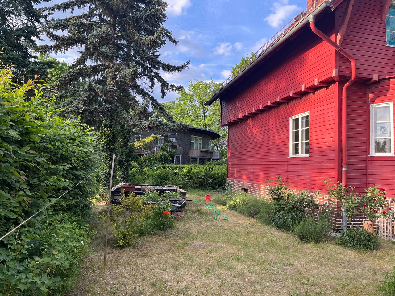 Das Haus befindet sich in Babelsberg in einer fantastischen Süd West Lage. Es erinnert an ein Märchenhaus und besitzt einen großen Charme an Gemütlichkeit umgeben von einem wildromantischen Garten. Es gibt alten Baumbestand: einen Apfelbaum, eine große alte Kastanie und mehrere Blautannen. In den letzten Jahren wurden zusätzlich mehrere Obstbäume gepflanzt. Für Hobbygärtner gibt es eine schöne angenehme Überraschung und zusätzlich ausreichend Rasenflächen zum Entspannen.