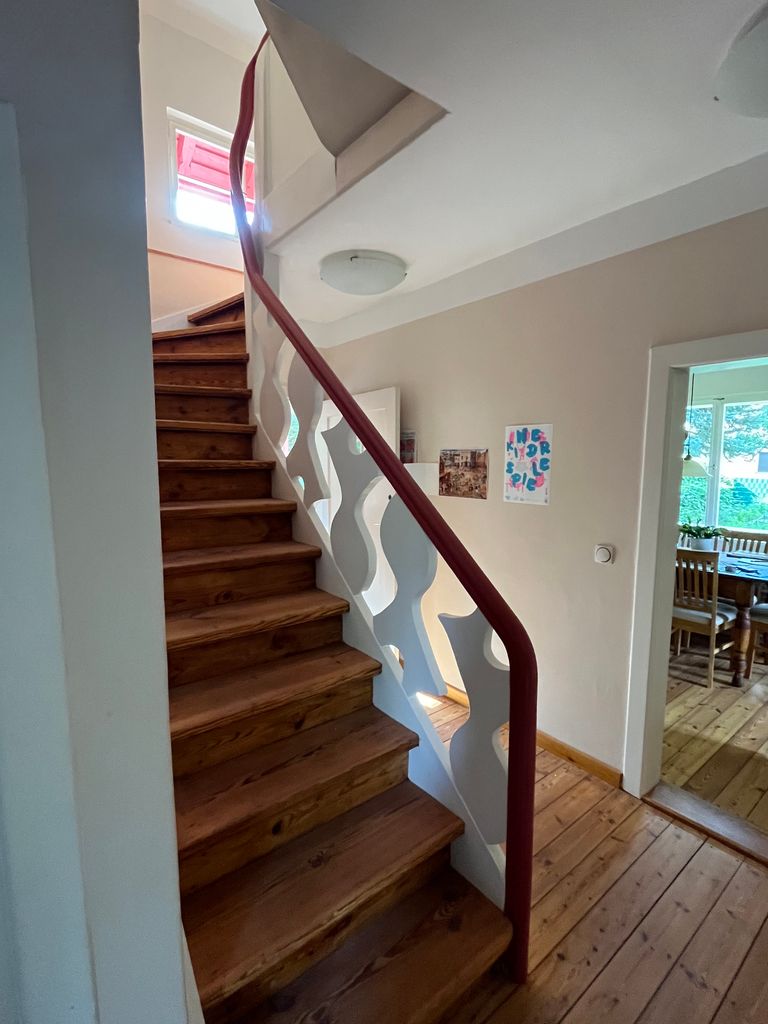 Für die besondere Harmonie und die romantische Atmosphäre in diesem zwei geschossigen Haus sorgen die extra stilgemachte Holztreppe, die Dielenfußböden und das ganztägige Sonnenlicht.