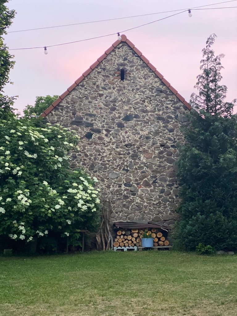 Altes Saal- und Gartenlokal und Wohnhaus in der Calauer Schweiz. Auf dem Grundstück befinden sich noch weitere Scheunen, alte Ställe und ein Gartenhaus. Das Gartenhaus steht auf einer Wiese mit Obstbäumen.