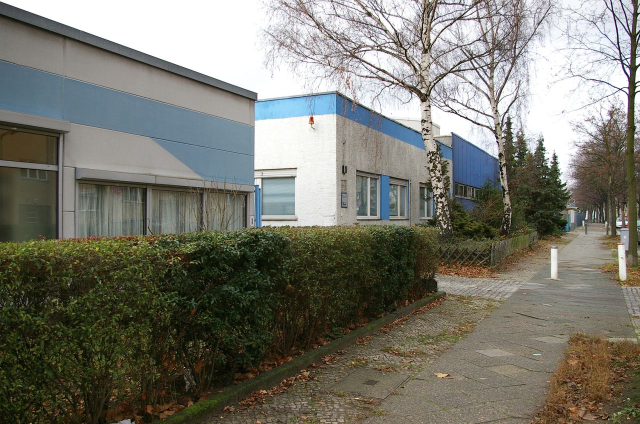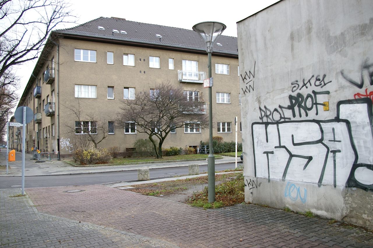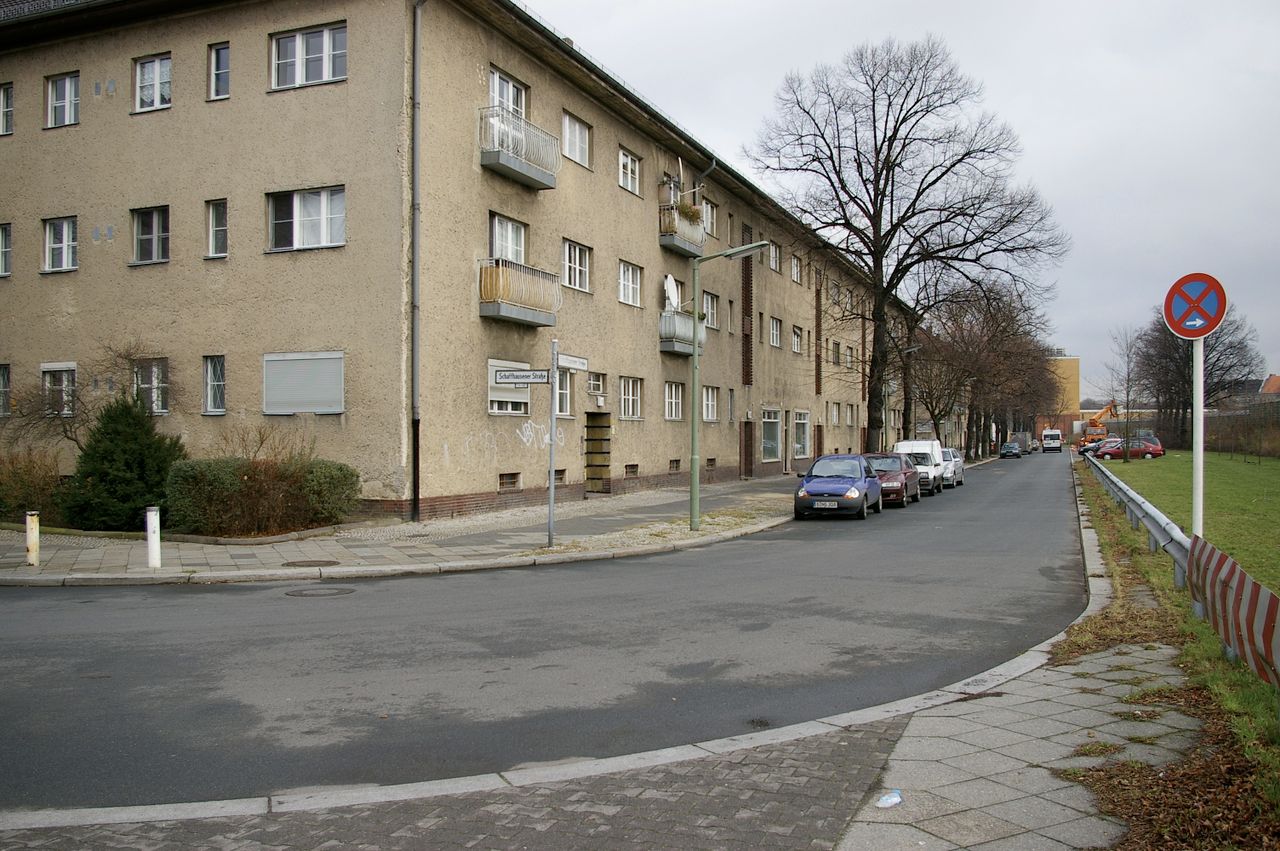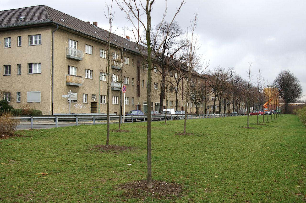 Wohnstraße in Berlin Tempelhof, direkt an der Autobahn mit tristen, kleinstädtisch anmutenden Wohnblöcken und Industriegebäuden.