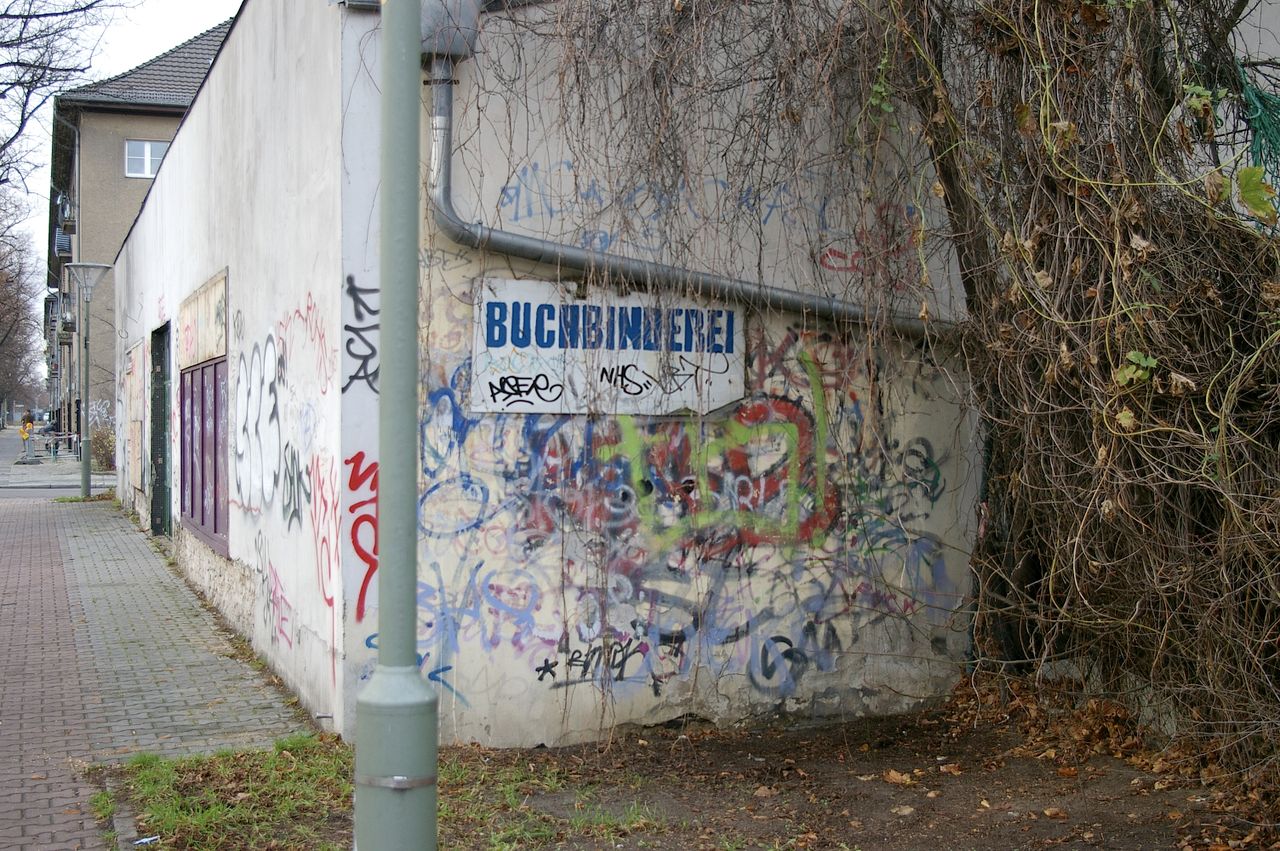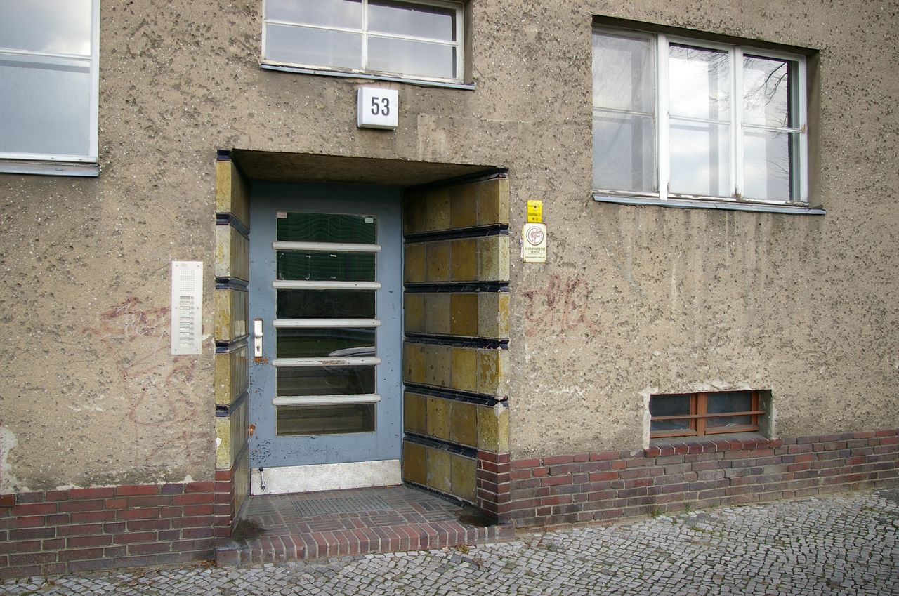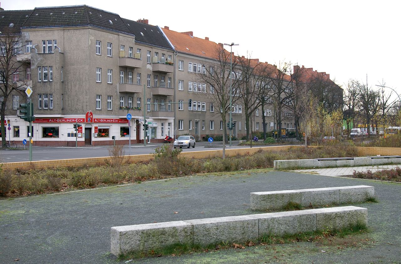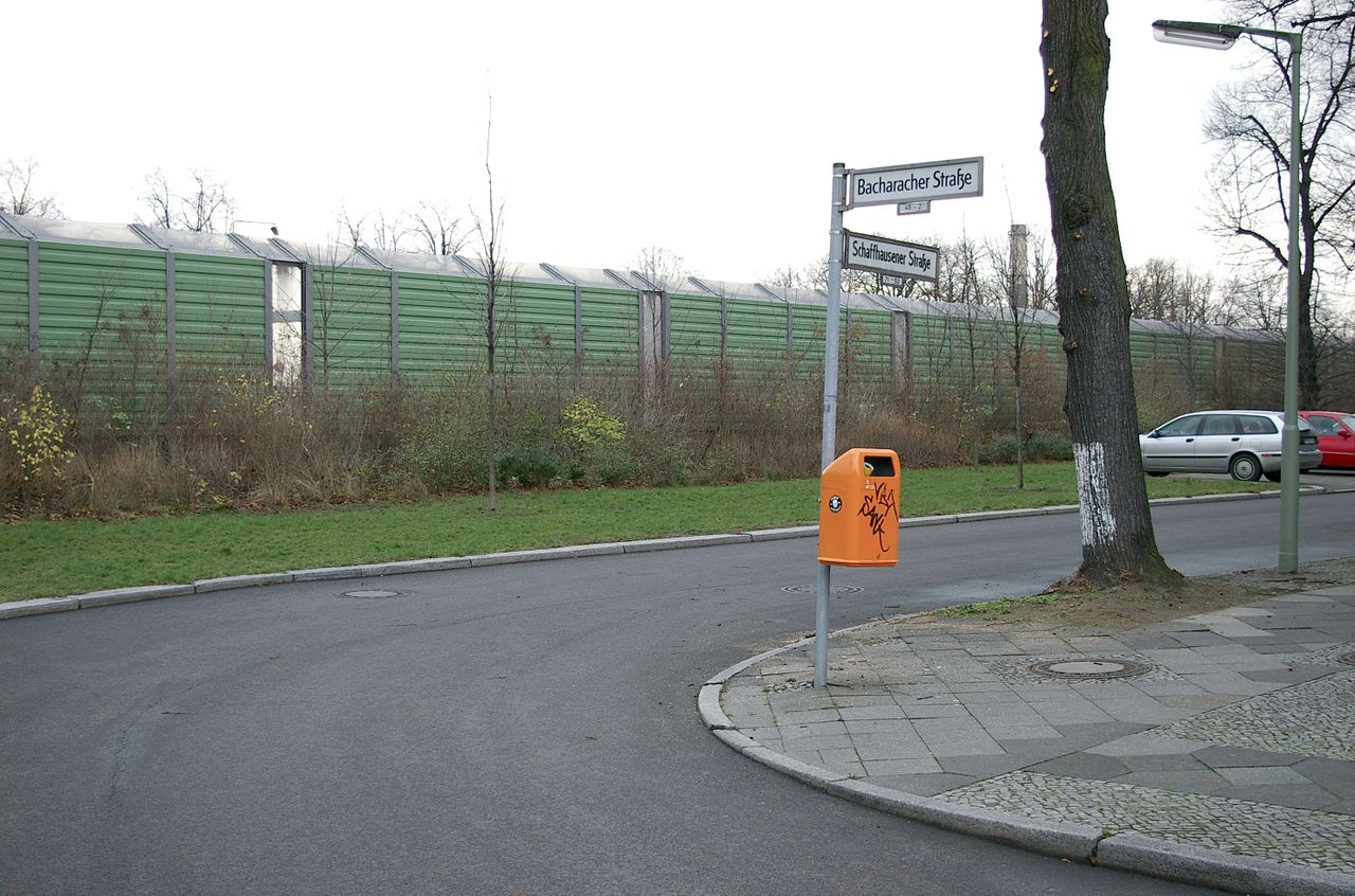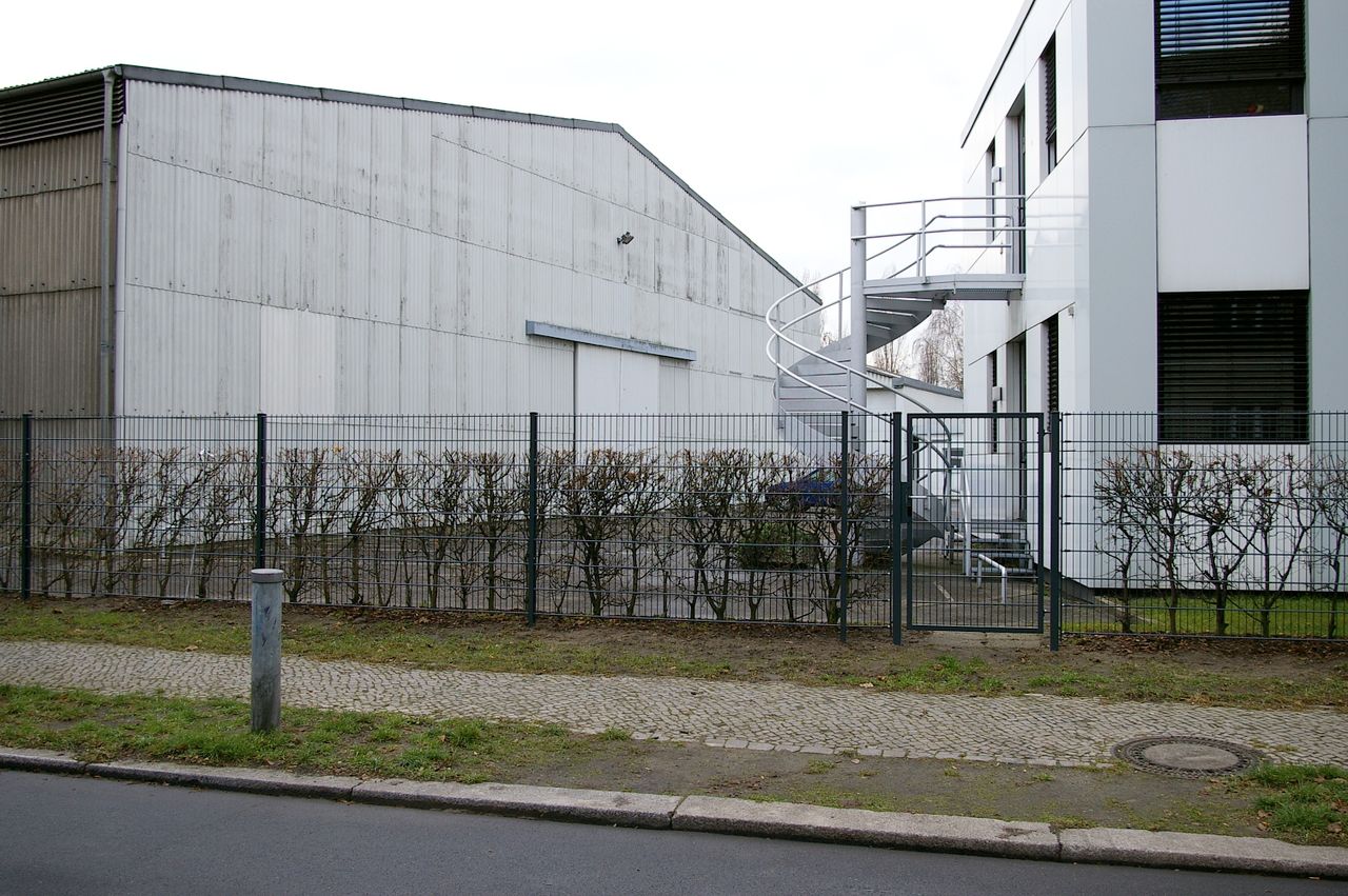 Wohnstraße in Berlin Tempelhof, direkt an der Autobahn mit tristen, kleinstädtisch anmutenden Wohnblöcken und Industriegebäuden.