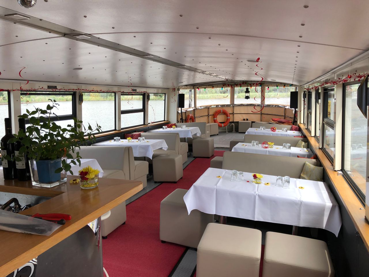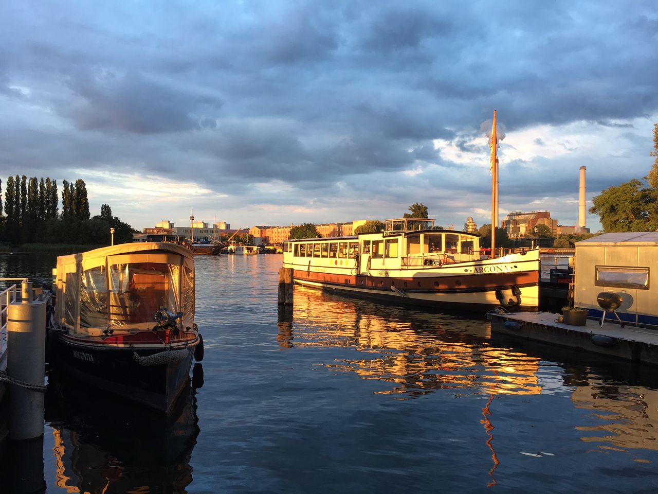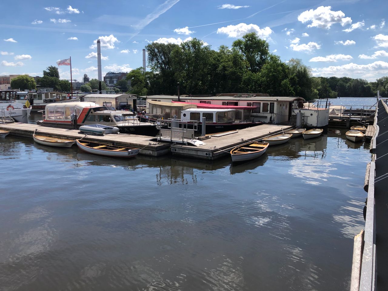 Hafenanlage an der Rummelsburger Bucht, Liegeplätze historischer Schiffe und Boote, altes Hausboot als Hafenmeisterei, Gastronomien auf den Schiffen vorhanden.