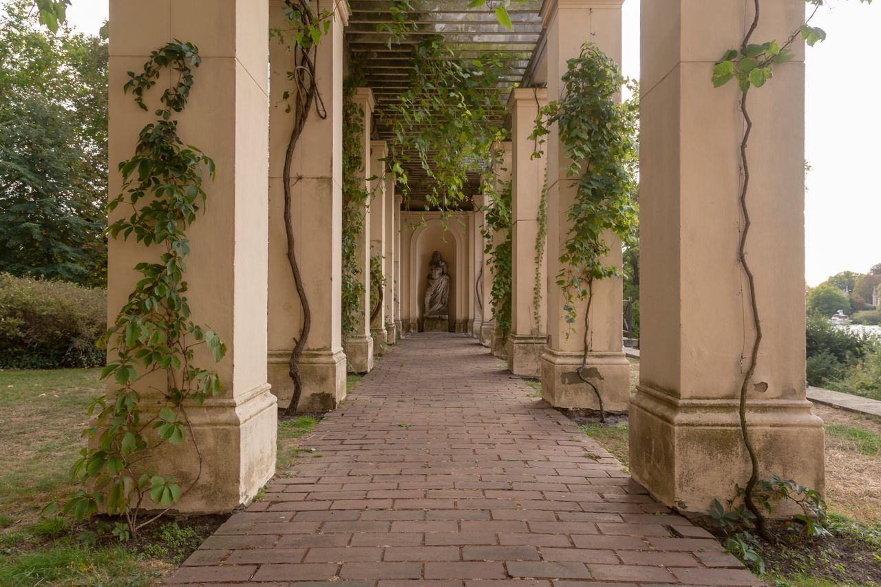 Zum Schloss gelangt man über einen mit Passionsblumen und Pfeifenwinde berankten Laubengang, dessen Wände zahlreiche Marmorfragmente von antiken Skulpturen und Sarkophagen schmücken.