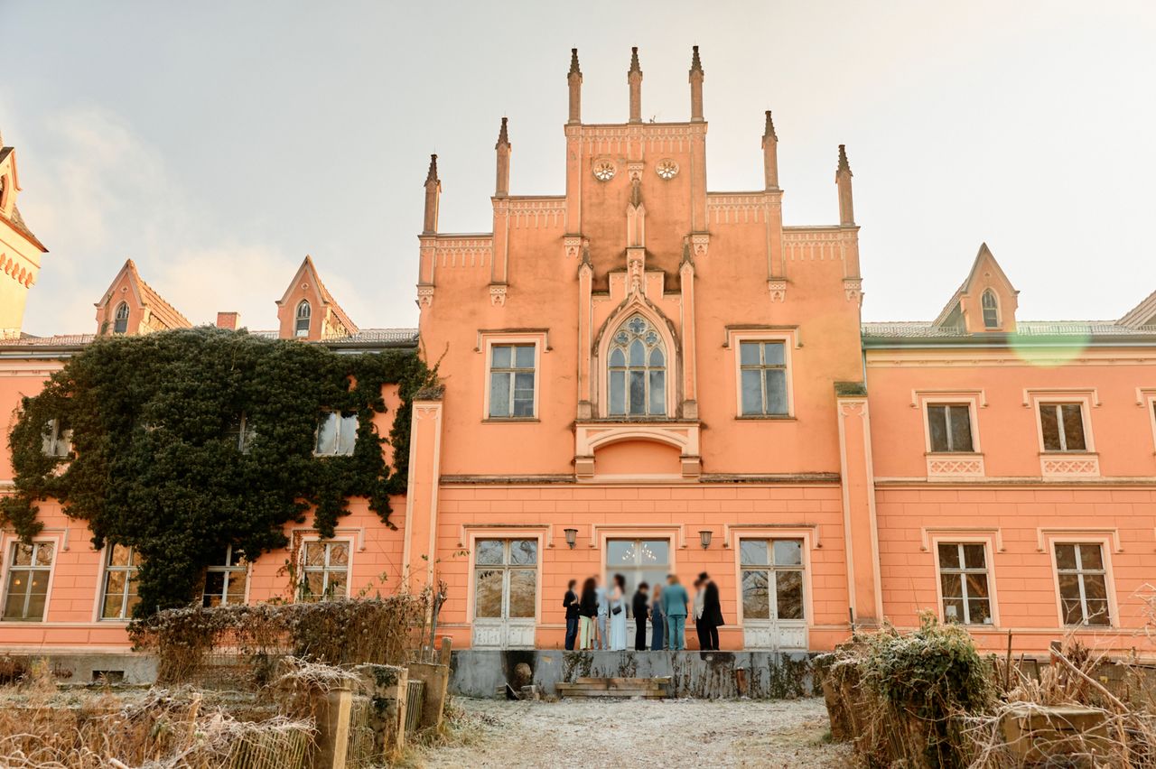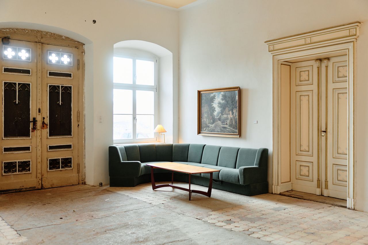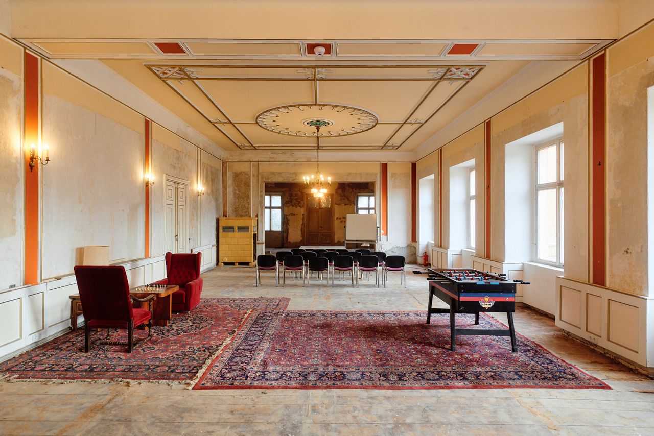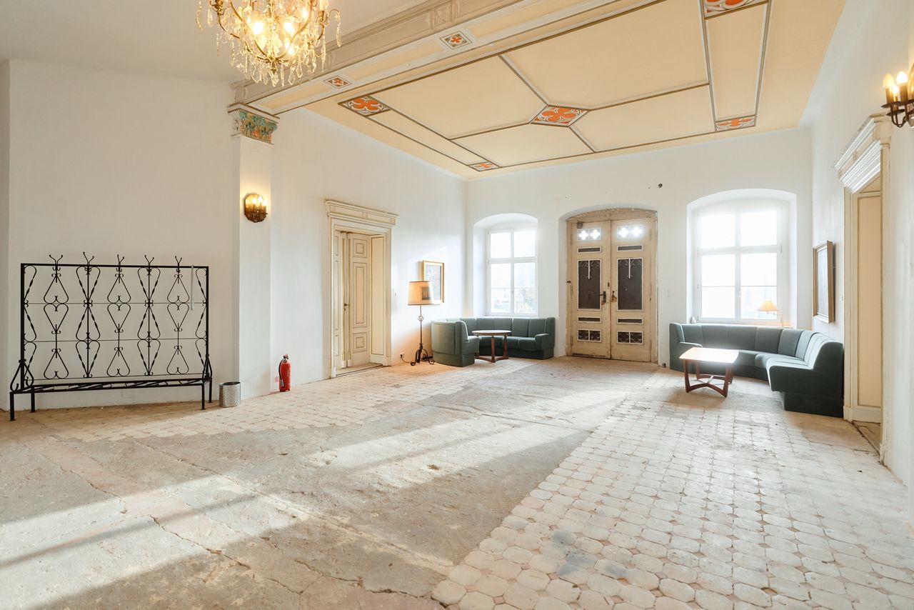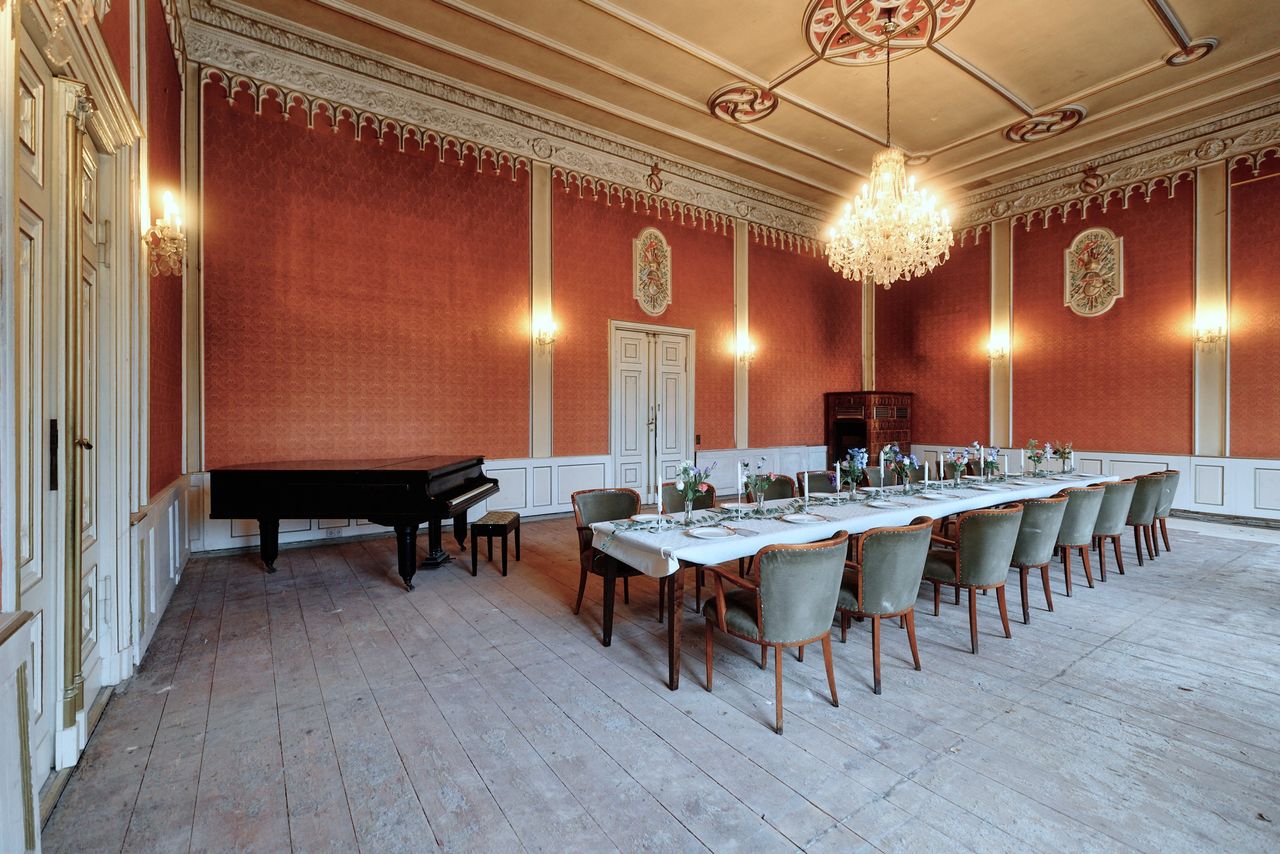 Denkmalgeschütztes Schloss mit wechselvoller Geschichte. Eng verbunden mit dem preußischen Adel, ideal für Drehs über einen längeren Zeitraum und unter "isolierten" Bedingungen. 2 große Säle mit Weitblick in den zugehörigen, sehr großen, privaten Park (300.000 m²).