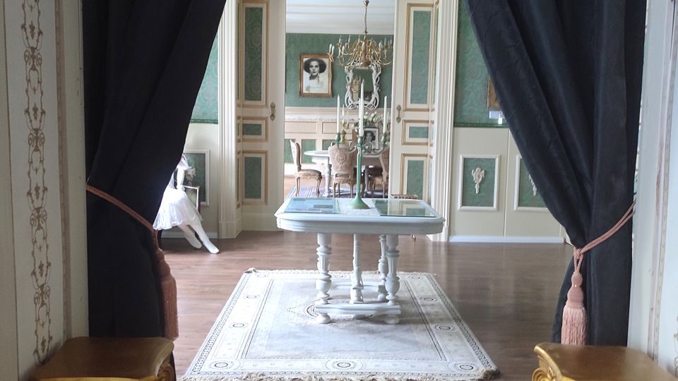 Der großzügige Eingangsbereich mit einem imposanten Kamin führt in einen langen Flur mit Galerieebene, ausgestattet mit Parkettböden und roten Stoffbahnen – eine atemberaubende Kulisse für jede Szene. Der Grüne Salon, ebenfalls mit Parkettböden und eleganten Deckenstuckelementen, bietet durch seine grüne Tapete in Stoffoptik ein ganz besonderes Flair.
